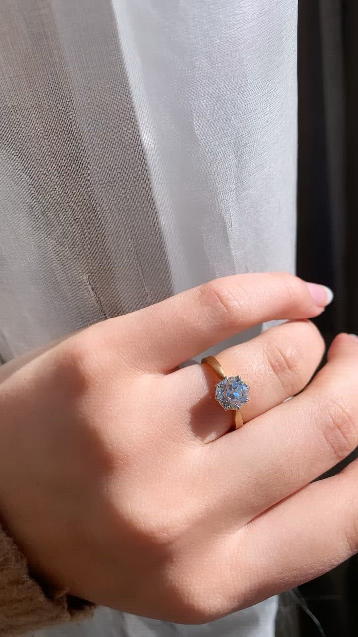 The Brooklyn 1.71 ring is a vintage-inspired VB-made diamond engagement ring made here in NYC centering an authentically antique diamond. The ring centers a GIA certified 1.71-carat old mine cut diamond of H color, VS2 clarity. The stone is set in an 8-prong platinum basket with an 18kt yellow gold tapered band. The ring is currently size 5.5 and can be resized!