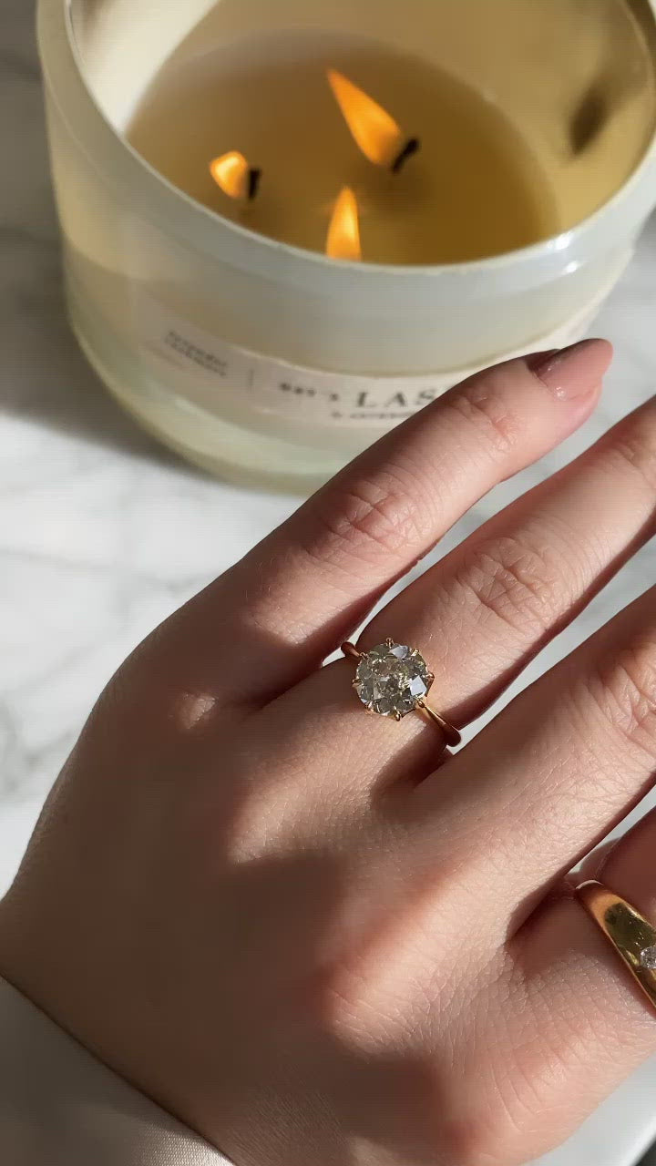 The Jen 2.23 ring is a VB original design made right here in NYC centering an authentically antique diamond! The ring centers a GIA certified 2.23-carat old European cut diamond of K color, VS2 clarity. The stone is set in an 8-prong 18 karat yellow gold setting with a slightly tapered shank. The ring is currently size 5.75 and can be resized!