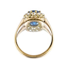 This gorgeous antique piece has lots of chunk and charm. A beautifully hued sapphire surrounded by diamonds makes for a big look that still sits close to the hand.