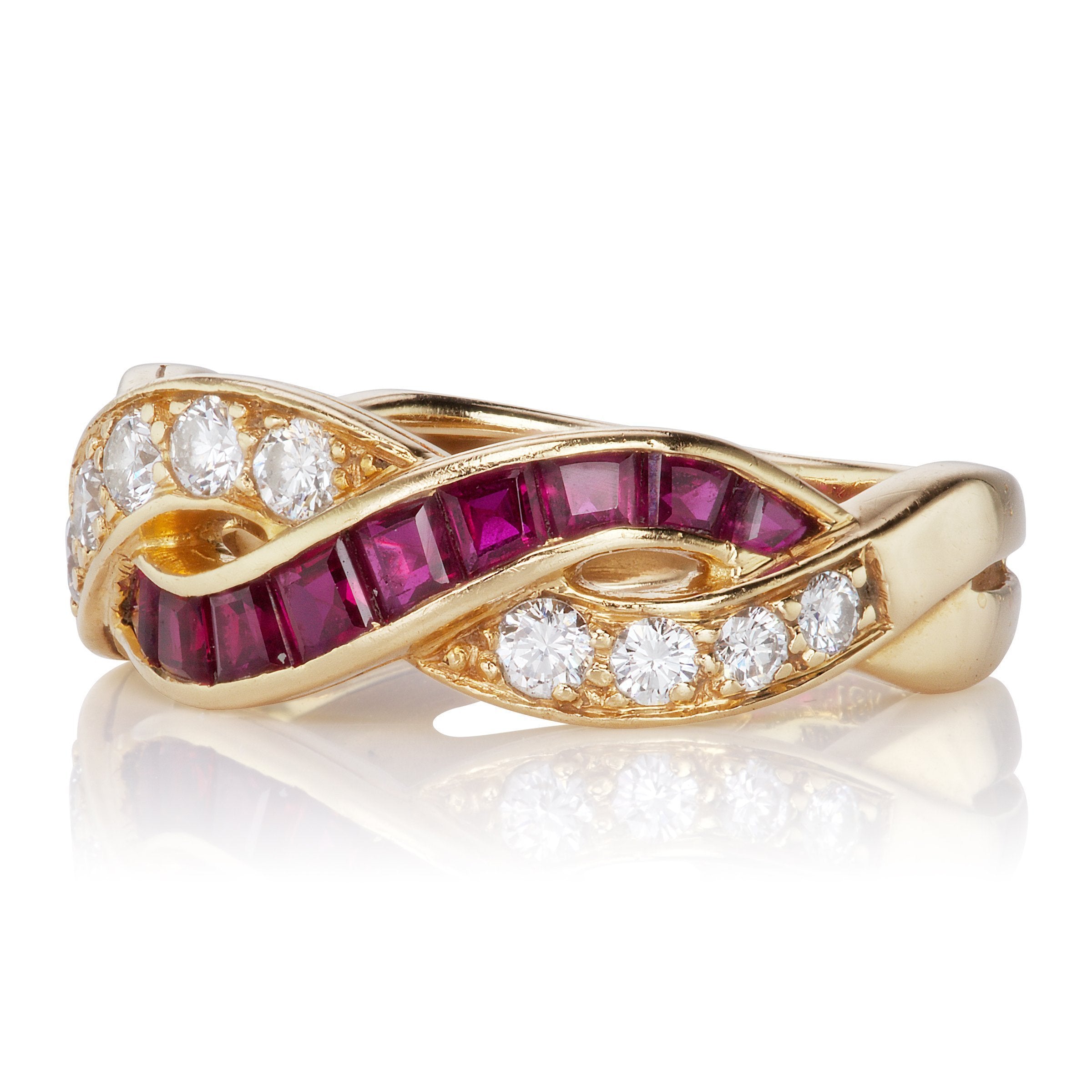 The Bree ring is Vintage Tiffany & Co. band circa 1980! This diamond and ruby double helix engagement ring features two woven strands of 12 diamonds and 14 rubies set in an 18kt yellow gold ring! The ring is a size 5.5 and can be resized to some sizes!