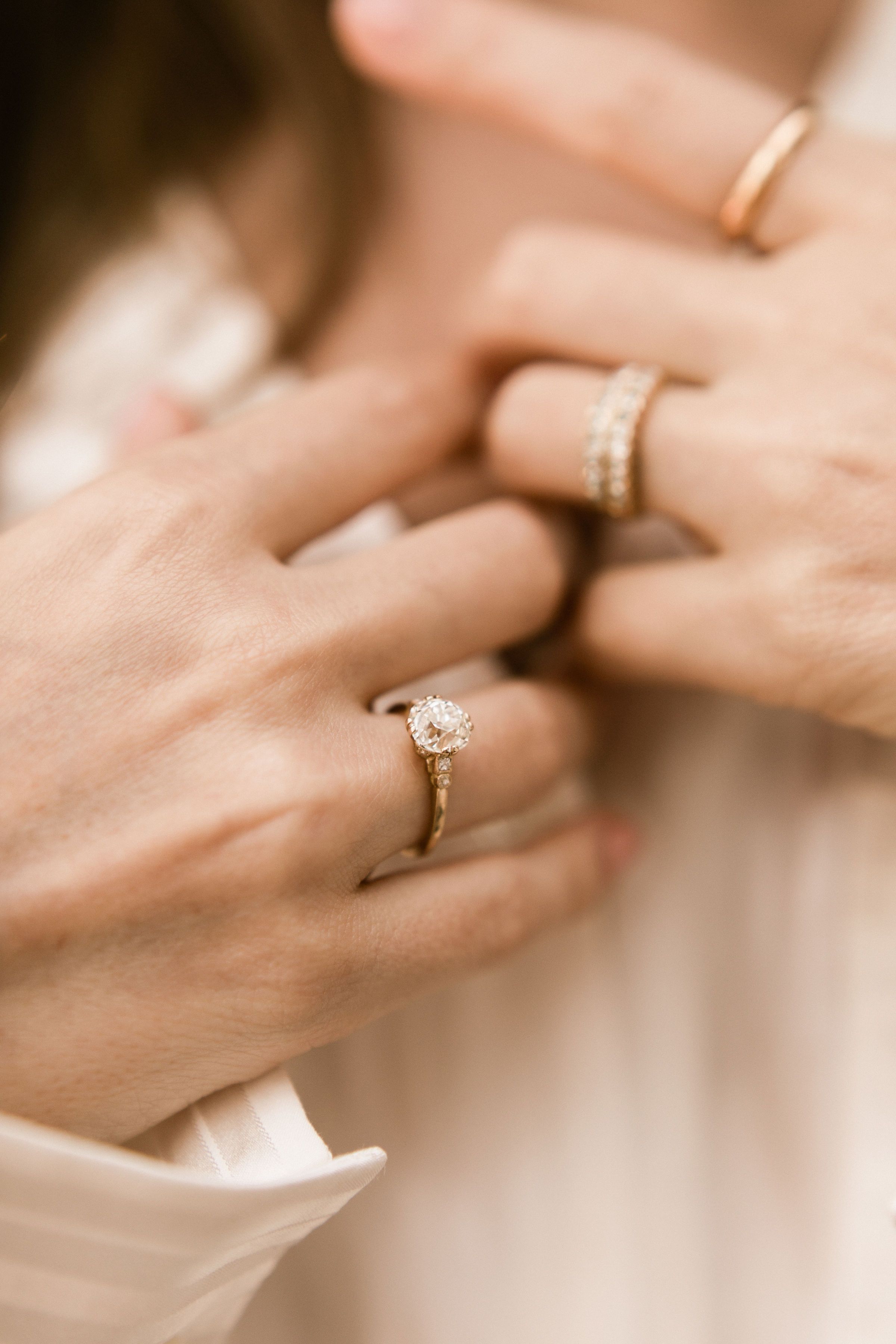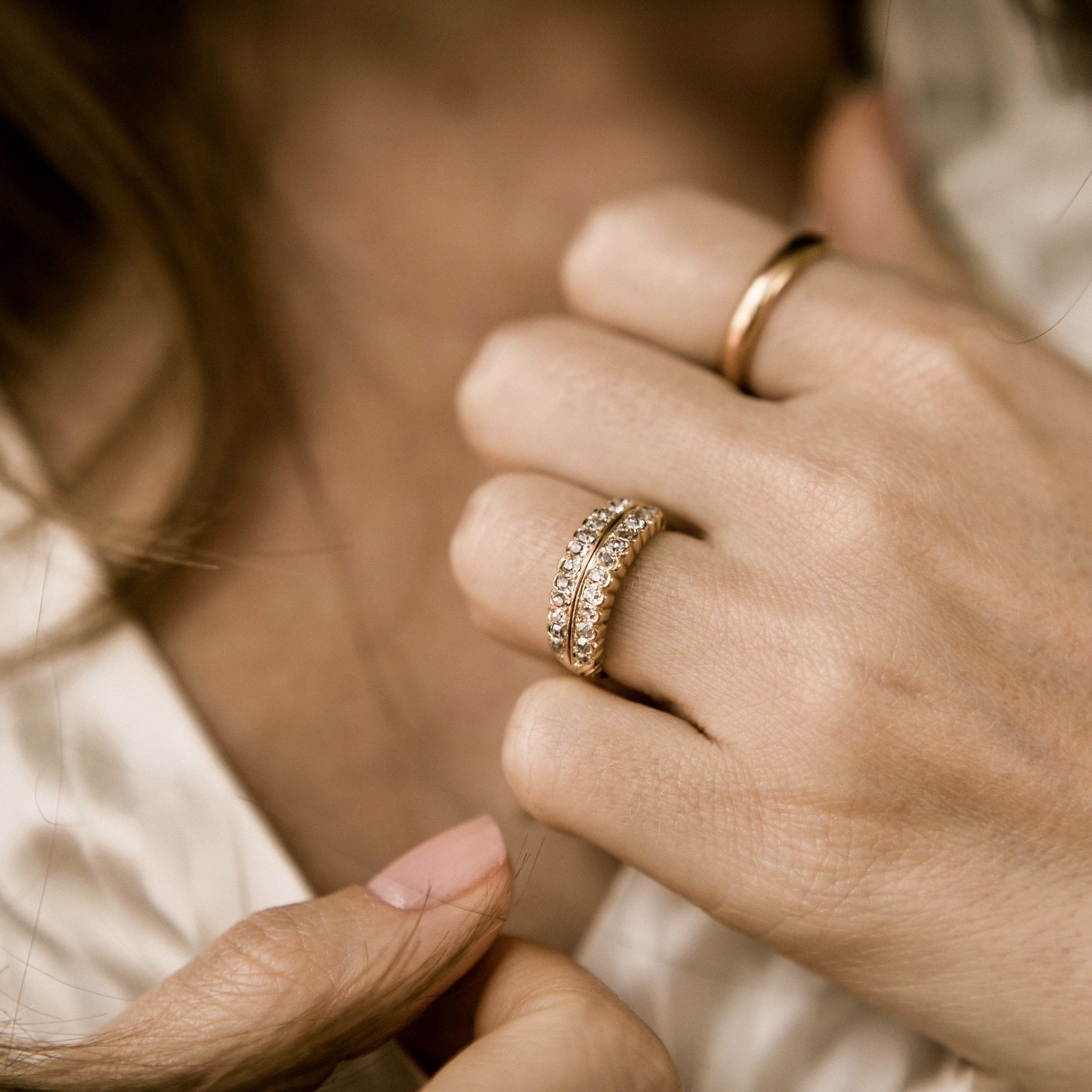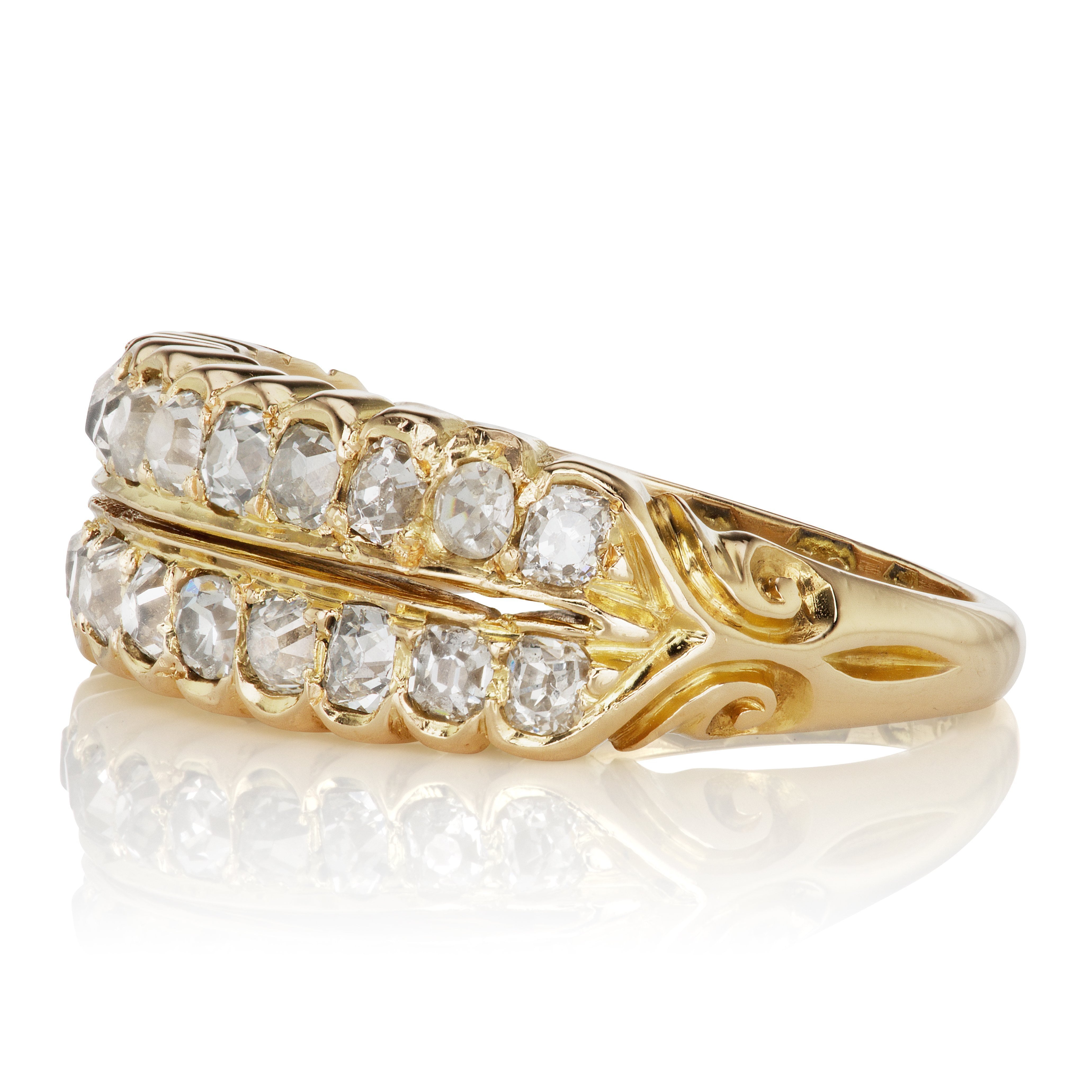 The Jan ring is a Victorian double row diamond wedding band circa 1890! This gorgeous find features a double row of old mine cut diamonds (24 in total) that are set in 18kt yellow gold with scrolling shoulders. The total carat weight is approximately 0.80 carats. The ring is size 5.25 and can be resized!