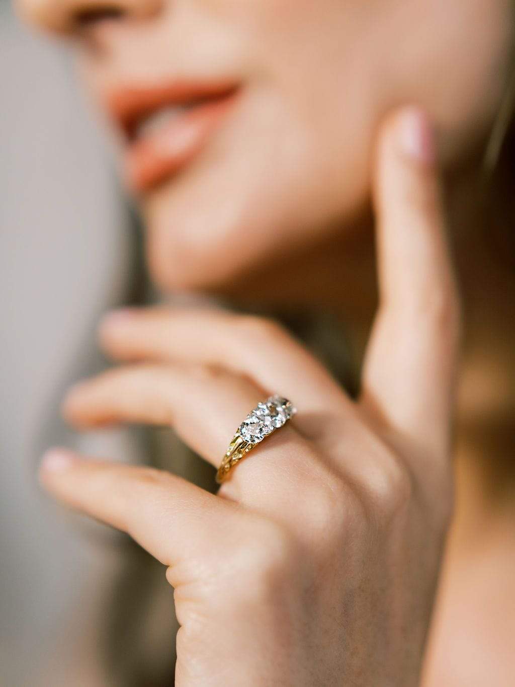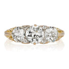 The Lolita ring is a vintage diamond engagement ring from the Early Edwardian Era. The ring centers a GIA certified 0.82-carat old European cut diamond of J color, SI2 clarity. The stone is set in an 18kt yellow gold setting. An old European cut diamond is set on each side of the center stone with a total of 4 old European cut diamonds set in between. The two side diamonds are approximately are 0.50 carats each. The gallery and the shoulders of the ring have beautifully carved details. The ring is currently size 7 and can be resized!