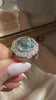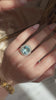 Exquisite Edwardian themes are displayed in the Yarmina ring. The very large aquamarine center stone glows from within and is encircled by bright and chunky little antique diamonds with a scalloped border. We love her old world grandeur and shimmering stones.