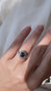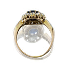 A rich, navy-toned sapphire sits at the center of this Edwardian Era treasure. A classic sapphire cluster, reminiscent of Princess Diana's famous ring, this piece is a romantic and timeless choice as an engagement ring, or makes for a beautiful gemstone addition to your fine jewelry collection.