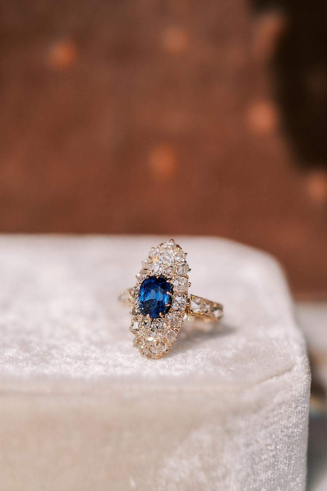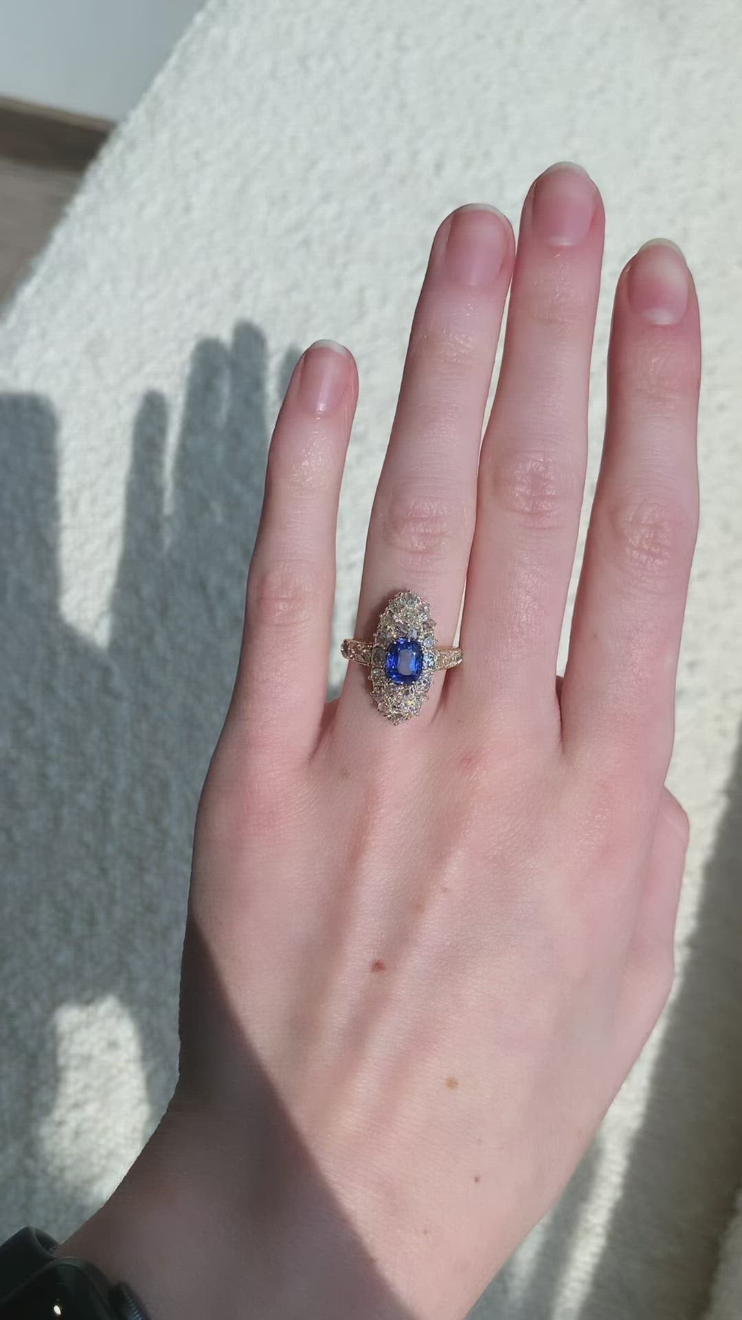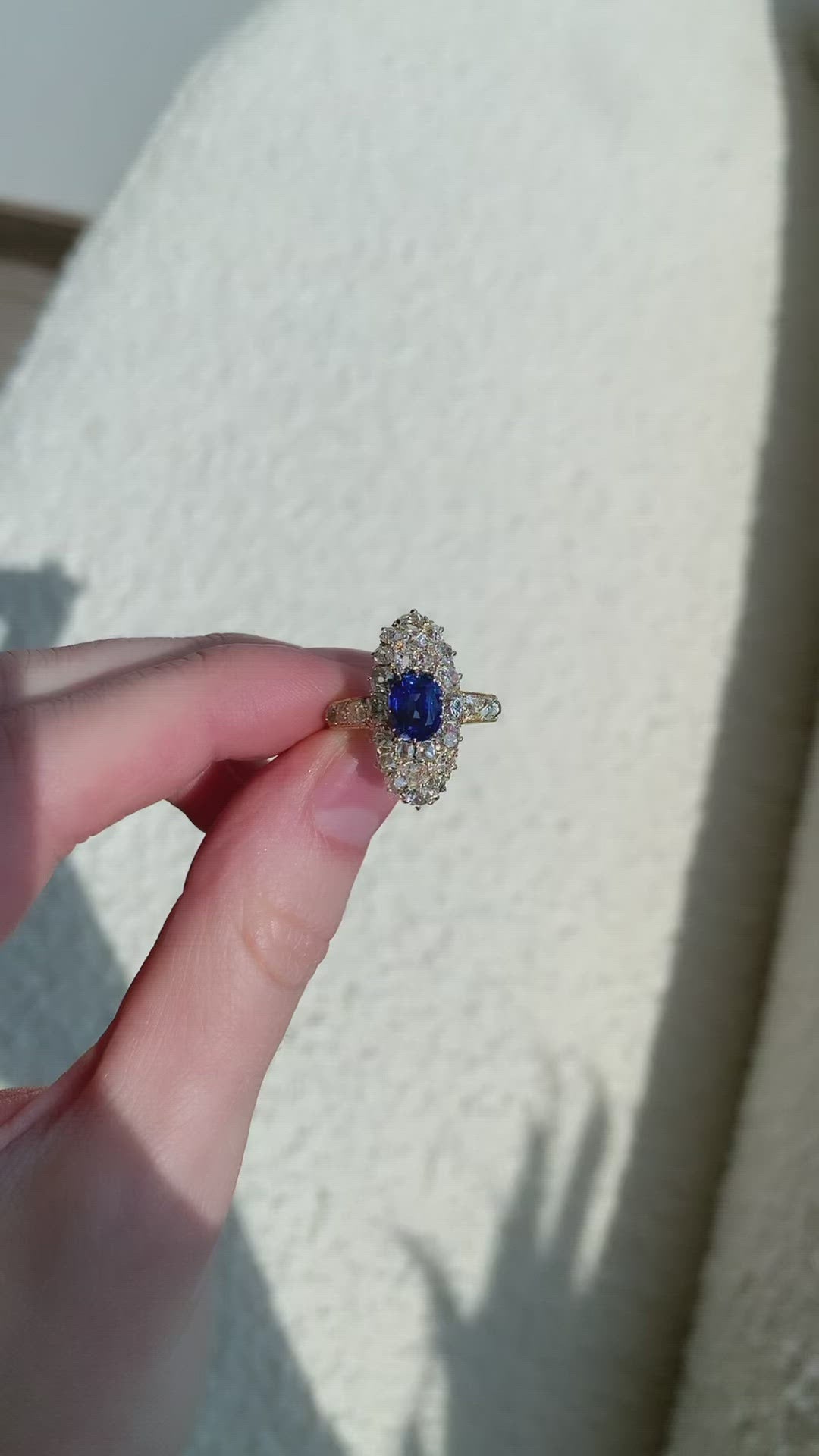 This beautifully hued sapphire brings a perfect pop of color to this gorgeous antique ring. This authentic ring has this elegant, elongated shape with the most adorable antique diamonds.