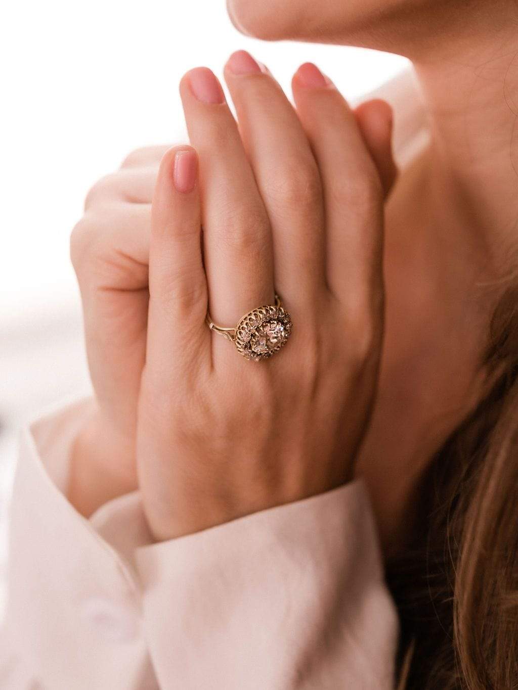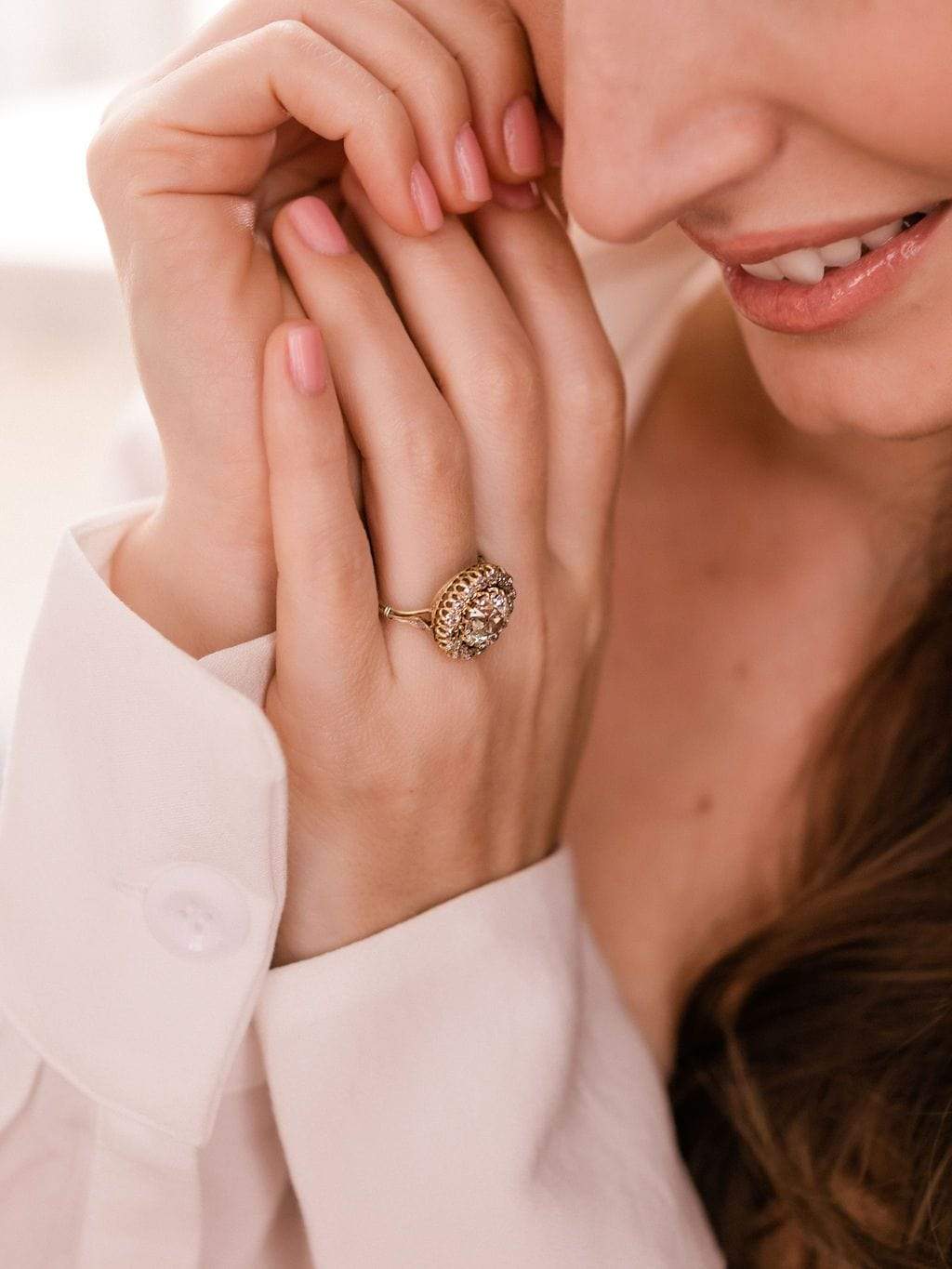 Definitely not for the faint of heart. A big, gorgeous cluster that makes a statement but is softened by the delicate details such as the flowing shoulders and engravings to the gallery.