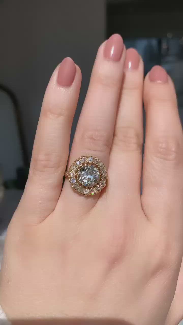 The Manny ring is an authentic vintage ring from the Edwardian era! The ring centers a GIA certified 2.98 carat old European cut diamond of N color, SI1 clarity. A halo of sixteen old European cut diamonds surrounds the center stone combining for approximately 0.70 carats. A small rose cut diamond is set into the split shoulders for a beautiful floral feel. The ring is currently 7.5 and can be resized!