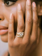 We love this bold, chunky, golden beauty. The center stone is a vivid white against the gold in this unique antique piece.