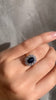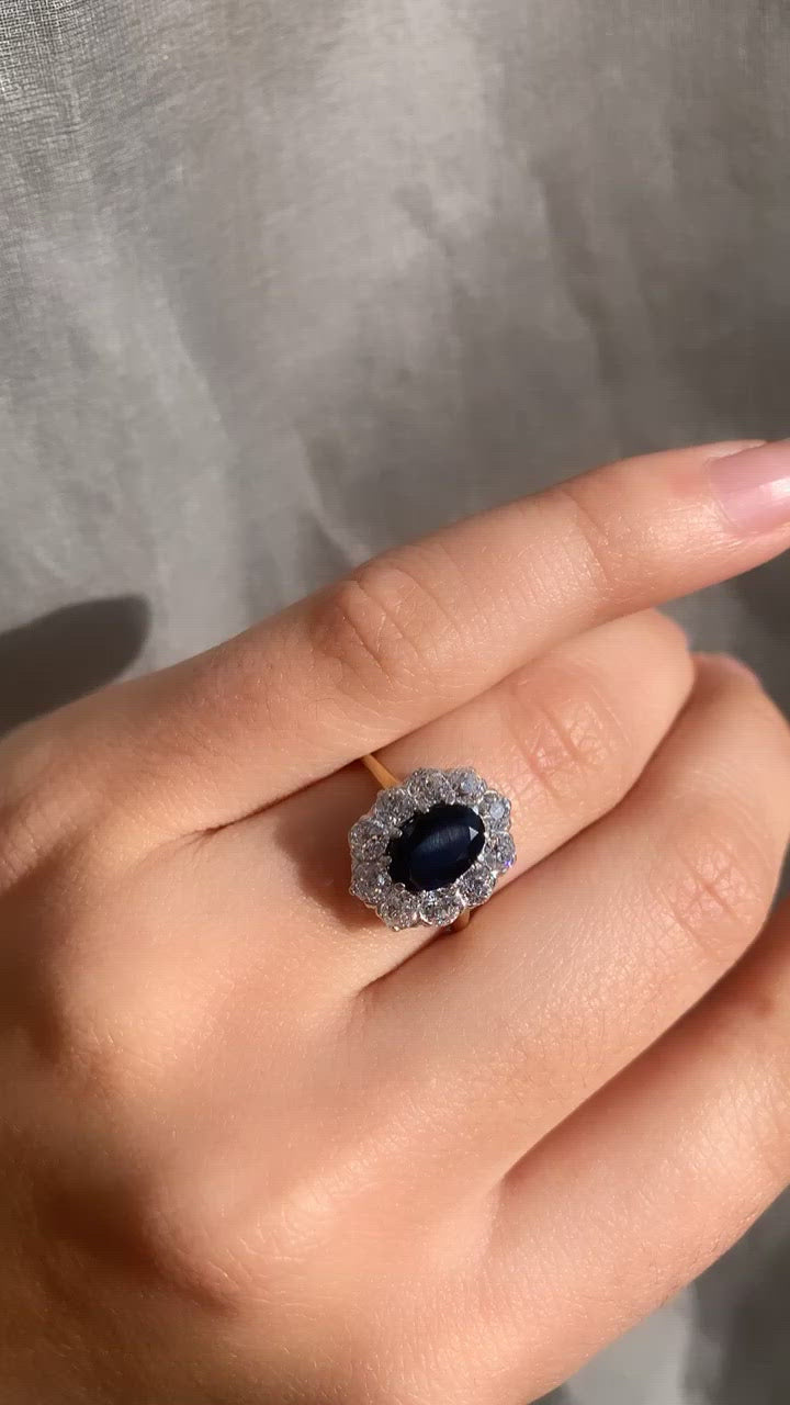 We love the dark tones of this lovely sapphire paired with the vibrancy of the bright old European cut diamonds. The oval shape is one we are always on the hunt for, for that elongated elegance!