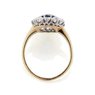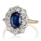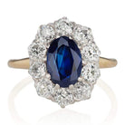 The Luella ring is a vintage Sapphire and diamond engagement ring from the Edwardian Era circa 1910. The ring centers a No-Heat Thai oval cut sapphire. The stone is set in a platinum setting with a halo of 10 old European cut diamonds around, all combining for approximately 1.20 carats of I-J color, VS-SI clarity. The band of the ring is 18kt yellow gold. The ring is currently size 6.75 and can be resized!