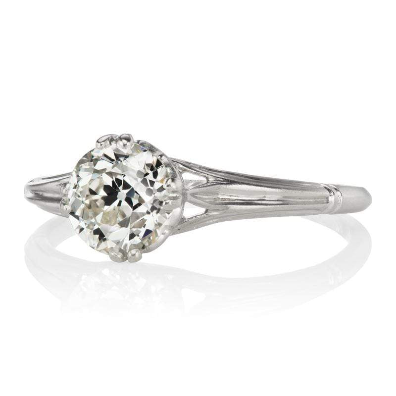 The Eloise ring is a vintage diamond engagement ring from the Edwardian era circa 1912. The ring centers a GIA certified 0.92-carat old European cut diamond of I color, VS2 clarity. The stone is set in a 4 double prong platinum setting with gorgeous Fleur-de-lys details. The inside of the shank has the original inscription that reads, "R.L.H to L.M. Aug 8 1912". The ring is currently size 5.5 and can be resized!