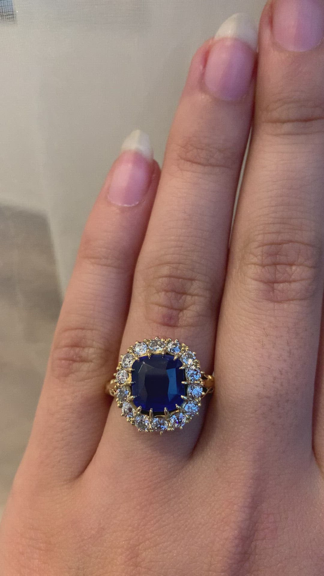 The Maurice ring is a vintage ring from the Edwardian era, circa 1910. The ring centers a heated Ceylon cushion cut sapphire of approximately 3.5 carats. The sapphire is surrounded by a halo of 14 old European cut diamonds of approximately I-J color, VS-SI clarity and combine for approximately 0.70 carats. The stones are set in an 18kt yellow gold setting. The ring is currently size 7.25 and can be resized!