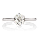 The Patty Ring is an authentic Edwardian solitaire engagement ring. The ring centers a GIA certified 0.88-carat old mine cut diamond of J color, VS1 clarity. The diamond is set in a 6-prong platinum setting with beautiful details to the gallery. The ring is currently size 5.75 and can be resized!