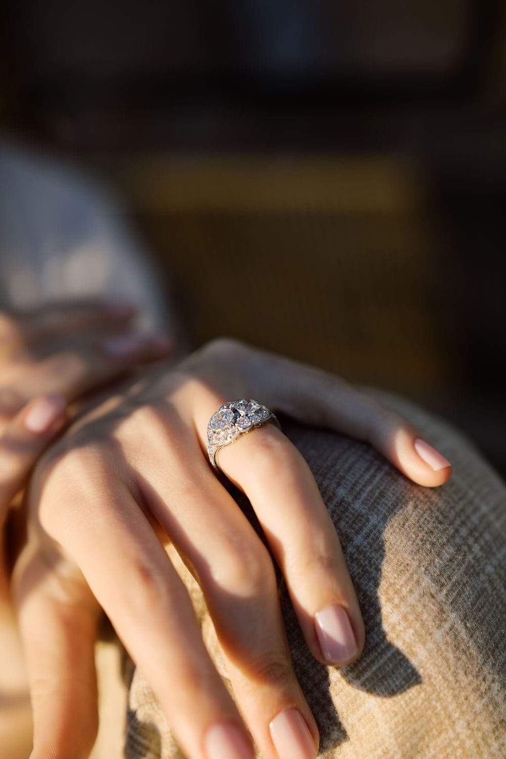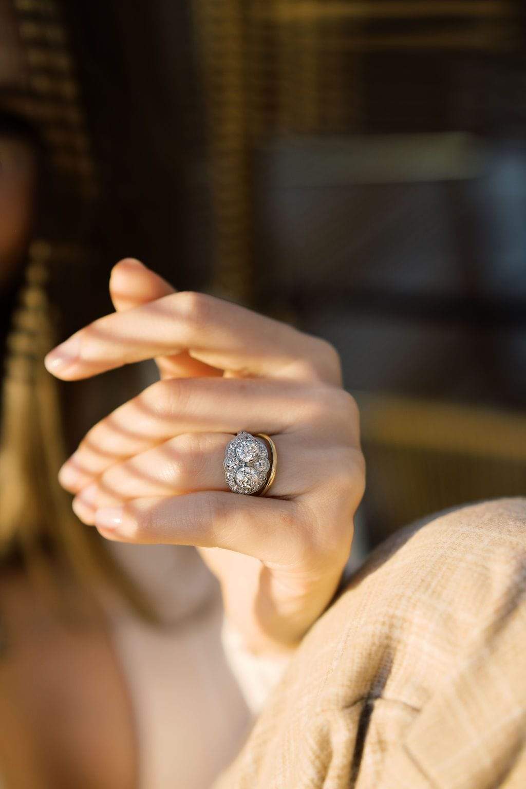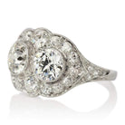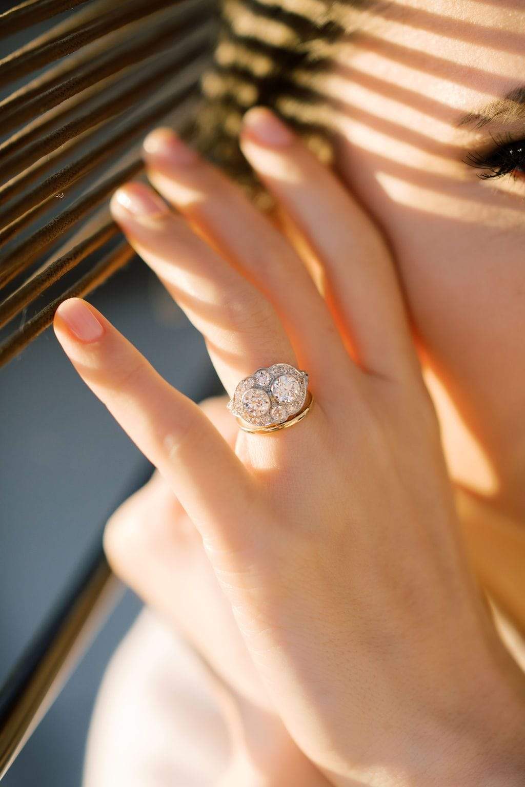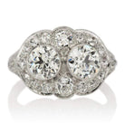 The Marianne ring is an authentic vintage Edwardian Toi et Moi engagement ring. The ring centers two old European cut diamonds: one being approximately 0.75 carats of I-J color, VS clarity the other approximately 0.80 carats of J-K clarity SI2 clarity. The stones are bezel-set into a platinum setting. Sixteen old European cut diamonds surround the two center diamonds with four old European cut diamonds are set into each of the shoulders. The ring is currently size 5 and can be resized!