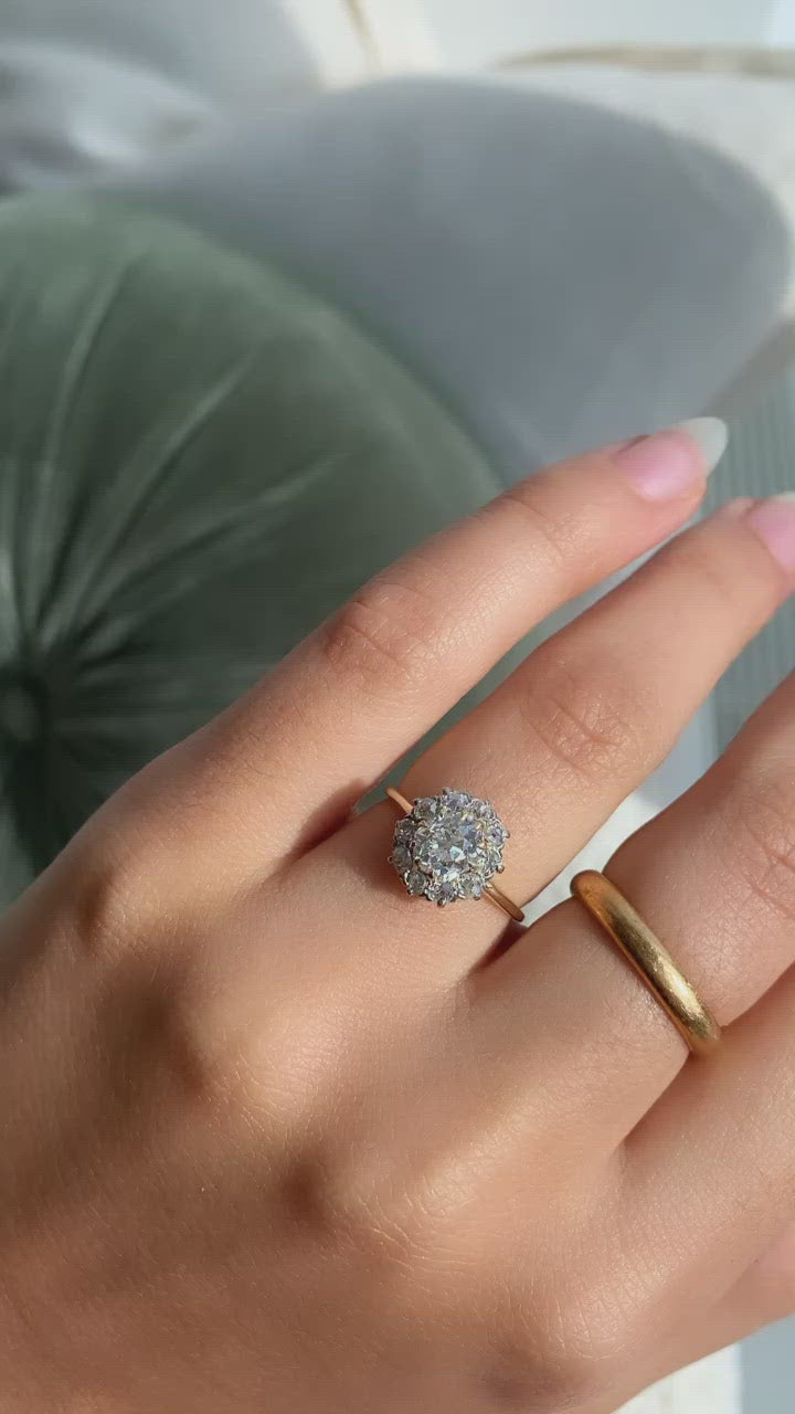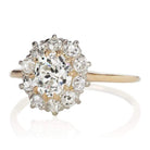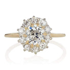 A classically beautiful cluster ring with all of the features we adore: old mine cut diamonds, a slightly elongated shape, and a gorgeous two-tone mix of platinum and gold!