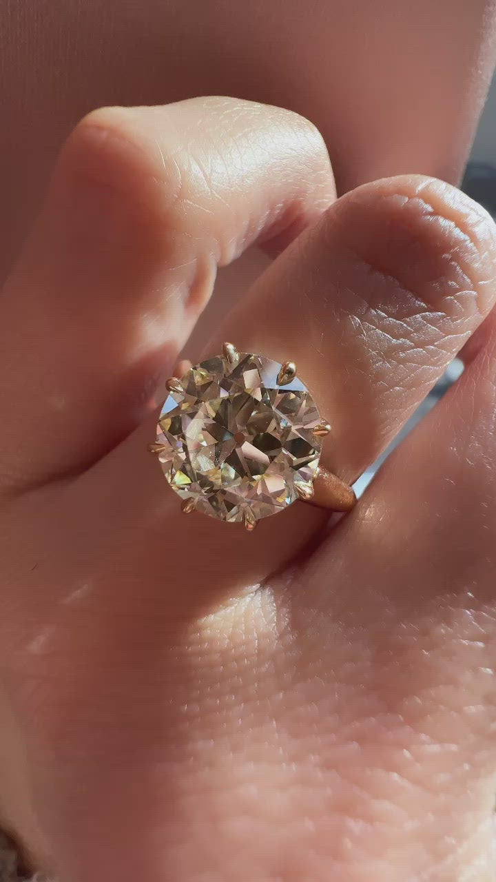 The Elma ring is an authentic vintage diamond ring. The ring centers a GIA-certified 4.08-carat transitional cut diamond of M color, VS1 clarity. The stone is set in an 8 prong 18 karat yellow gold setting. The ring is currently size 7 and can be resized!