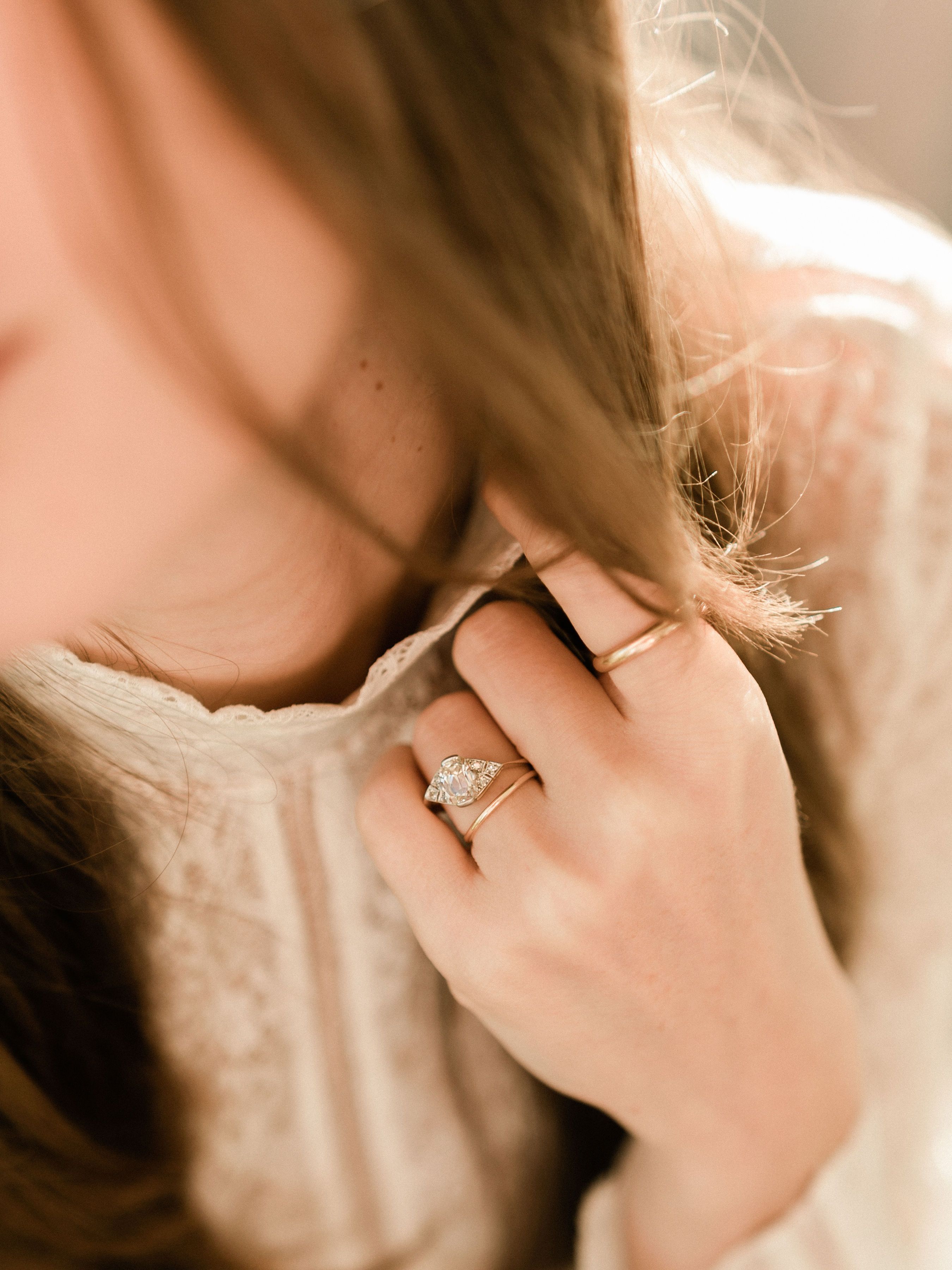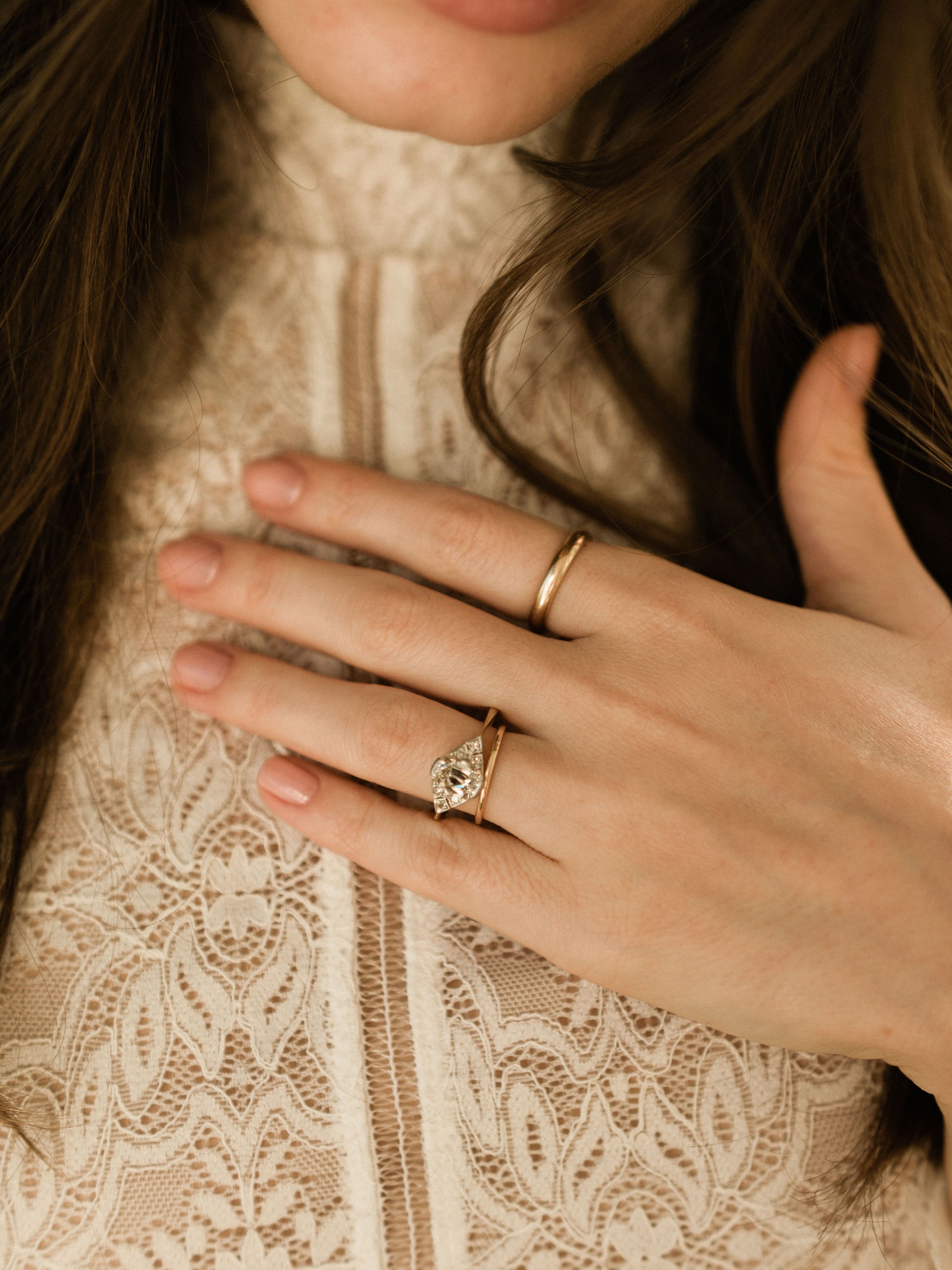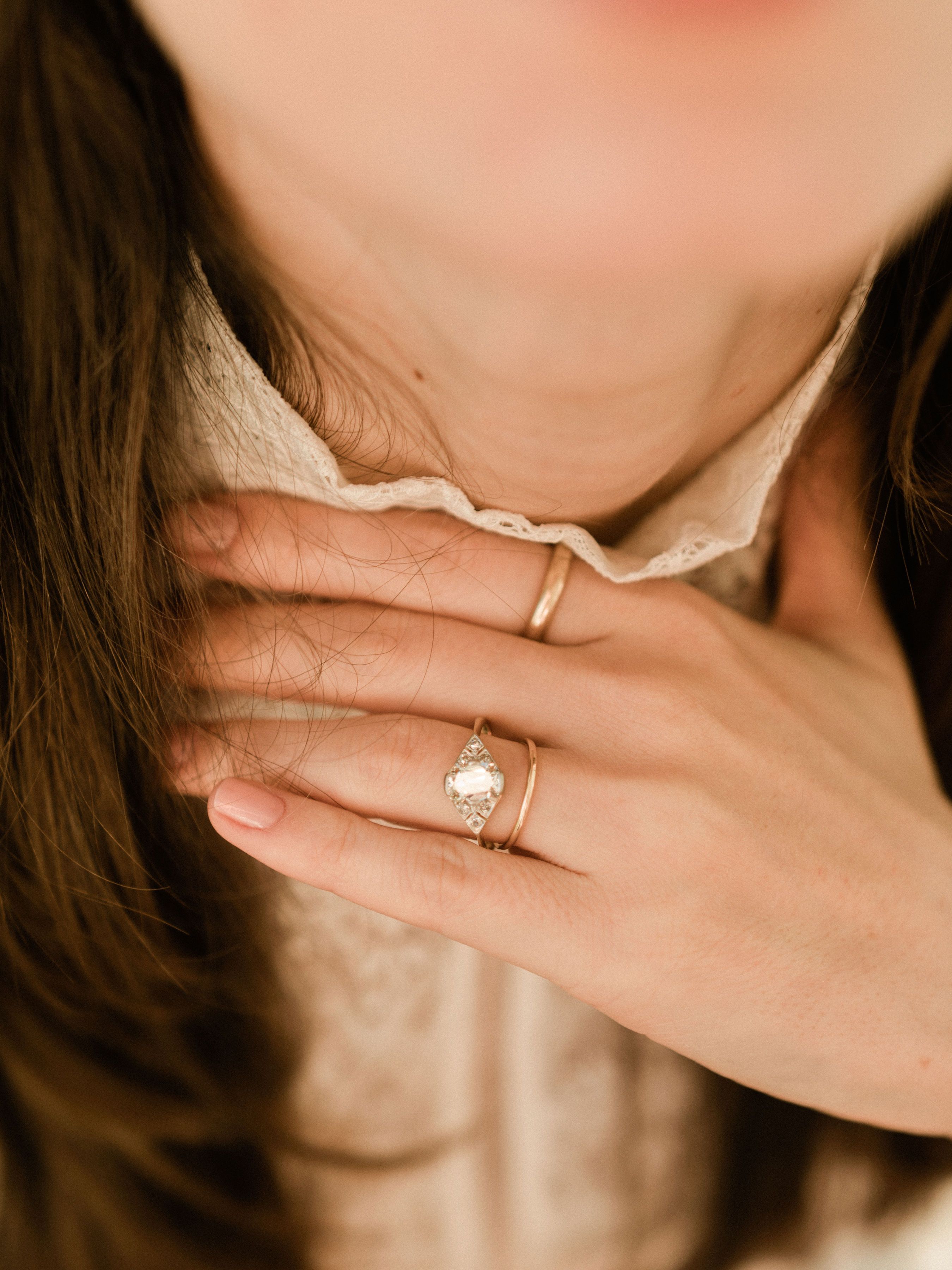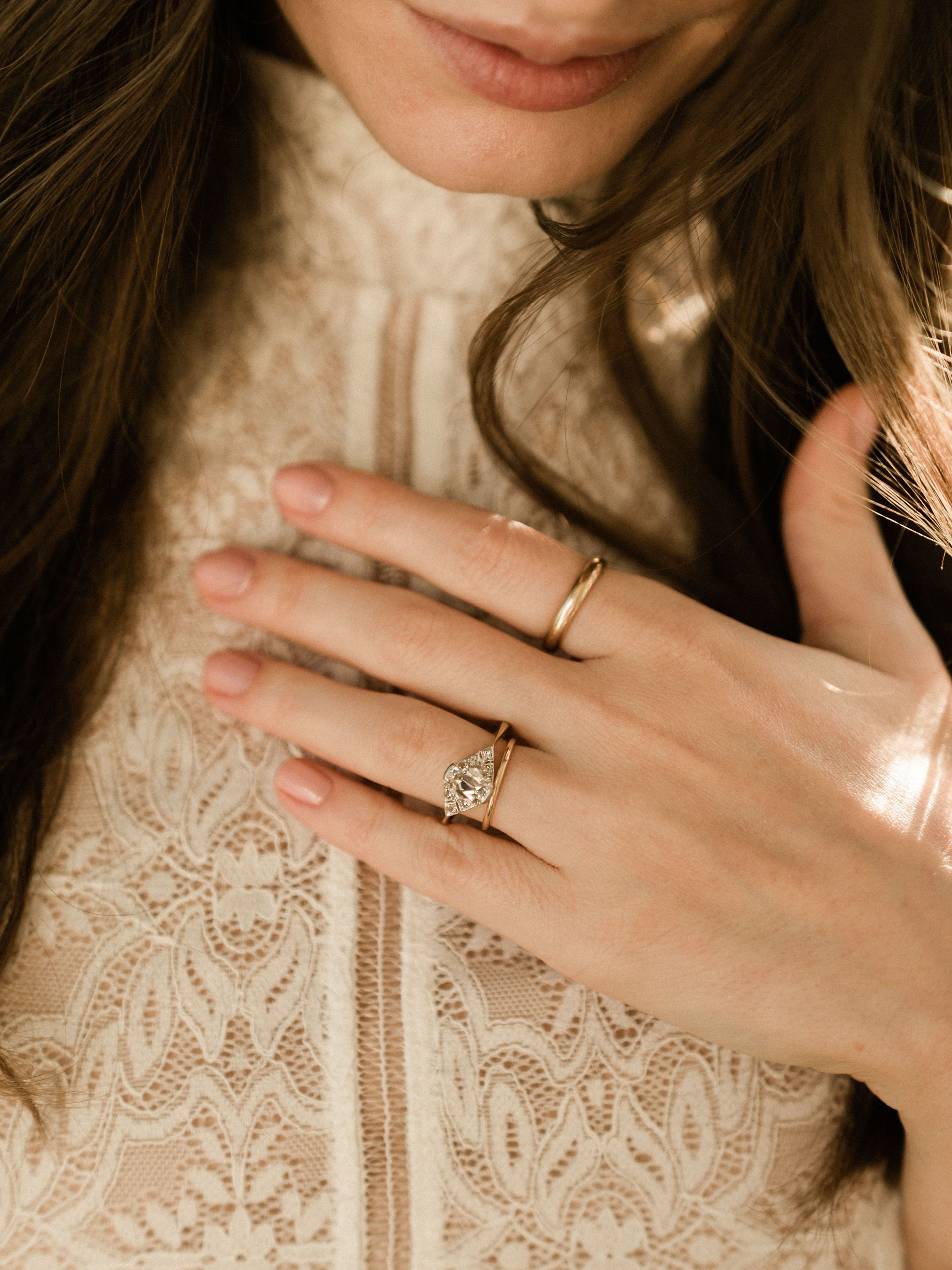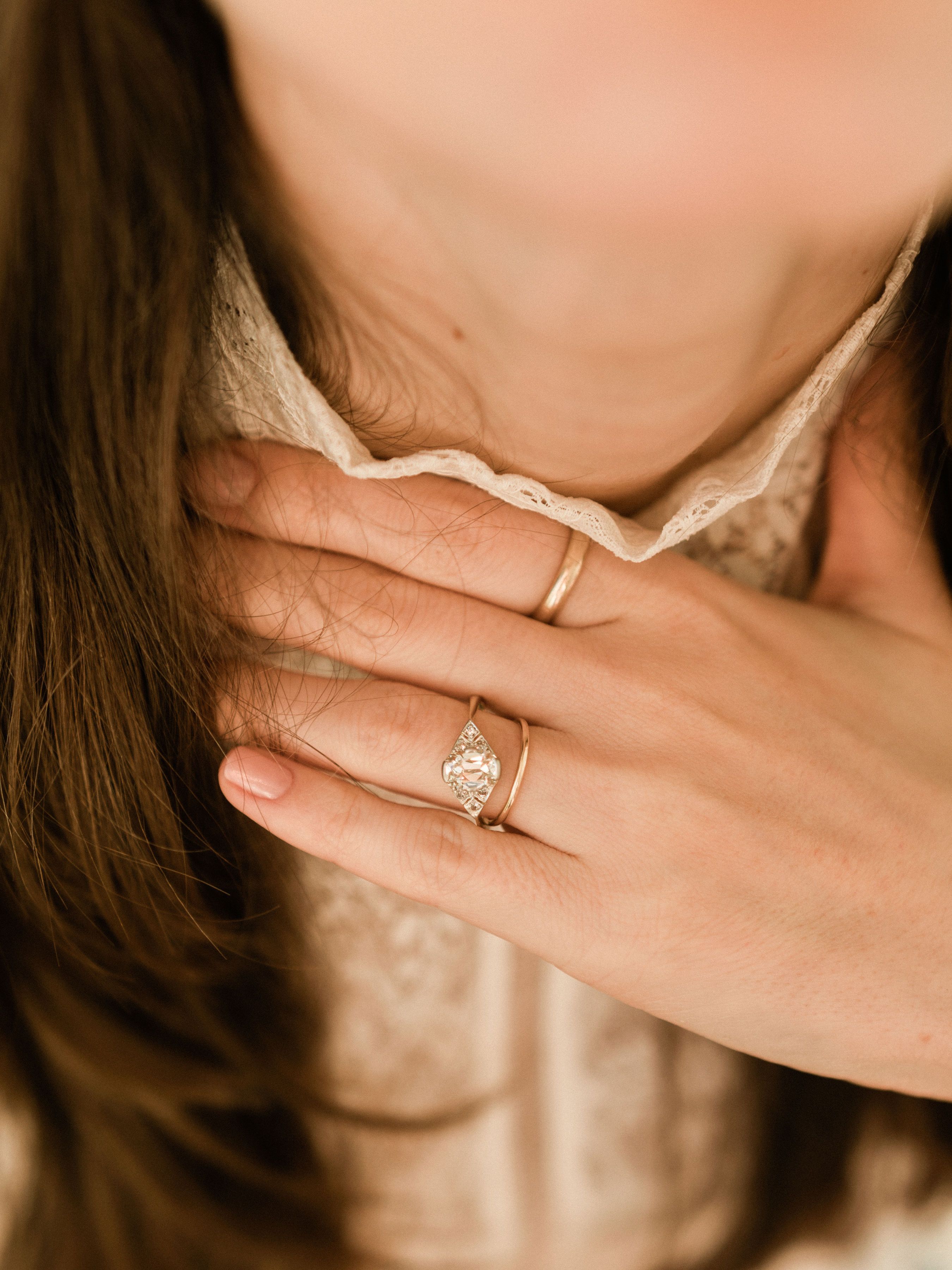 A lovely piece that has both an elongated shape going up the finger and a nice spread across the finger for a finger-flattering wear!