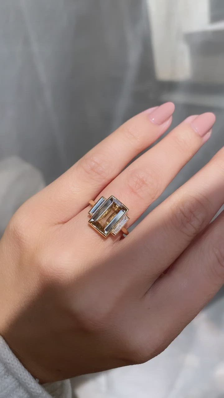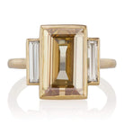 You will never believe that this stone is only 2.07 carats! It has an upward appearance of a 4 carat diamond with the most beautiful champagne color that blends beautifully with our signature 18kt gold and contrasts nicely with the white diamond baguettes. A sleek piece that takes themes from the Art Deco era and mixes with a touch of modern for a one-of-a-kind ring!