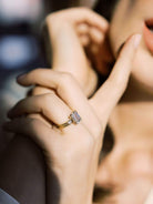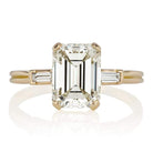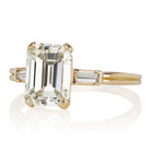 The Wellington 2.52 Ring is a vintage-inspired VB-Made emerald cut engagement ring with baguettes. The ring centers a GIA Certified 2.52ct Emerald Cut diamond of O-P color, VS2 clarity. The diamond is set in a 4 prong 18kt yellow gold setting with a sleek baguette set to each side. The ring is size 6 and can be resized.