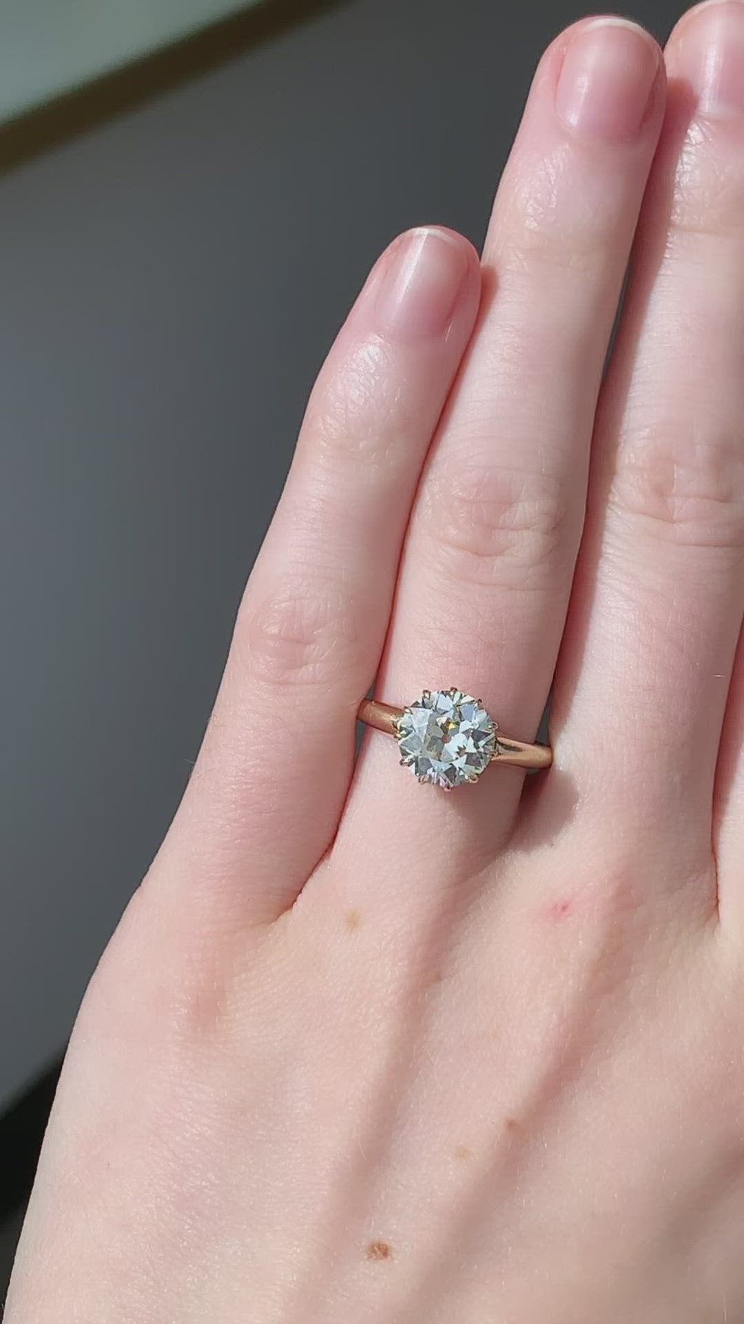 The Emmeline ring is an authentic vintage ring from the Edwardian era circa 1910. The ring centers a GIA-certified 2.28-carat old European cut diamond of M color, SI1 clarity. The stone is set in an 11-prong 14 karat yellow gold setting. The ring is currently size 6.5 and can be resized!