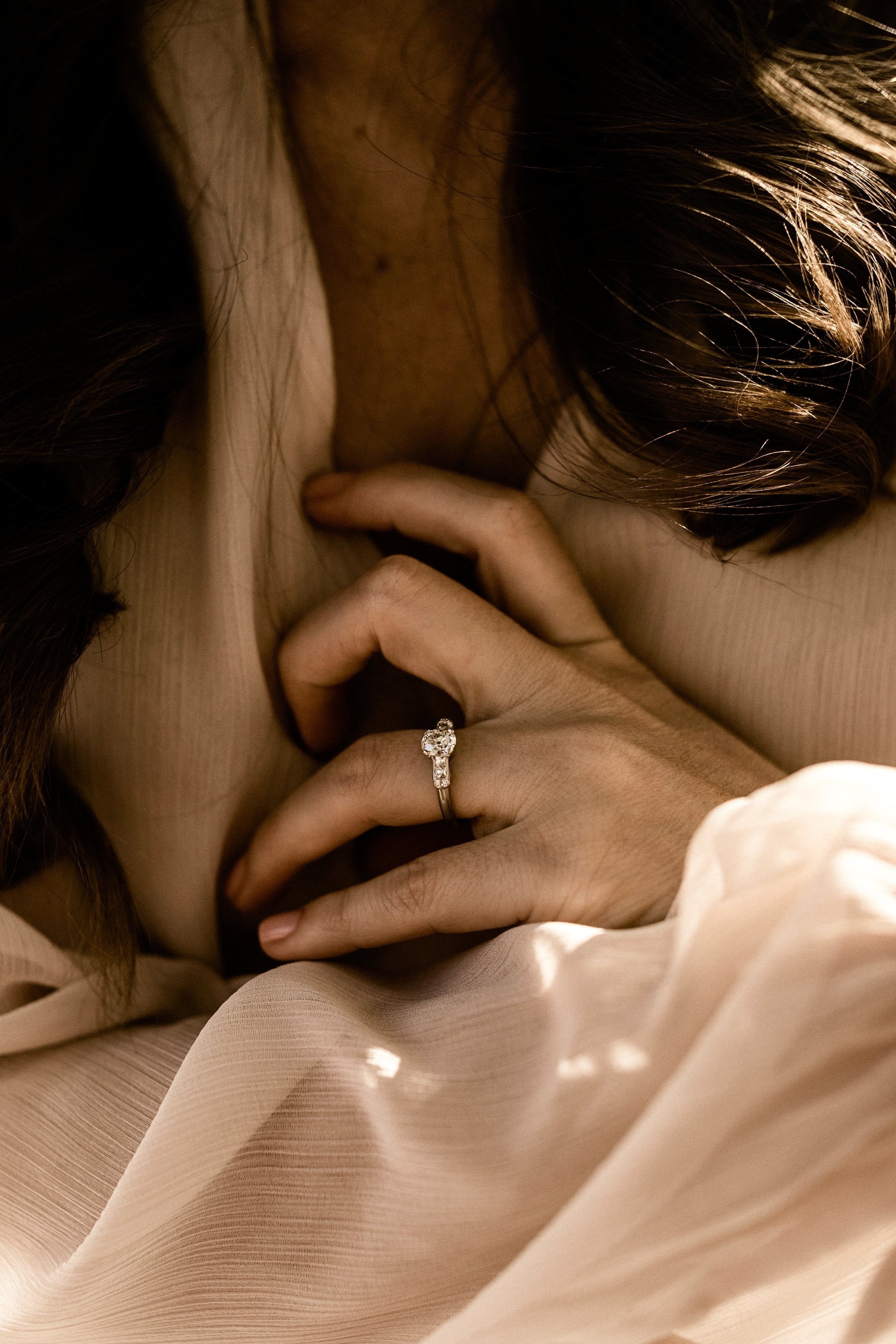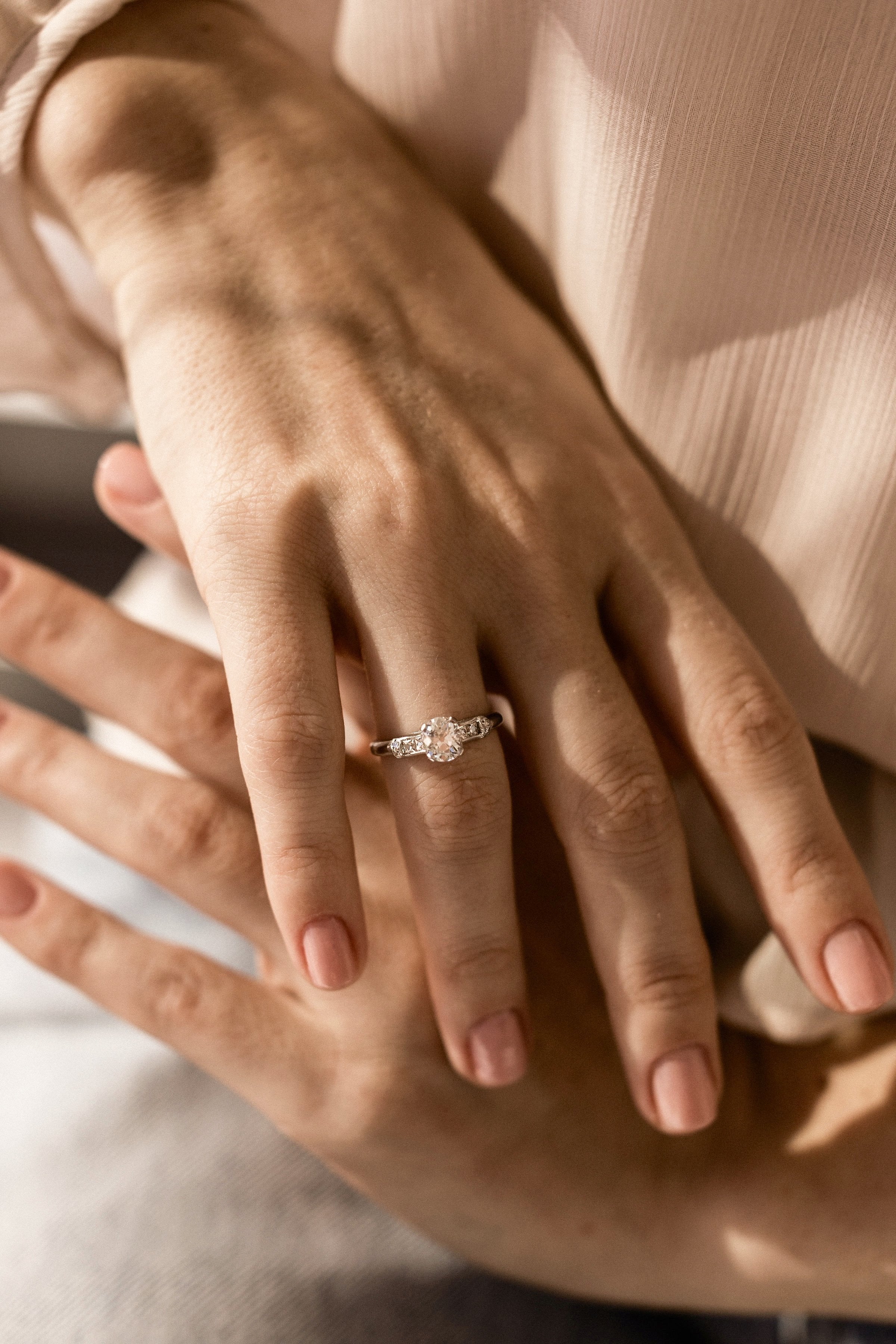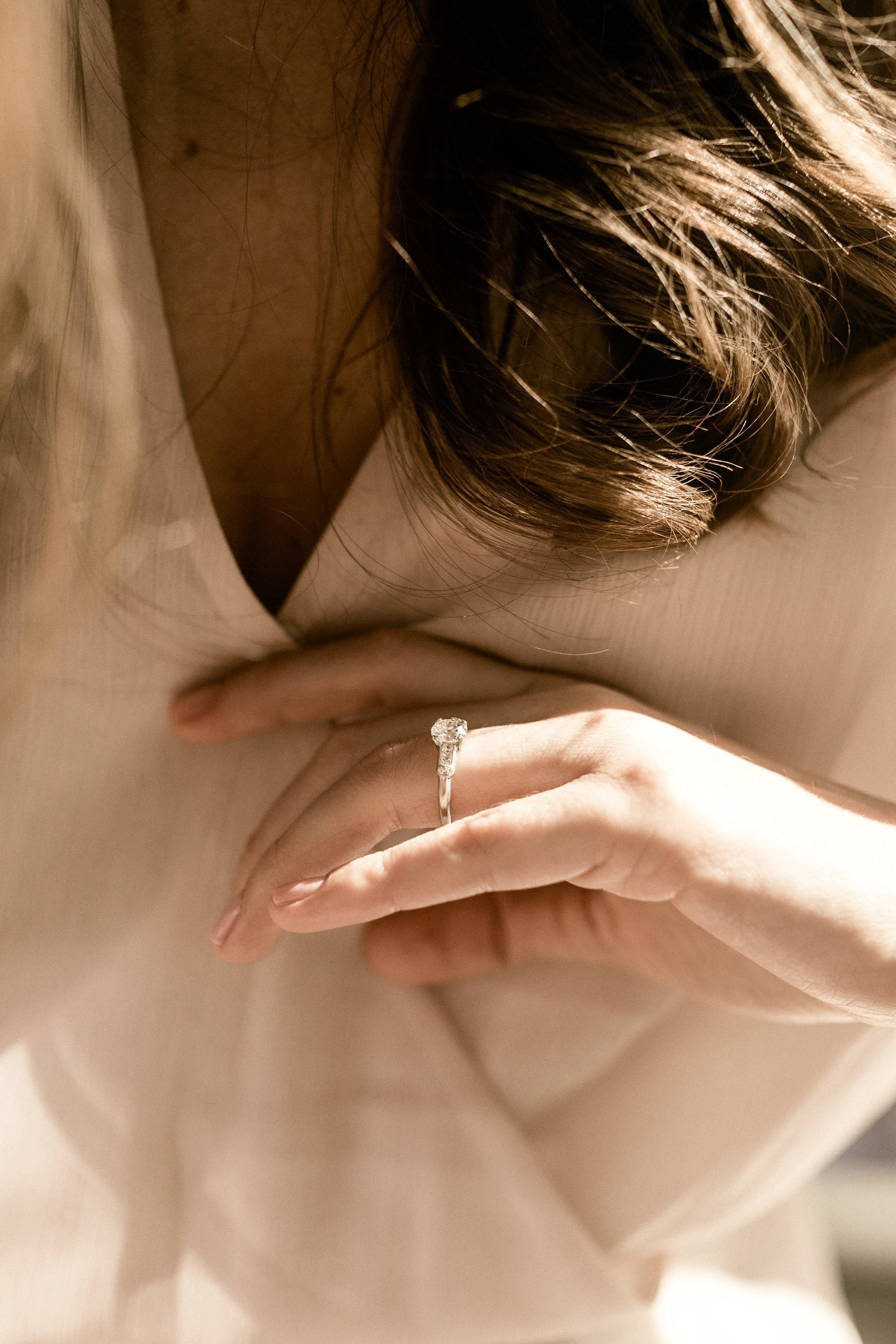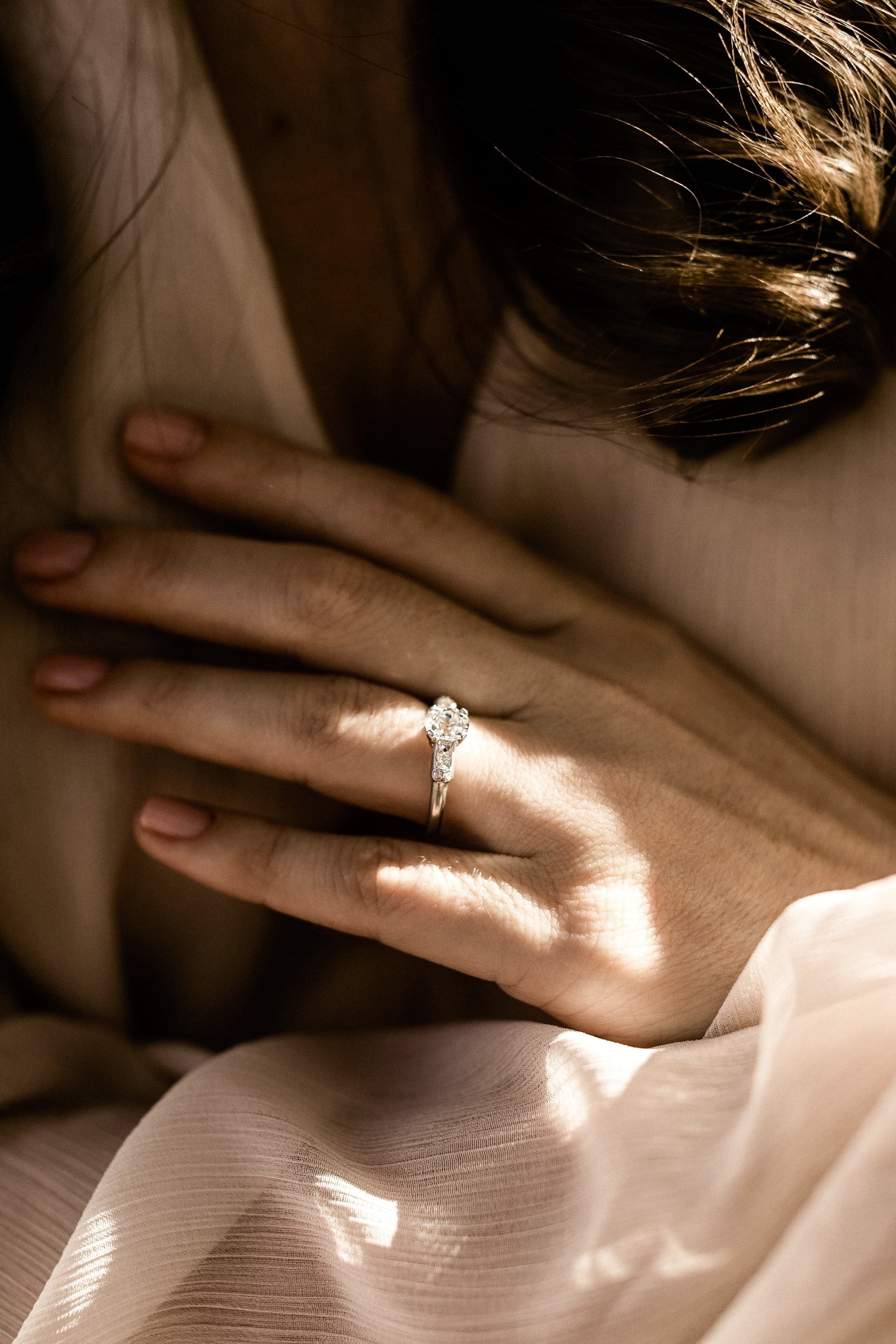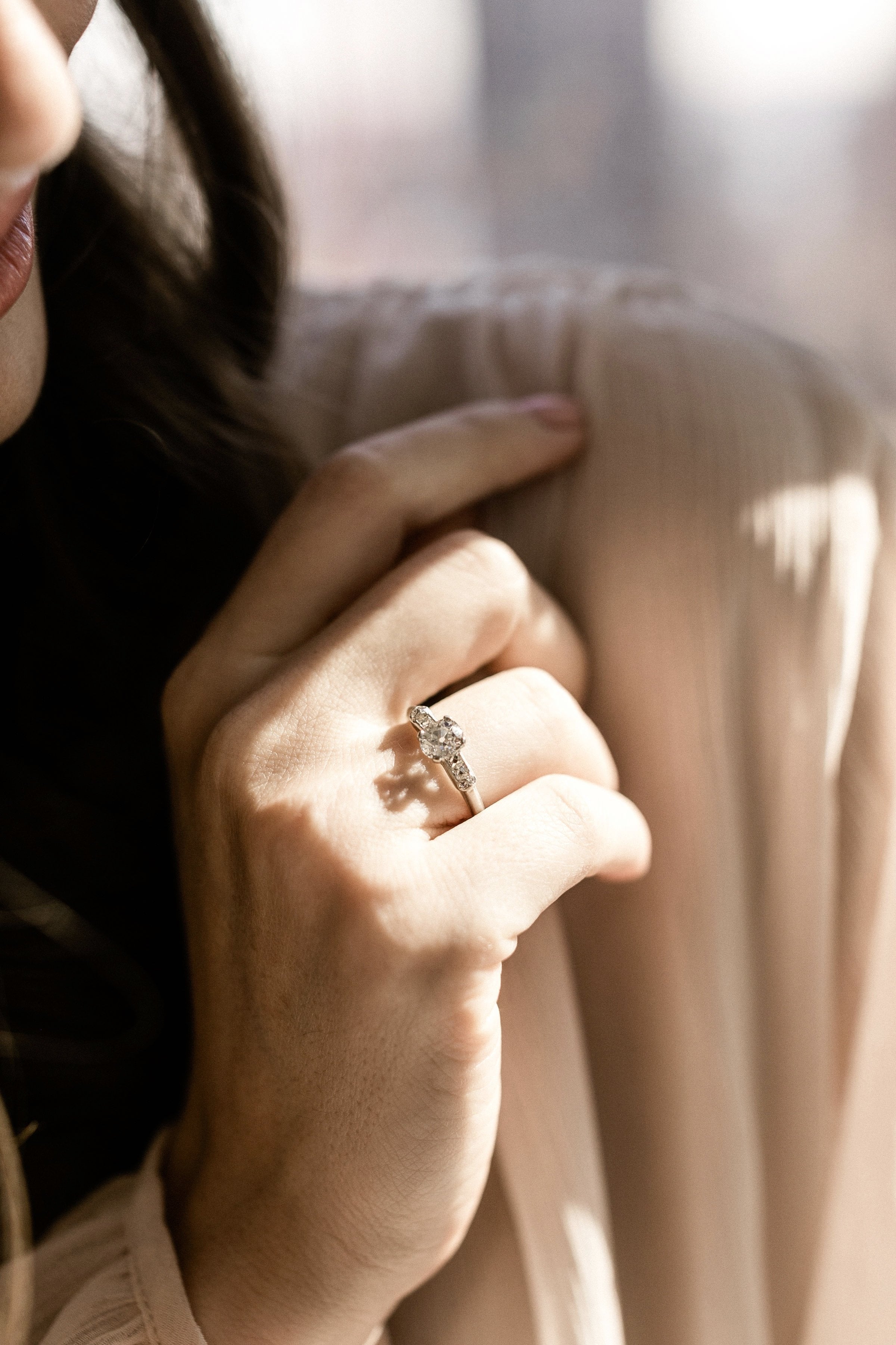 A super chic ring with a vibrant old mine cut diamond that has an almost oval shape that is perfectly complimented by the chunky French cut diamonds to each side!