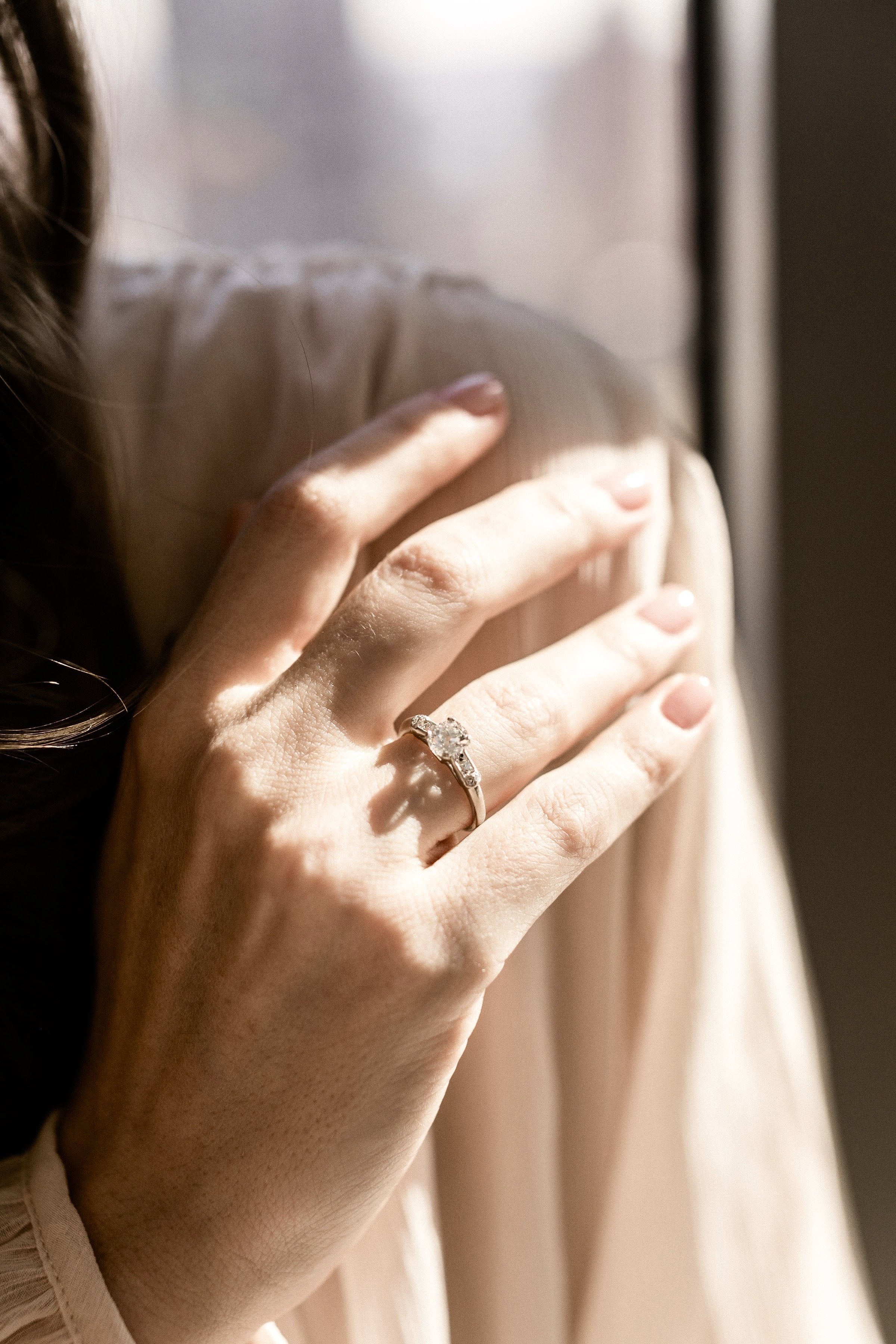 The Lou ring is an authentic Art Deco engagement ring circa 1925! This engagement ring with French cut side stones centers a GIA Certified 0.93 carat old mine cut diamond of I color, VS1 clarity. The diamond is set in a 4-prong platinum setting with two French cut diamonds channel set into each shoulder with two round diamonds following those. The ring is size 7 and can be resized!