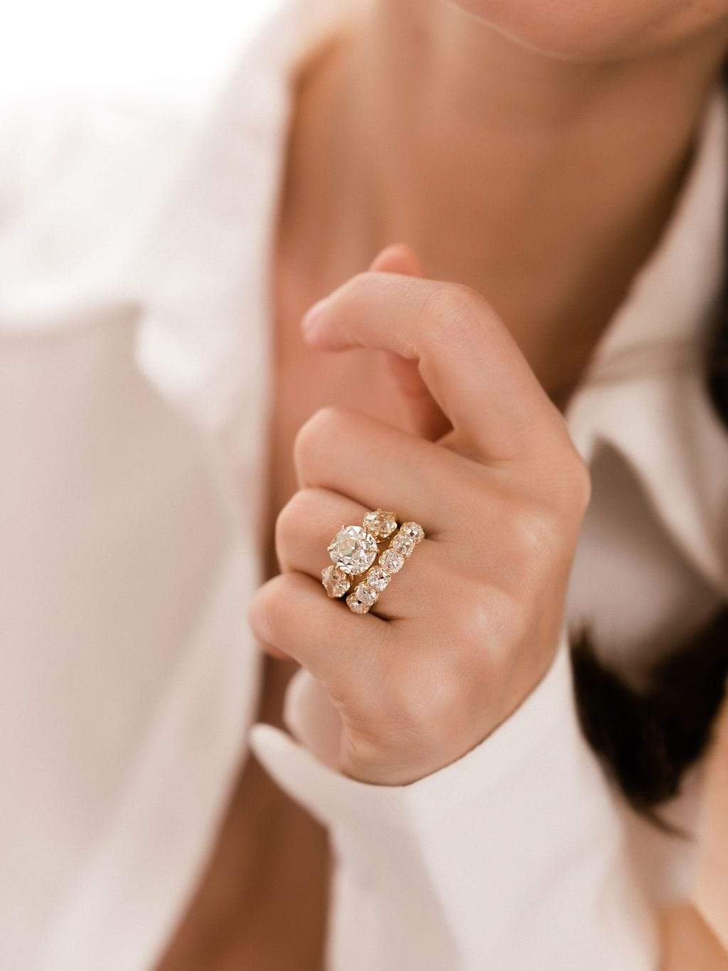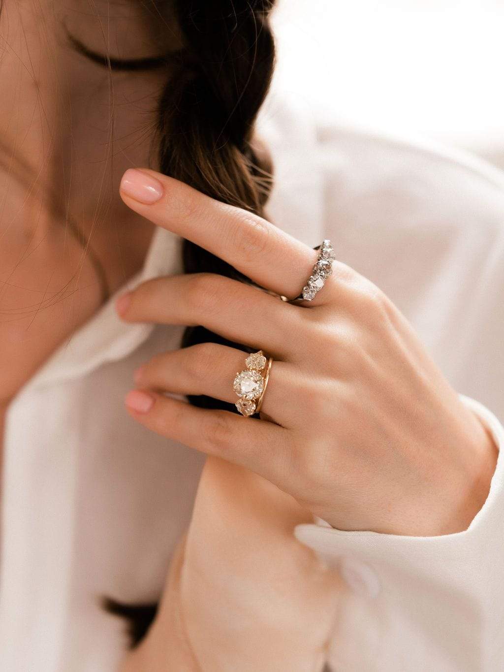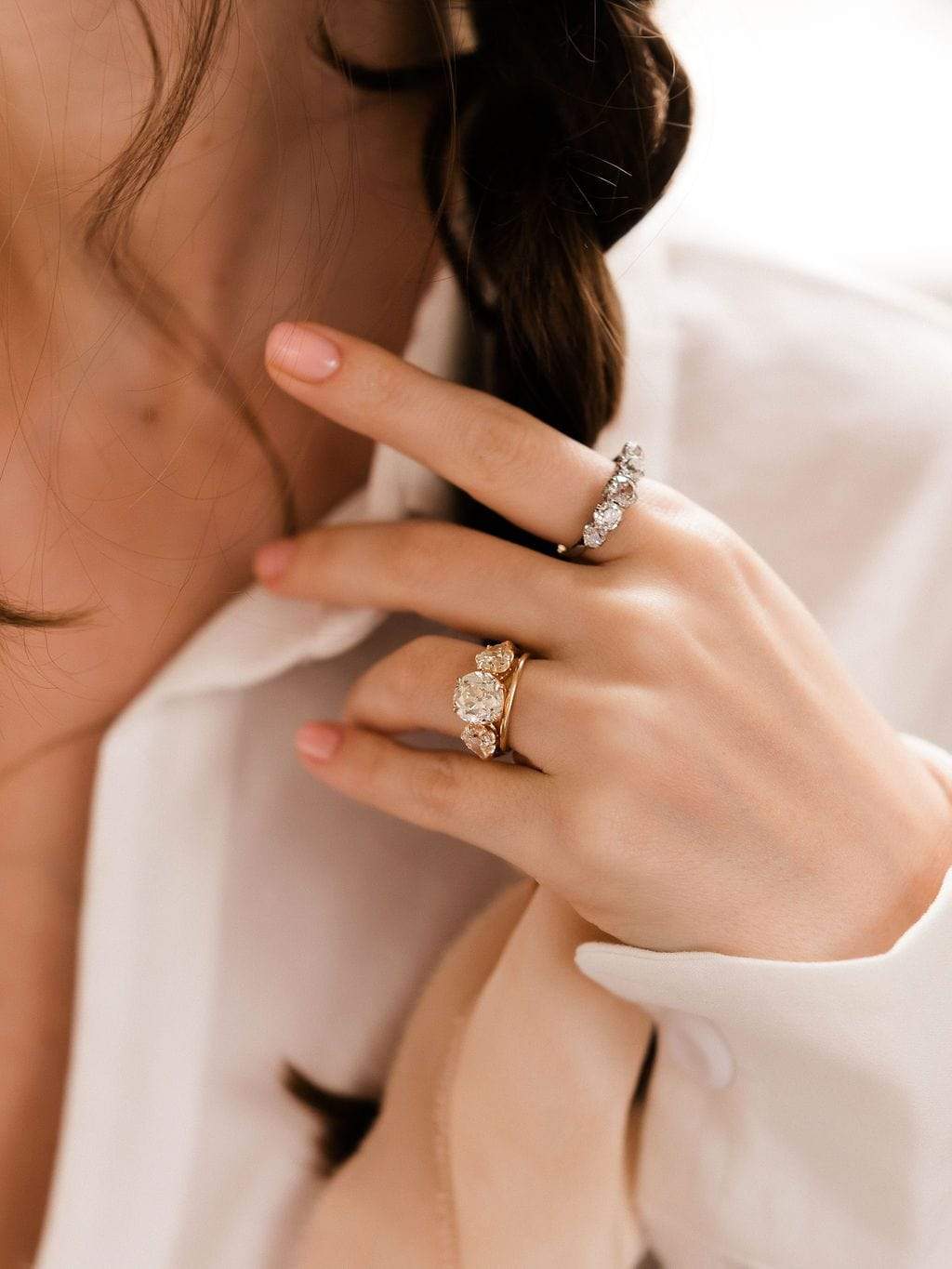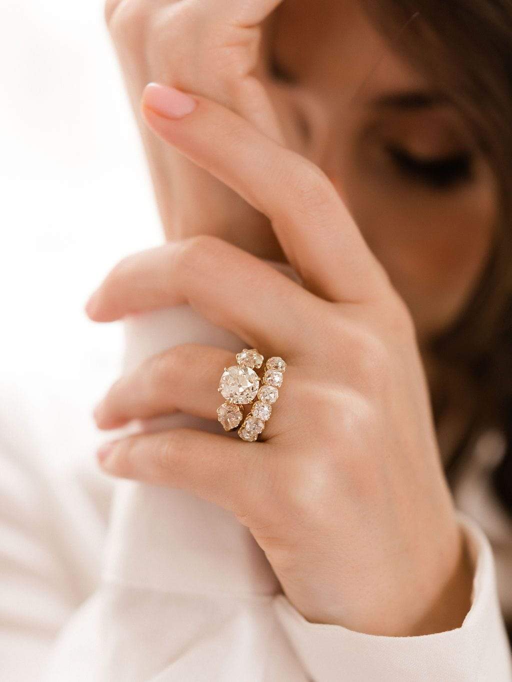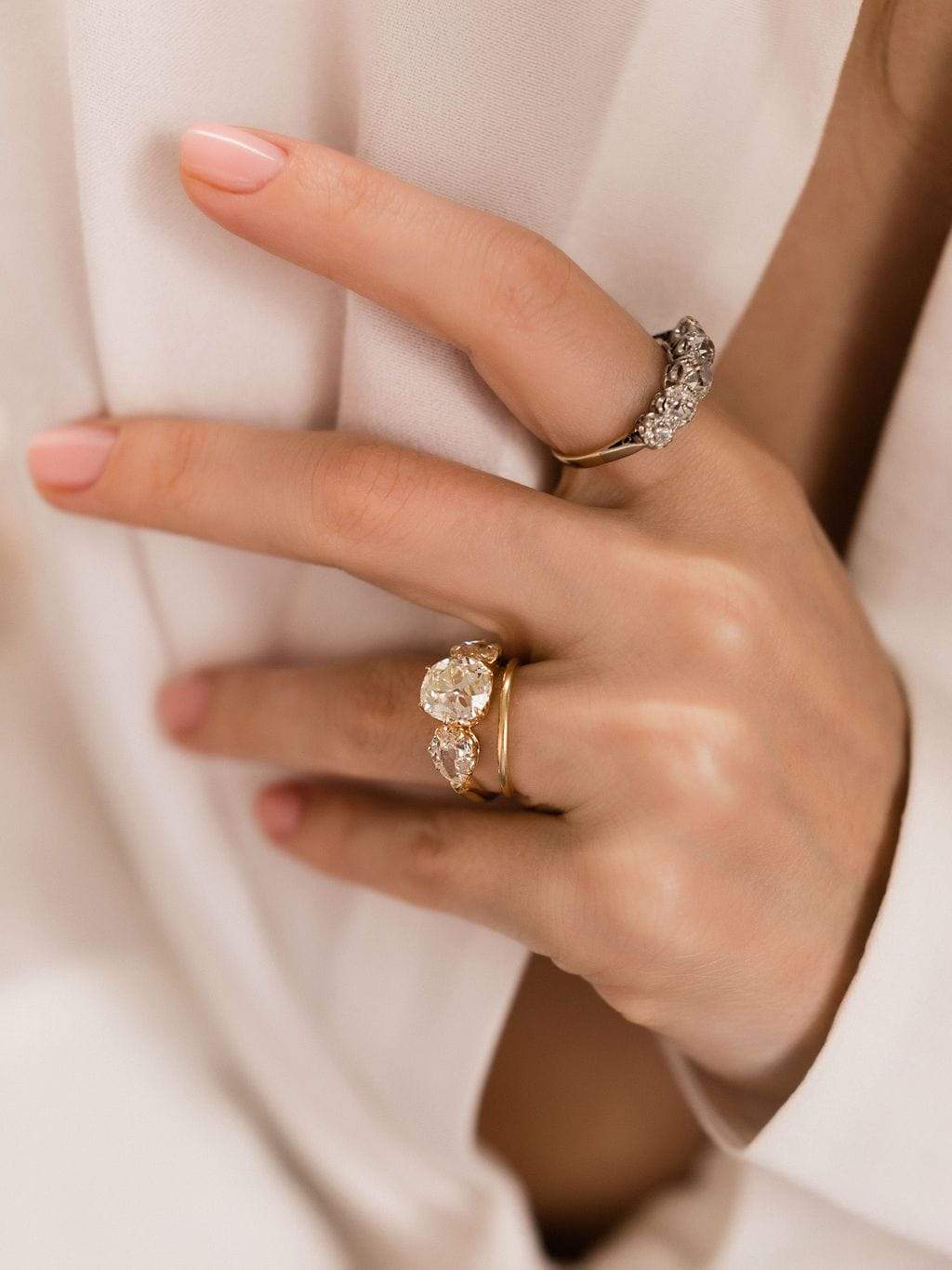 The center stone on this ring is a beautiful antique diamond that has the look of an old mine cut cushion in this beautiful golden setting! The pear-cut side diamonds are an elegant twist on your classic three stone diamond ring that create this lovely tapering flow!