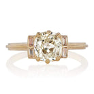 The Petra 1.02 ring is a vintage-inspired VB-made diamond engagement ring. The ring centers a GIA certified 1.02-carat old mine cut diamond of L color, SI1 clarity. The stone is set in an 18 karat yellow gold setting. To each side of the center stone are two Natural Fancy pink baguettes. The ring is currently size 6+ and can be resized!