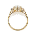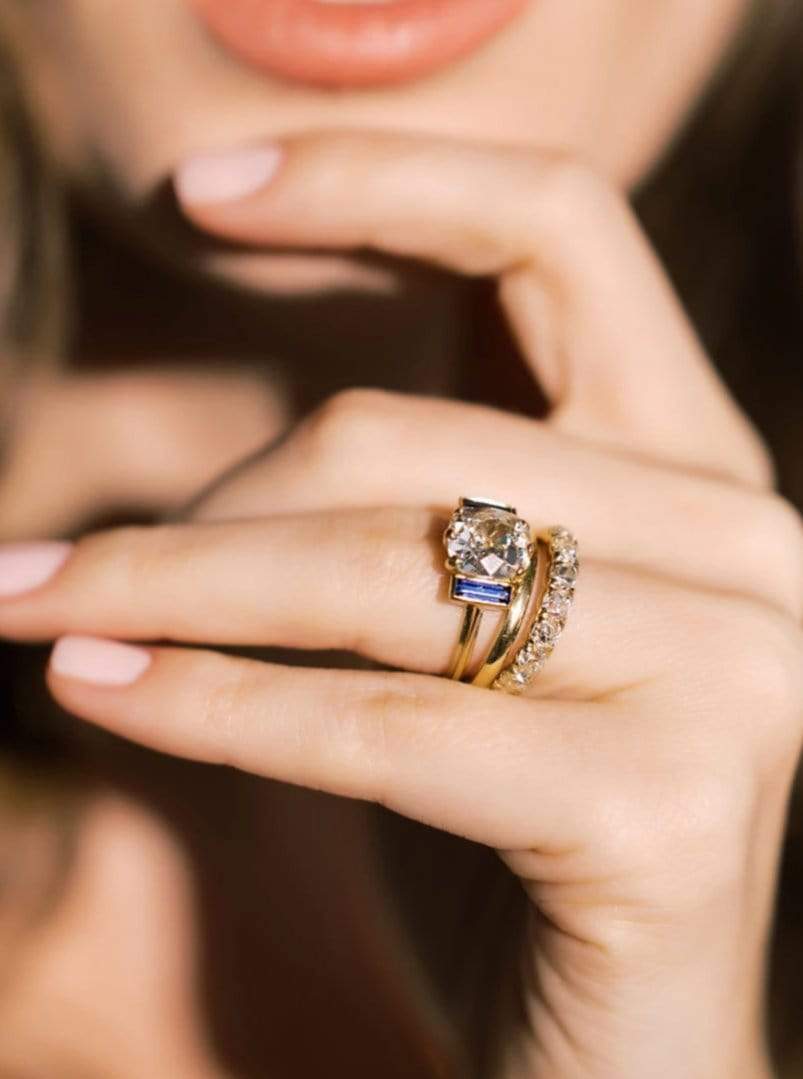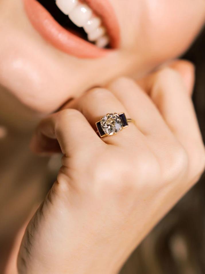 The Petra 2.80 ring is a VB-made engagement ring based on an authentic French ring we once had. This ring centers a GIA Certified 2.80-carat old mine cut diamond of N color, SI2 clarity. The diamond is set in an 18kt yellow gold ring with a sapphire bezel-set to each side. The ring is size 6 and can be resized.