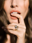 Petra is a favorite design over here! We love this rendition for the bold pairing of yellow gold and vibrant blue sapphire and a gorgeous, spready old mine cut diamond.