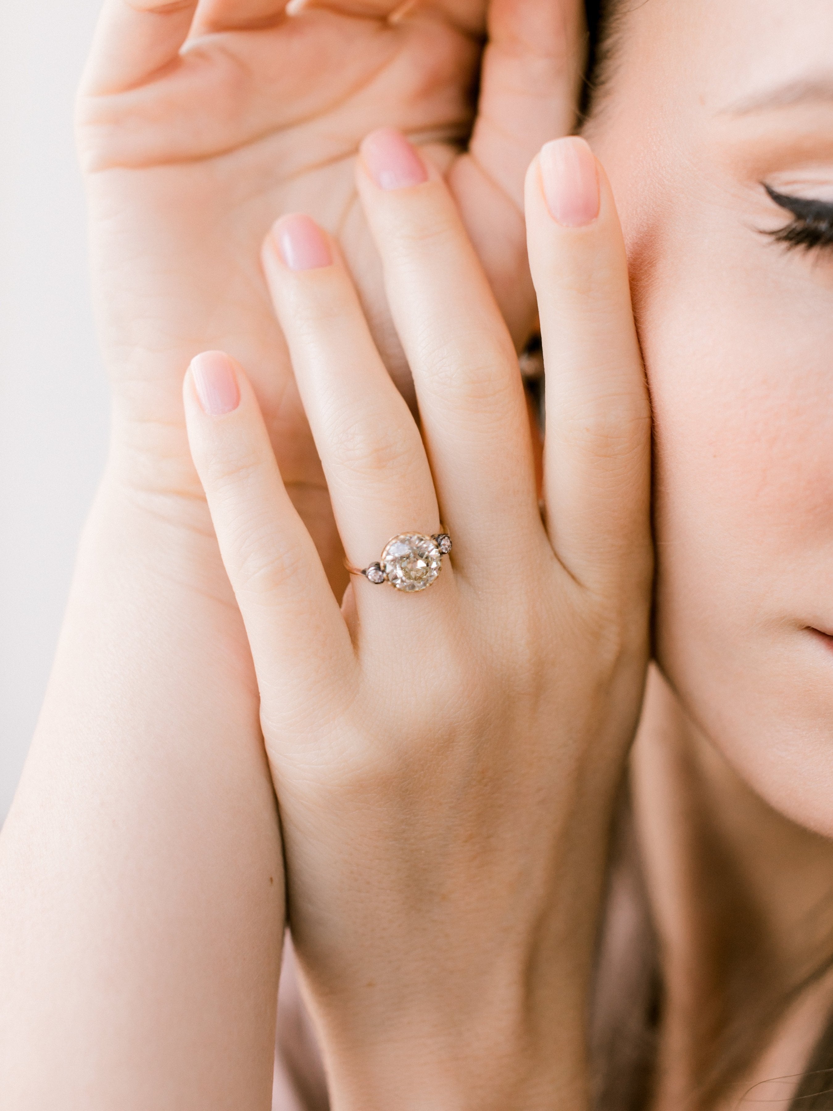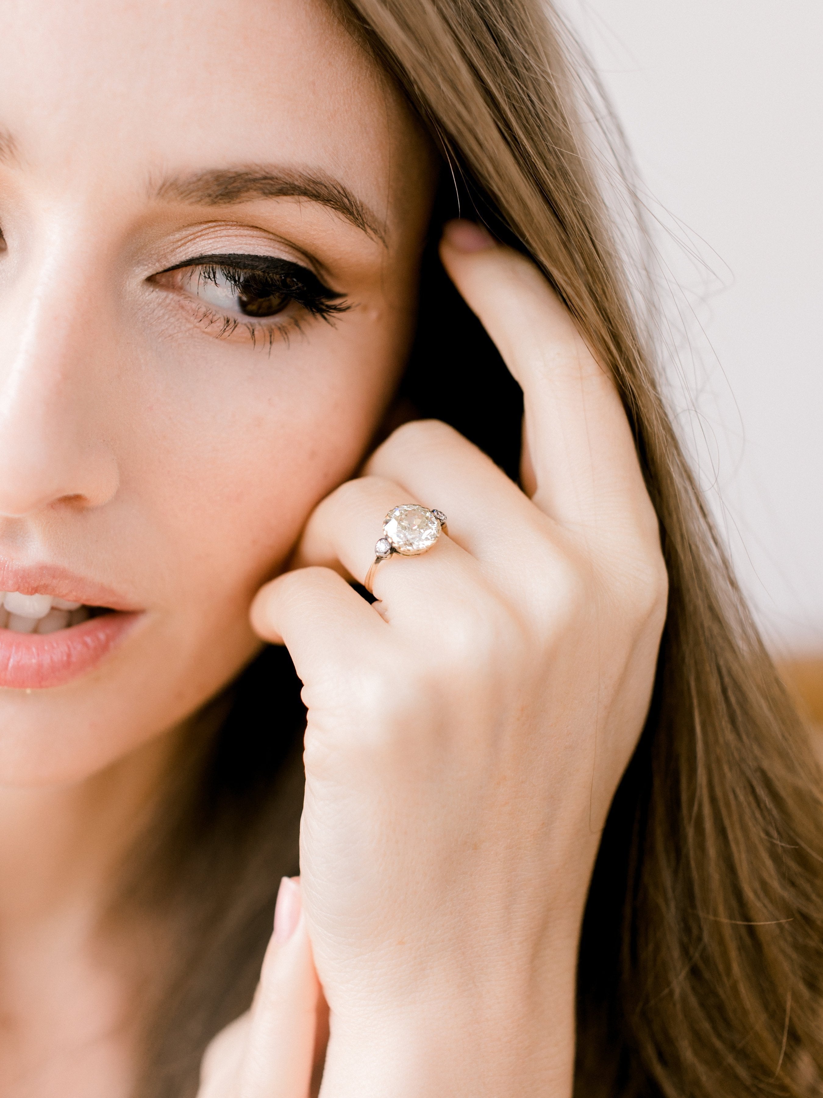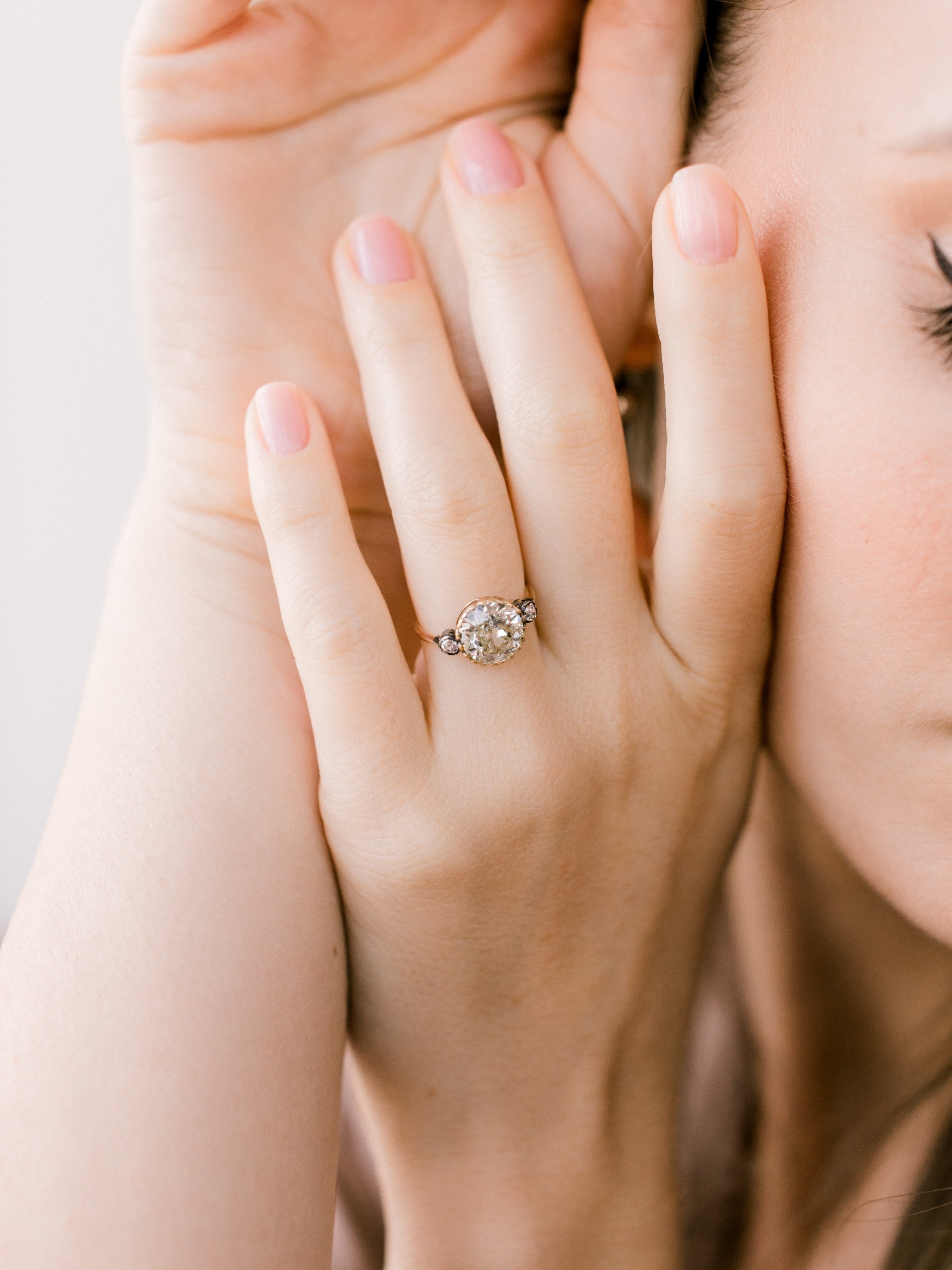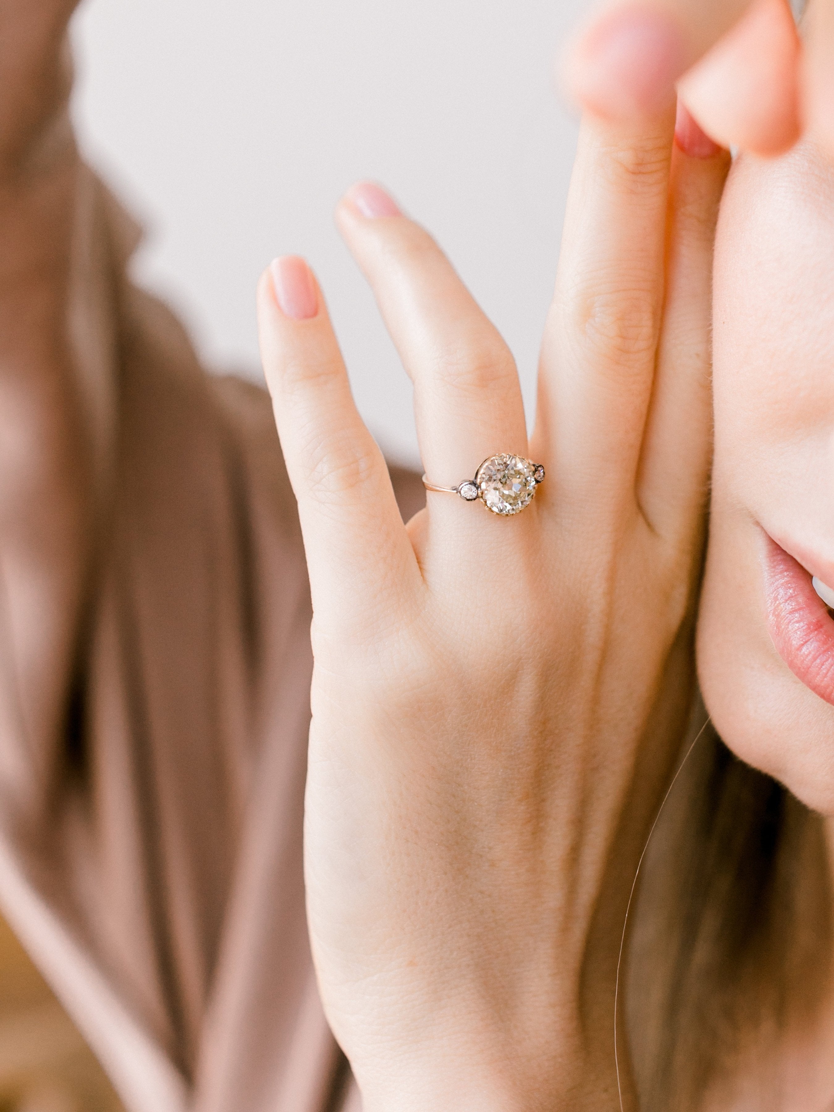 The Lara ring is an Edwardian engagement ring with small side stones circa 1910! The ring centers a 2.63ct old European cut diamond of approximately Q-R color, VS2 clarity. The diamond is set in a yellow gold setting with a small old European cut diamond to each side that is bezel-set in silver-topped yellow gold. The shank has a slight taper to it. The ring is size 5 and can be resized!