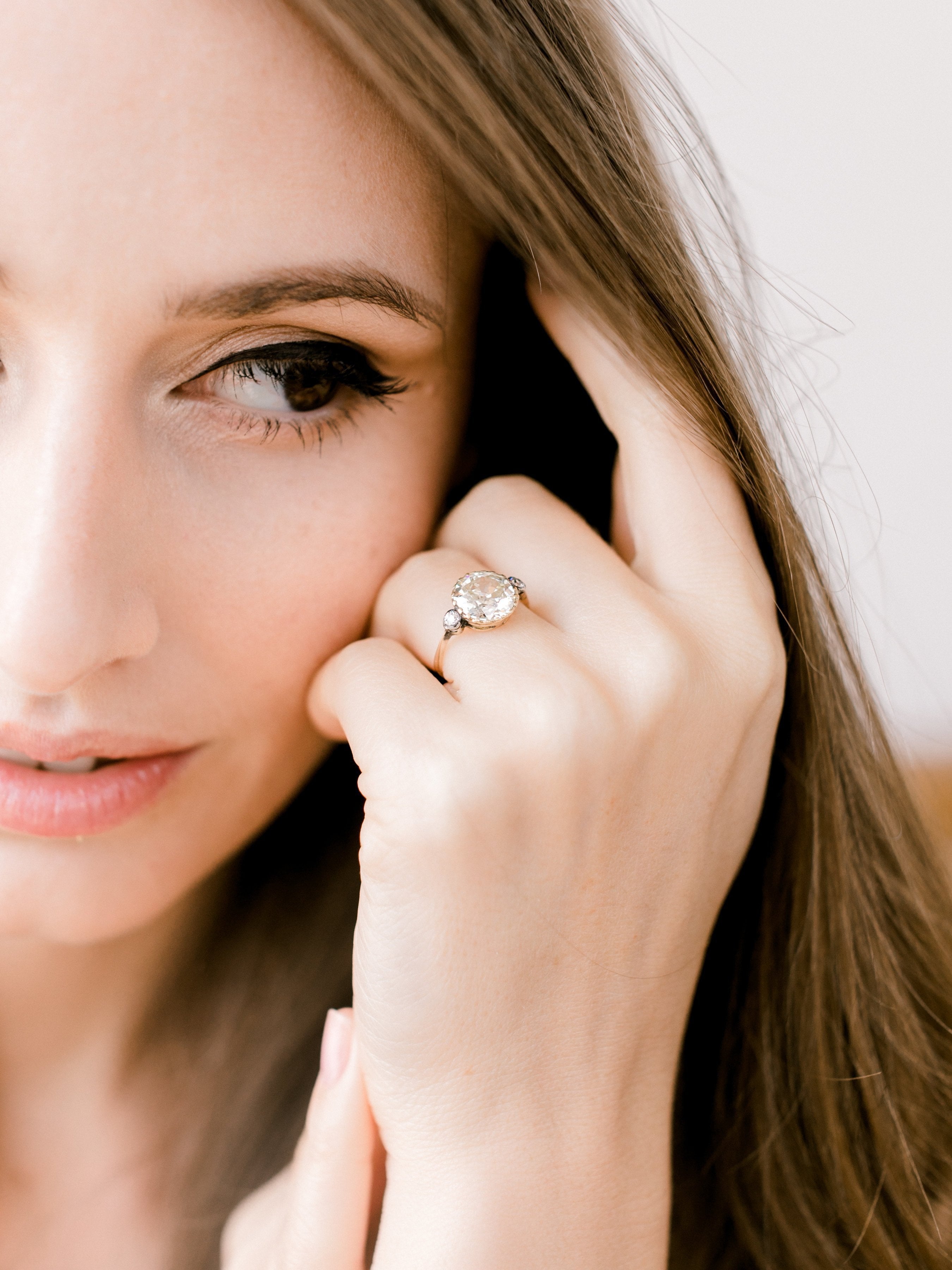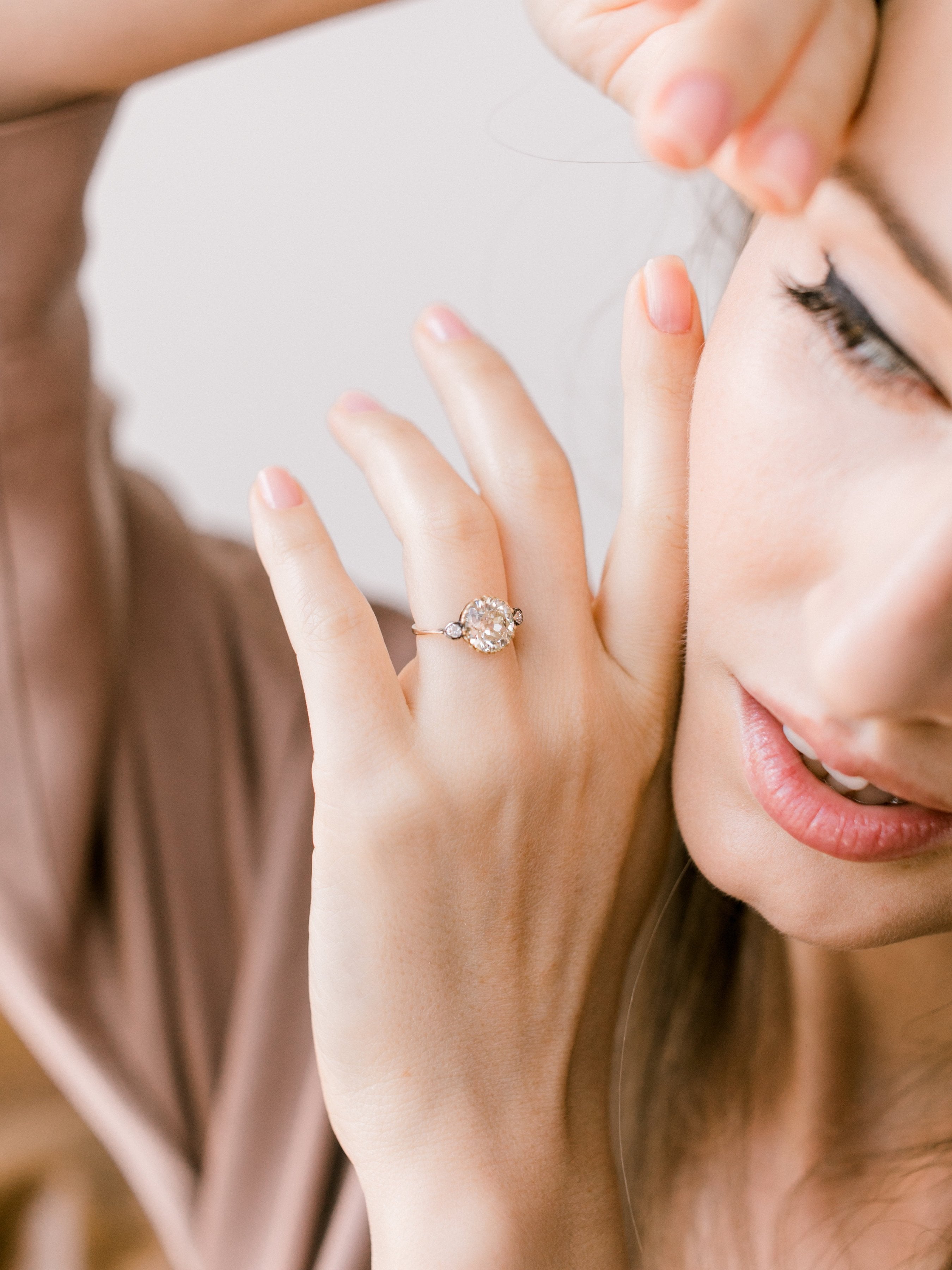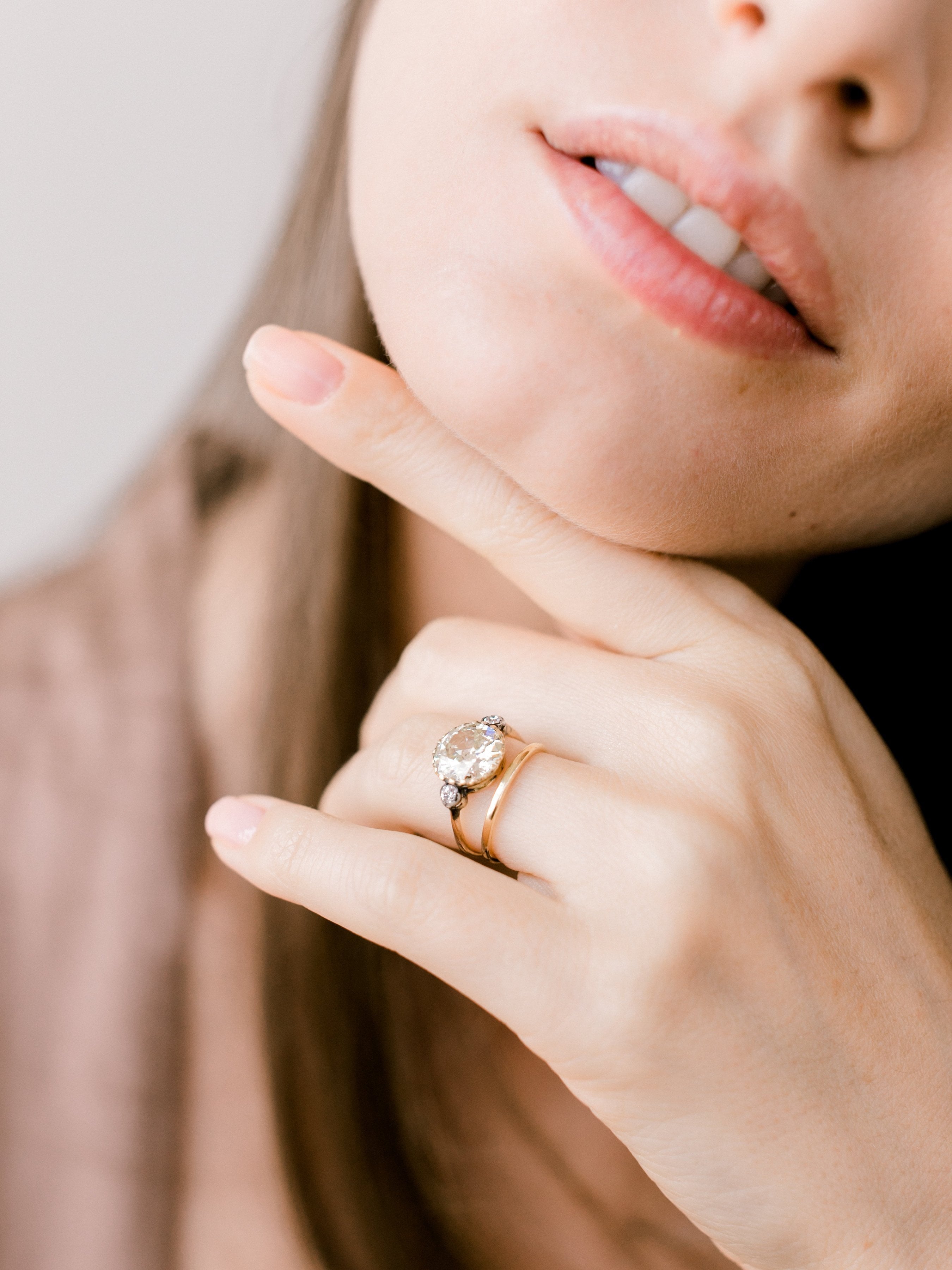 The Lara ring is an Edwardian engagement ring with small side stones circa 1910! The ring centers a 2.63ct old European cut diamond of approximately Q-R color, VS2 clarity. The diamond is set in a yellow gold setting with a small old European cut diamond to each side that is bezel-set in silver-topped yellow gold. The shank has a slight taper to it. The ring is size 5 and can be resized!