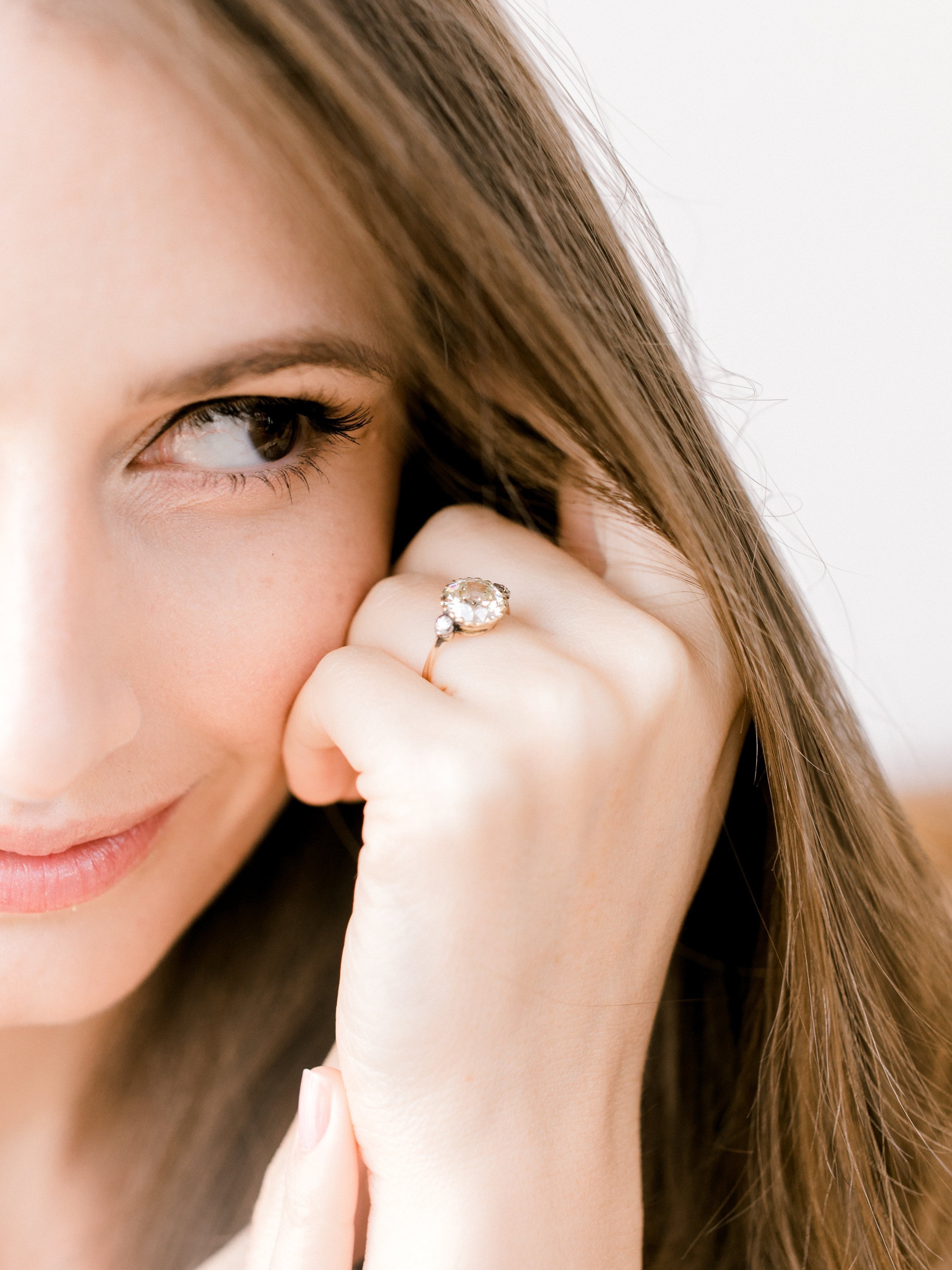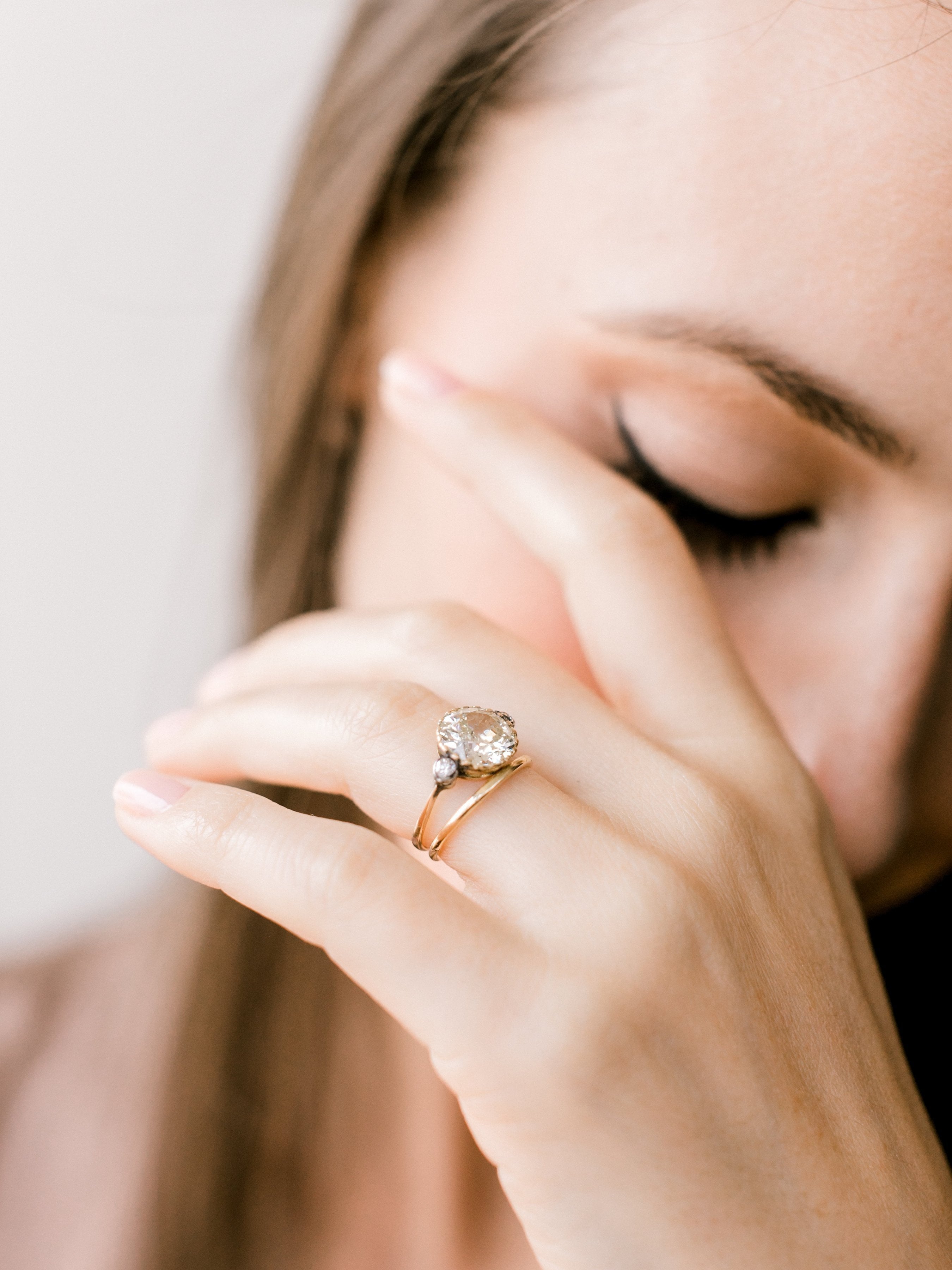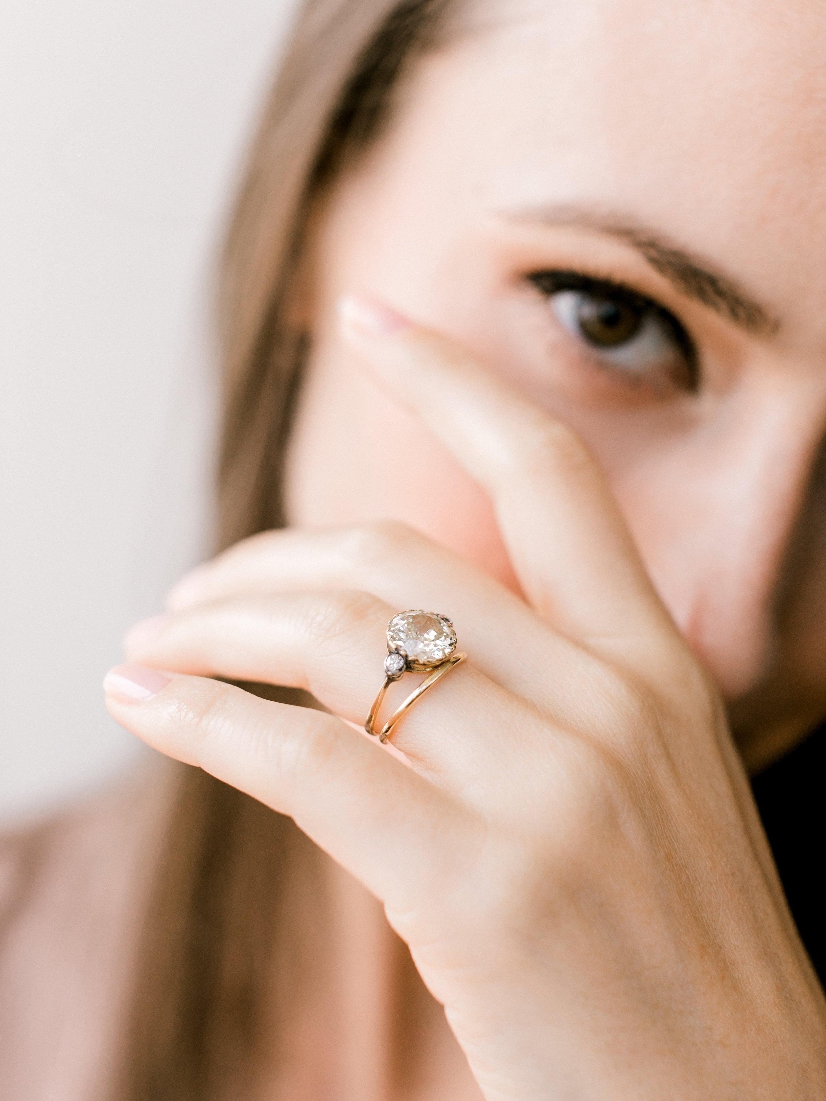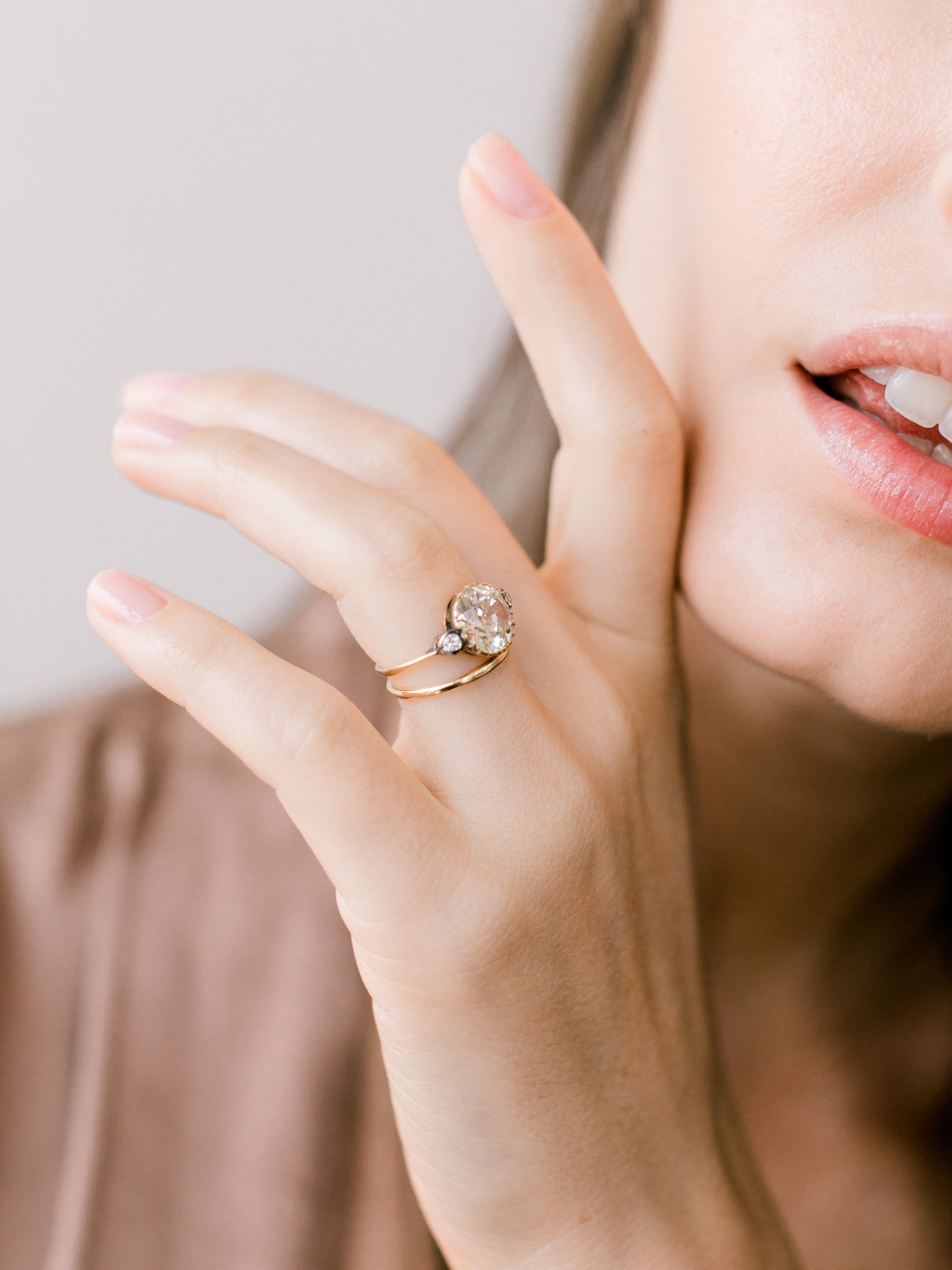 The Lara ring is an Edwardian engagement ring with small side stones circa 1910! The ring centers a 2.63ct old European cut diamond of approximately Q-R color, VS2 clarity. The diamond is set in a yellow gold setting with a small old European cut diamond to each side that is bezel-set in silver-topped yellow gold. The shank has a slight taper to it. The ring is size 5 and can be resized!