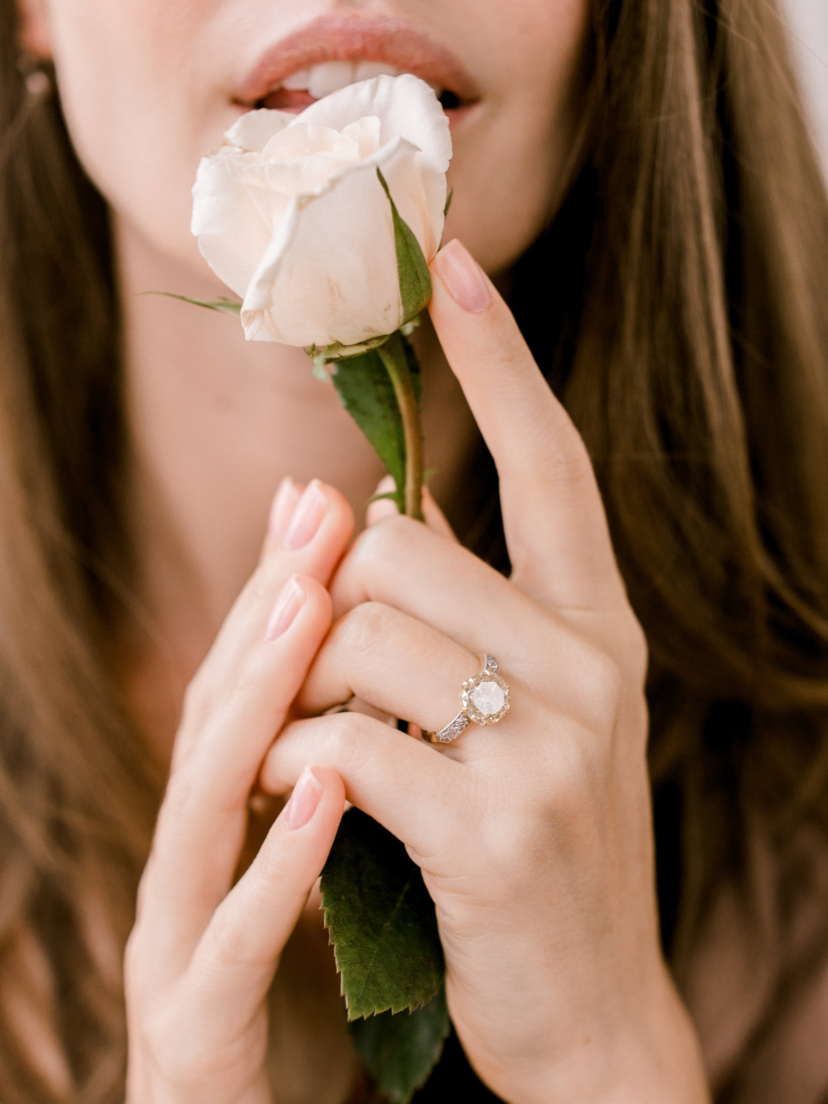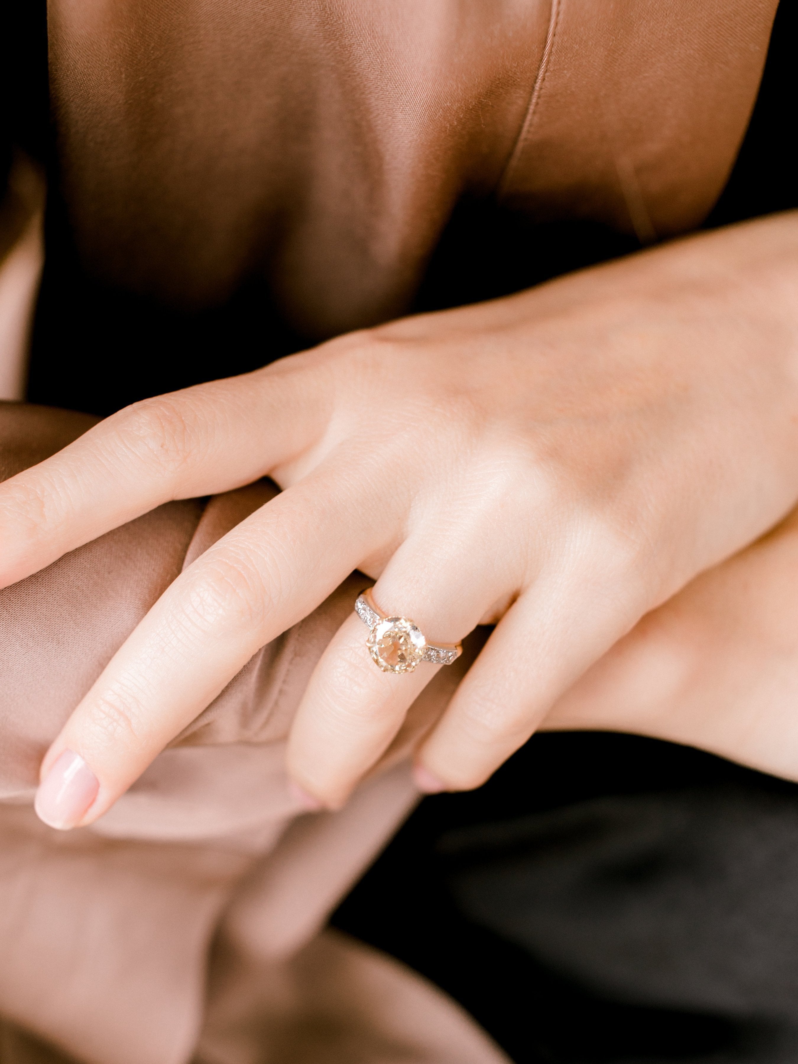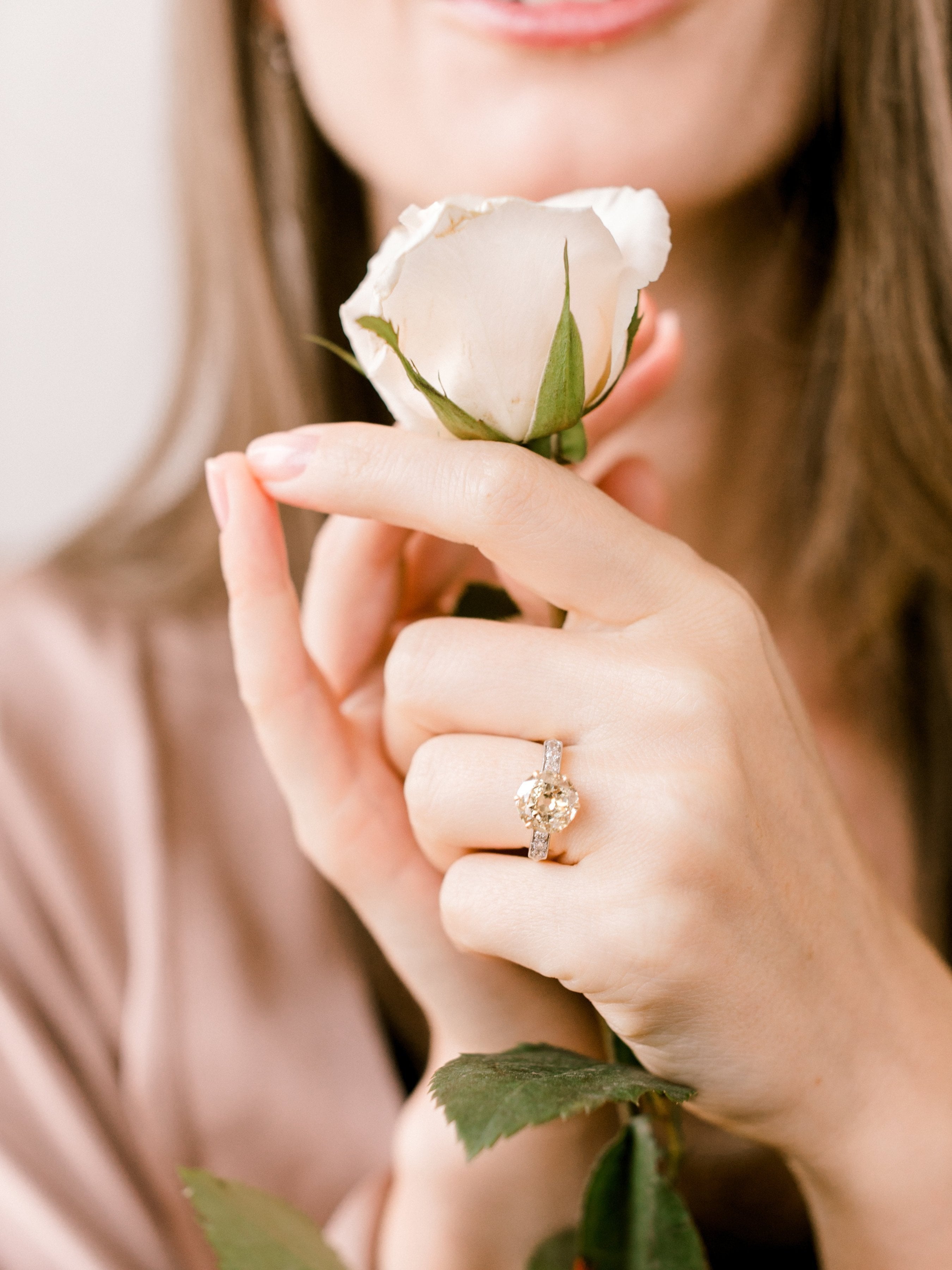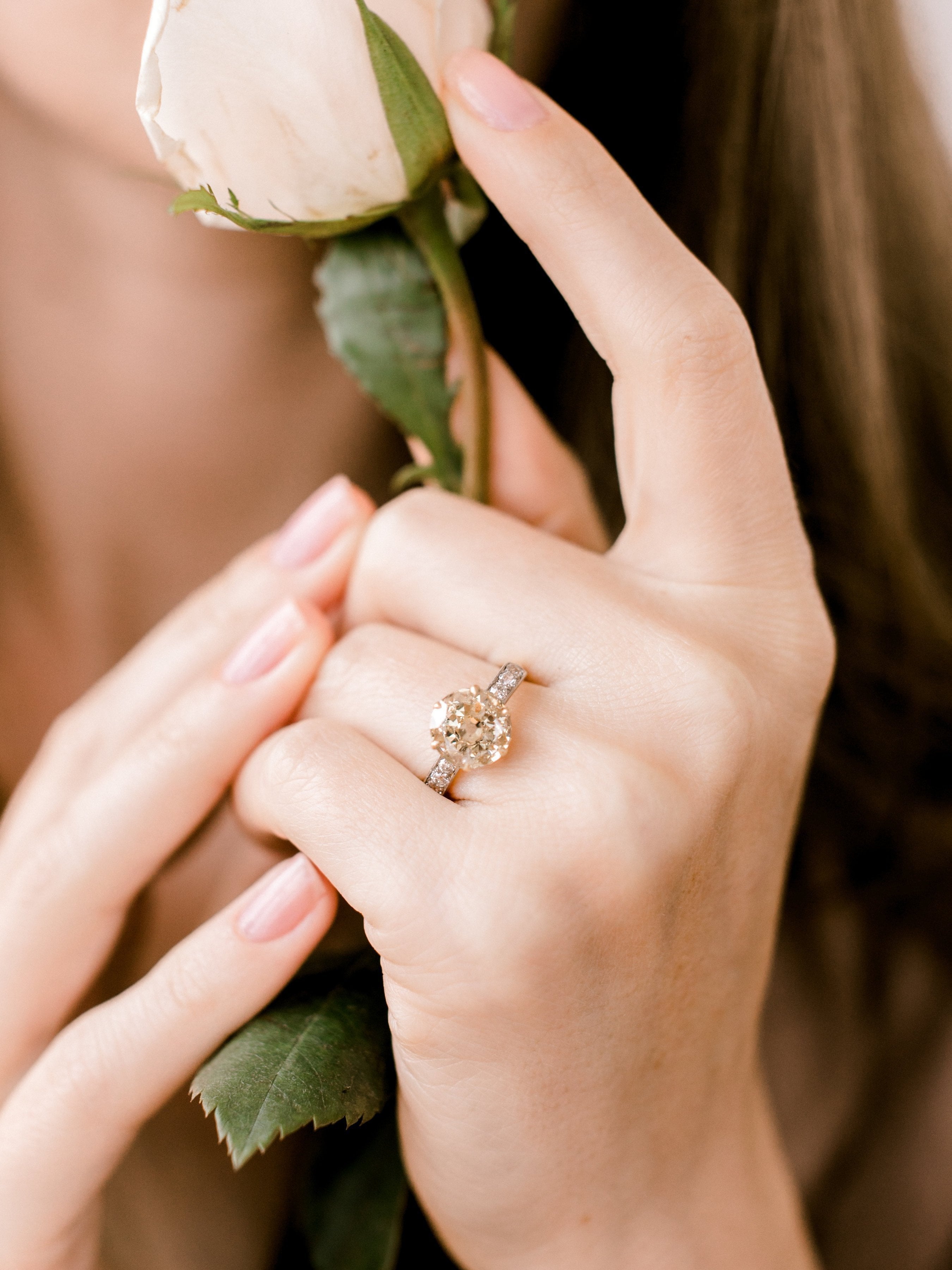 All about the hue of this diamond! A unique golden color that contrasts beautifully with the platinum and white diamonds on the shoulders to really enhance that two-tone look! The ring just hugs the finger perfectly for a very comfortable fit! The ring has a very elegant and glam look to it and pairs well with bands so you can keep it super simple with a gold band or stack it up!