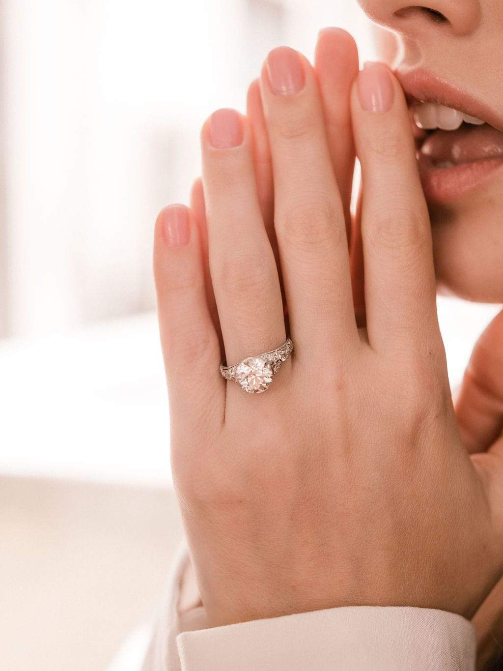 The Sezanne ring is a gorgeous authentic vintage engagement ring from the Edwardian era circa 1915! This Filigree Engagement Ring With Bead Set Side Stones centers a GIA Certified 2.66 carat old European cut diamond of N color, VS1 clarity. The stone is set in a 4-prong platinum setting with filigree details and 18 old European cut diamonds bead-set throughout. Hand engravings decorate the entire ring. The ring is currently size 6.25 and can be resized!