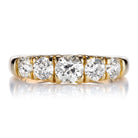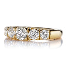 The Nadia Half Hoop 1.31 is an AB original design made right here in NYC. The ring features Five Old European Cut diamonds with the center stone being 0.46 carats and the 4 side diamonds combining for 0.85 carats. All 5 diamonds combine for a total of 1.31 carats of I-J-K color, VS-SI clarity. The stones are set in an 18kt Yellow Gold prong setting. The ring is currently size 5.25 and can be resized!