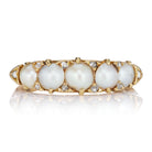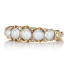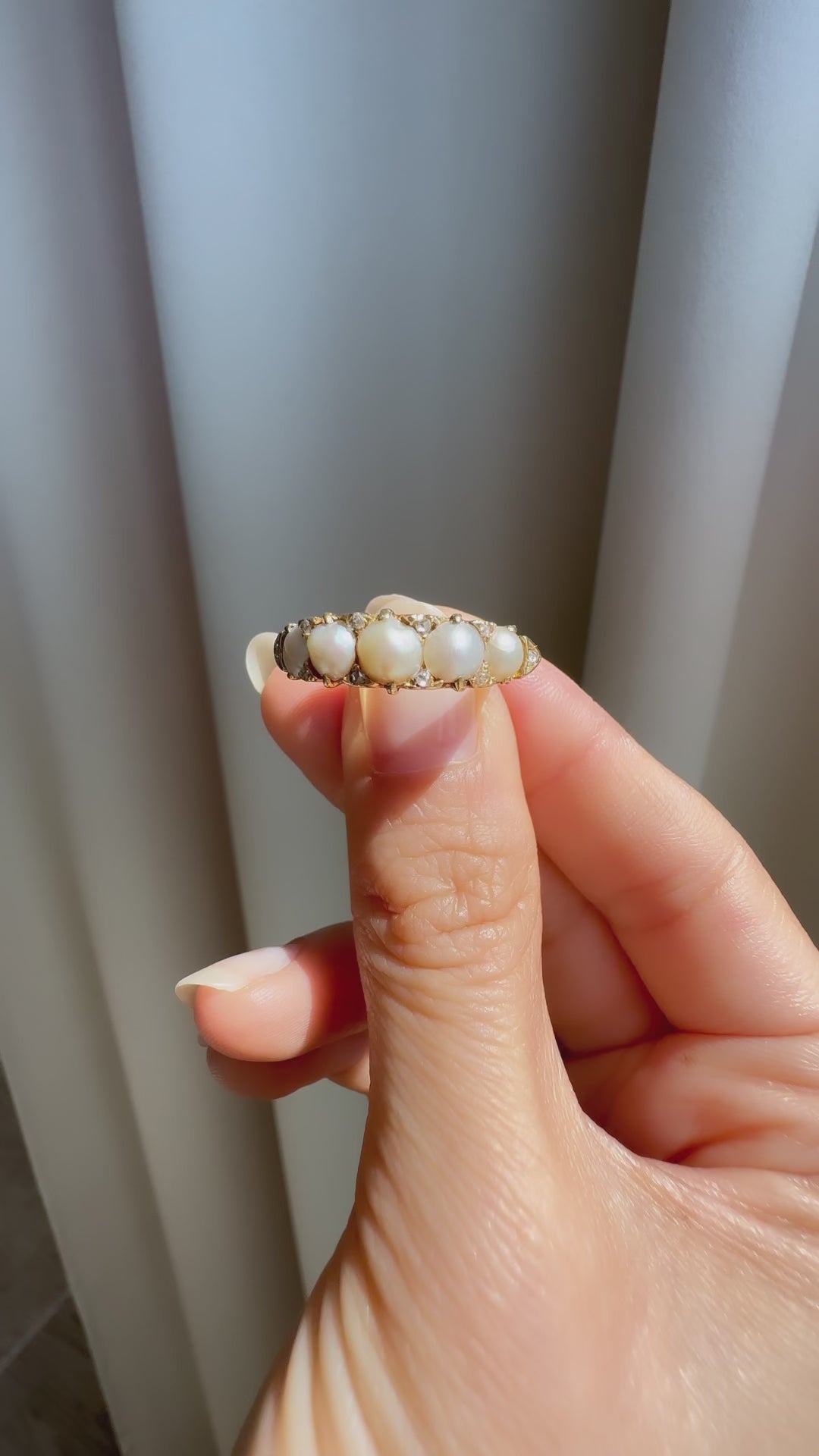 The Cassia ring is an authentic vintage pearl and diamond ring from the Edwaridan Era circa 1900. The ring features five pearls with tiny Rose Cut diamonds between the pearls . The stones are set in an 18kt yellow gold setting. The ring is currently size 6.25+ and can be resized!