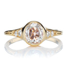 The Rosita 0.82 ring is an AB original design made right here in NYC. The ring centers a GIA-certified 0.82-carat Oval Cut diamond of G color, SI2 clarity. On each shoulder are two Old Cut diamonds of coordinating color and clarity. The stone is set in a bezel setting of our signature 18kt yellow gold. The ring is currently size 5.75 and can be resized!