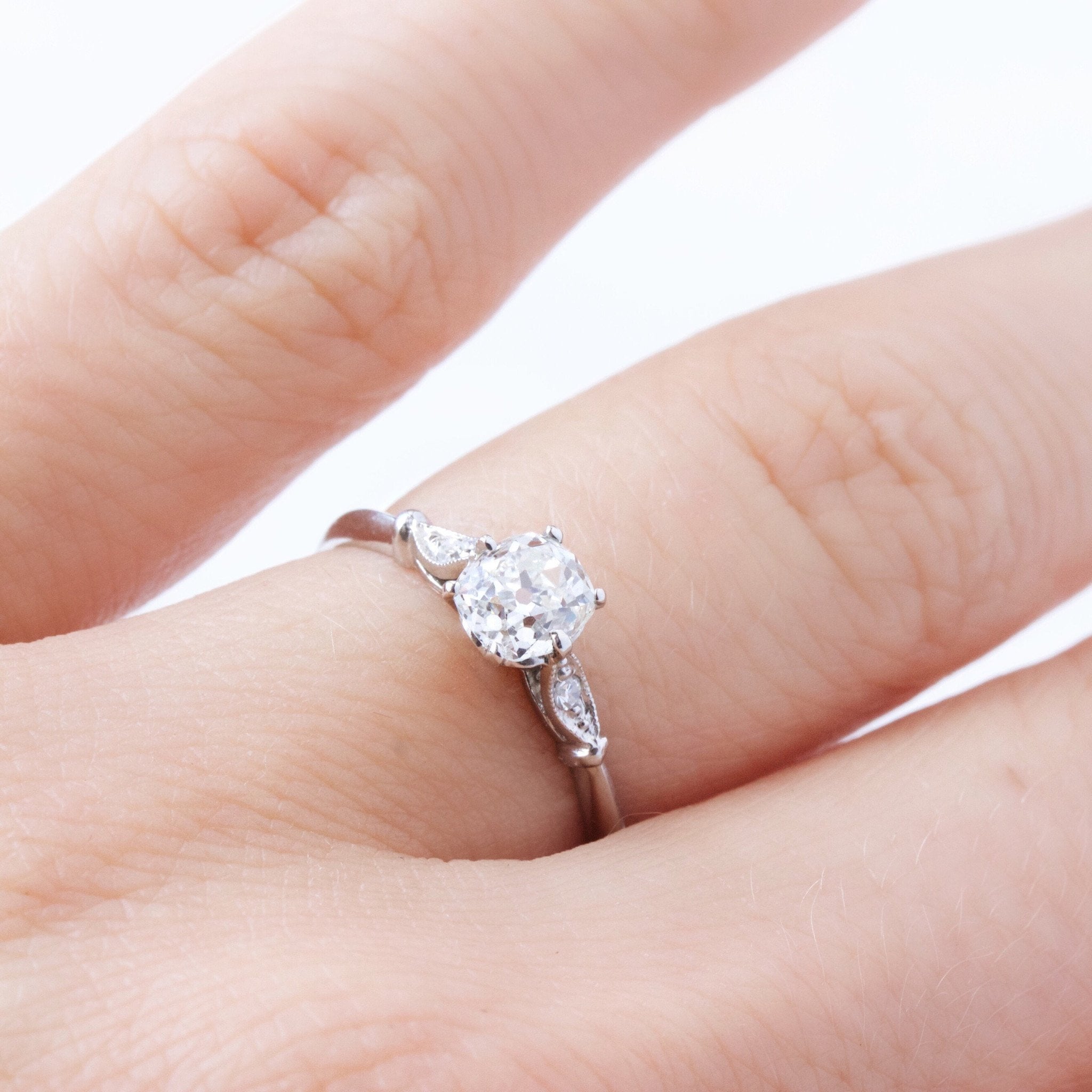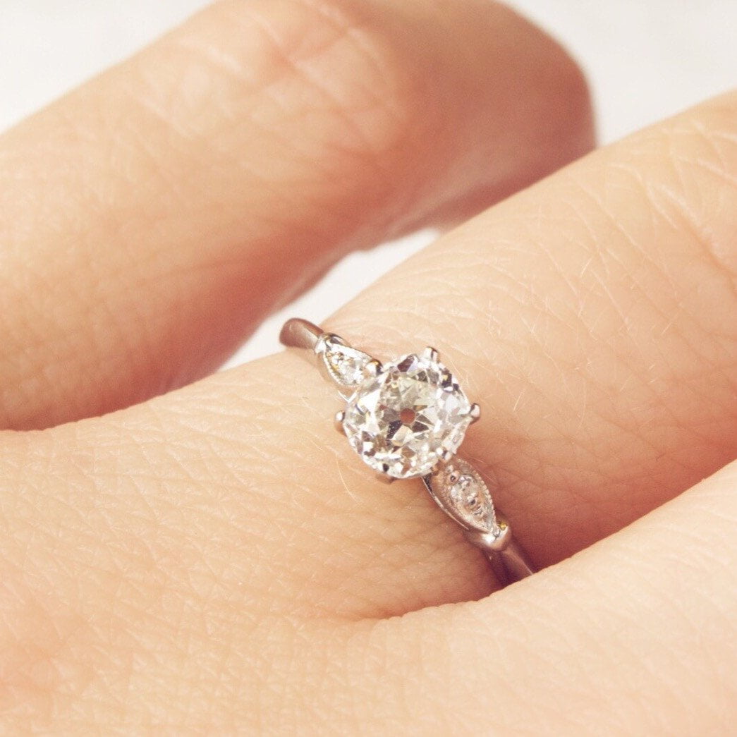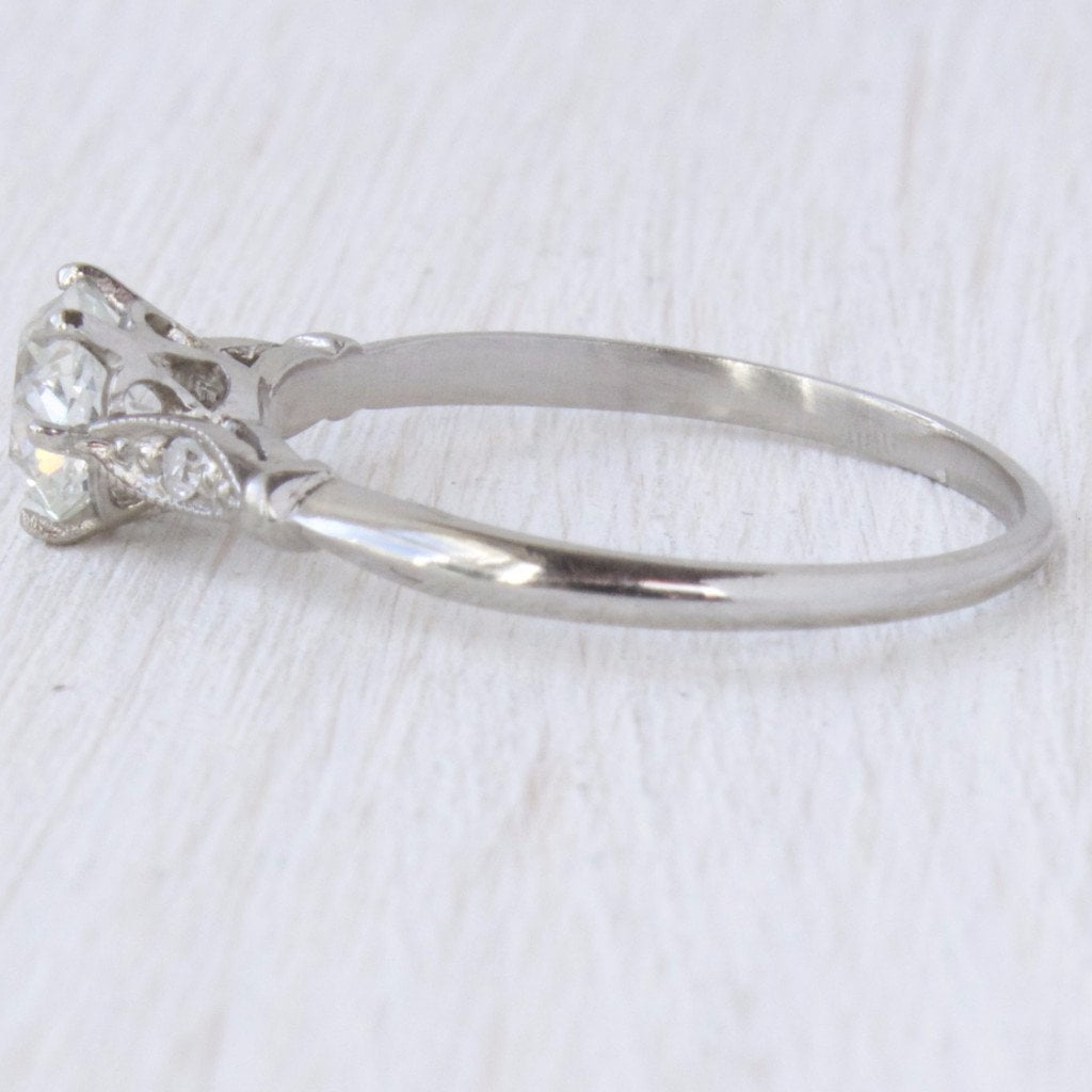 The Fleur Engagement Ring is an example of feminine Edwardian at its best! The ring centers a 0.55 carat Old Mine Cut diamond graded VS2 clarity and H-I color. The diamond is set in a six prong platinum setting with with a single cut diamond to each side. The side stones are set in petal-like shaped settings that give the ring a very floral look! The ring is size 5.5 and can be resized to fit.