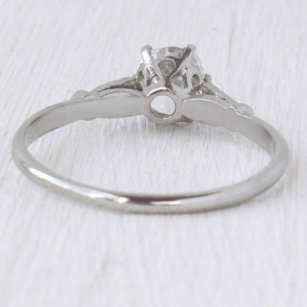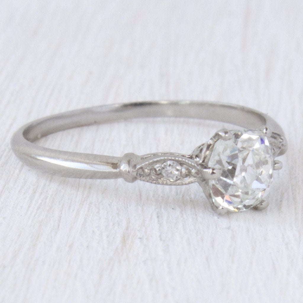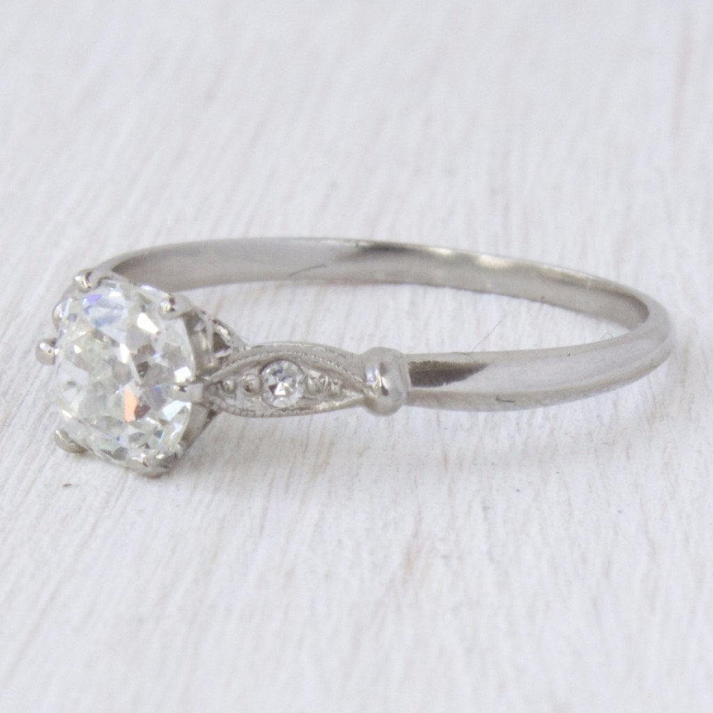 The Fleur Engagement Ring is an example of feminine Edwardian at its best! The ring centers a 0.55 carat Old Mine Cut diamond graded VS2 clarity and H-I color. The diamond is set in a six prong platinum setting with with a single cut diamond to each side. The side stones are set in petal-like shaped settings that give the ring a very floral look! The ring is size 5.5 and can be resized to fit.