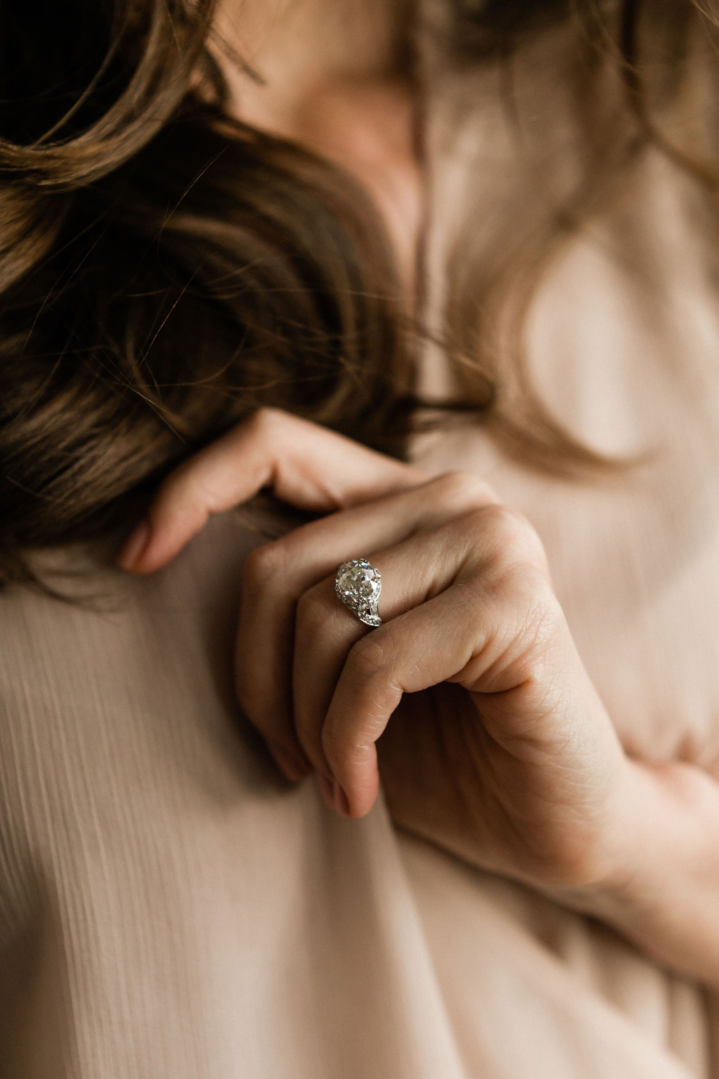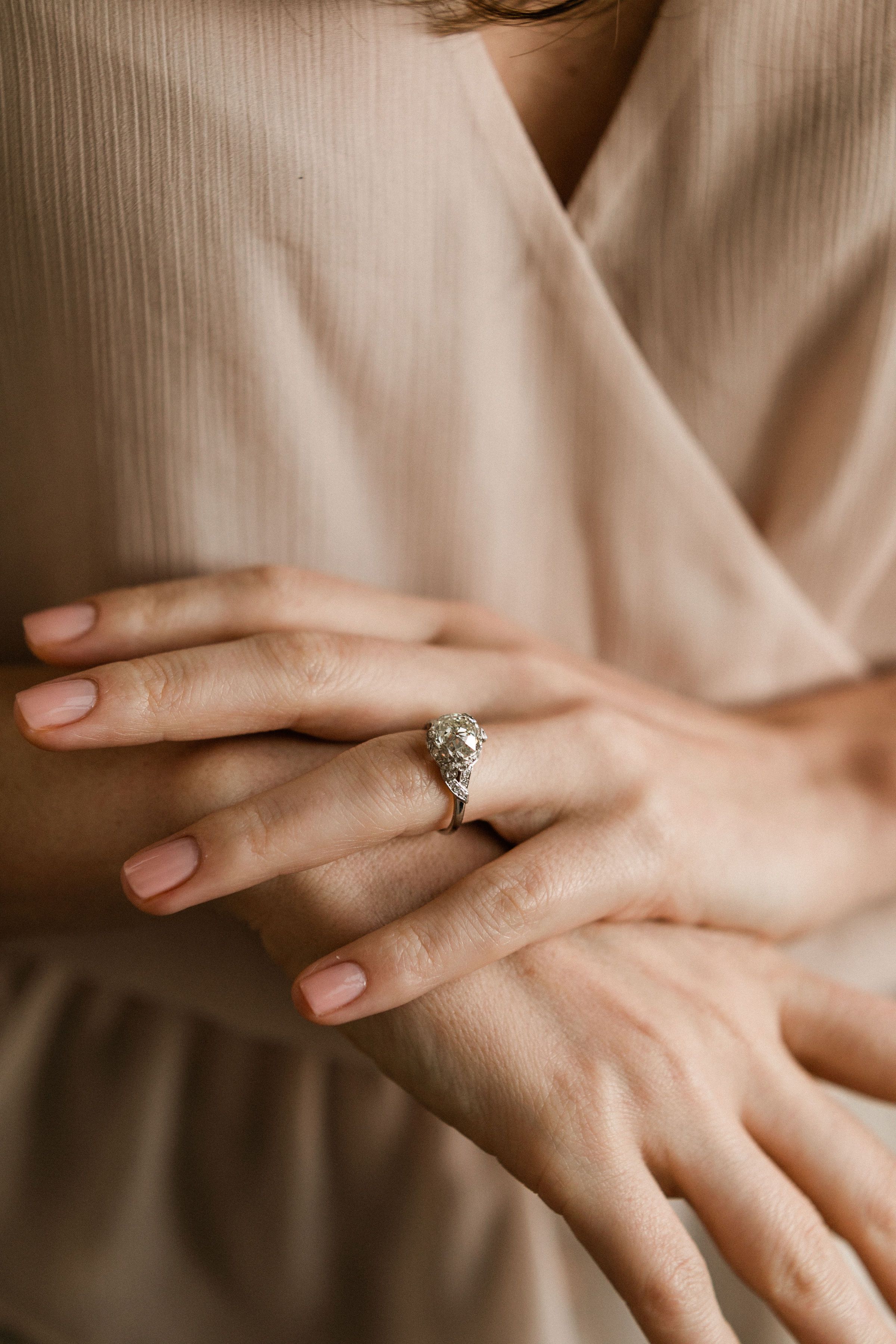 The Rose ring is an authentic Vintage piece from the Edwardian Era circa 1915! This floral inspired engagement ring centers a GIA Certified 2.85 carat old European cut diamond of K color, VS2 clarity. The diamond is set in this beautiful platinum setting with very floral inspiration and prongs that wrap the diamond. Thirty-two small diamonds are set in the shoulders and prongs, all combining for approximately 0.25 carats. The ring is size 6.5 and can be resized!