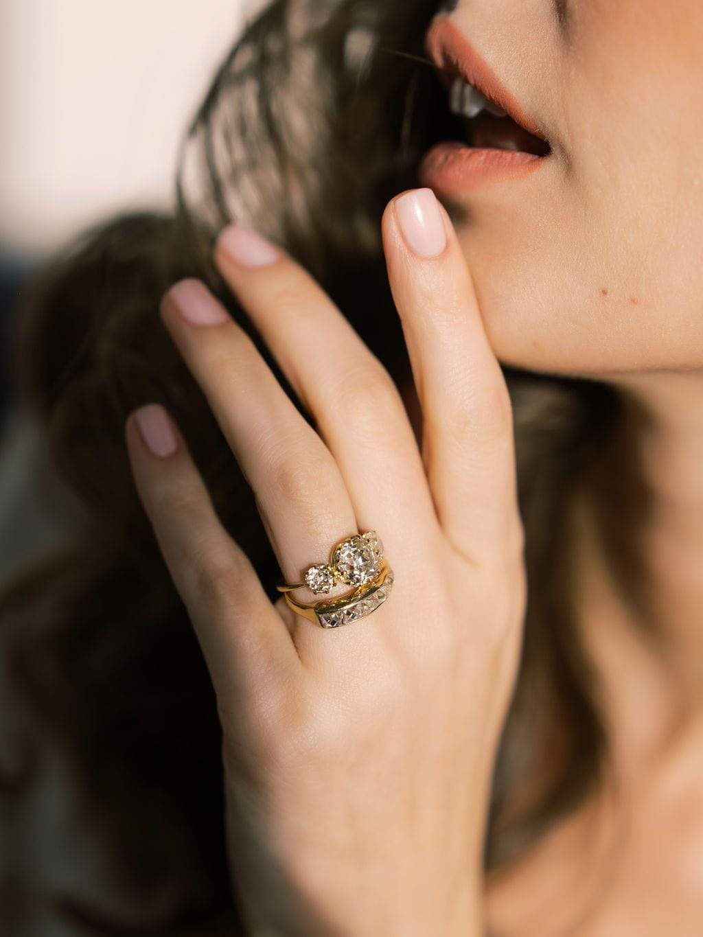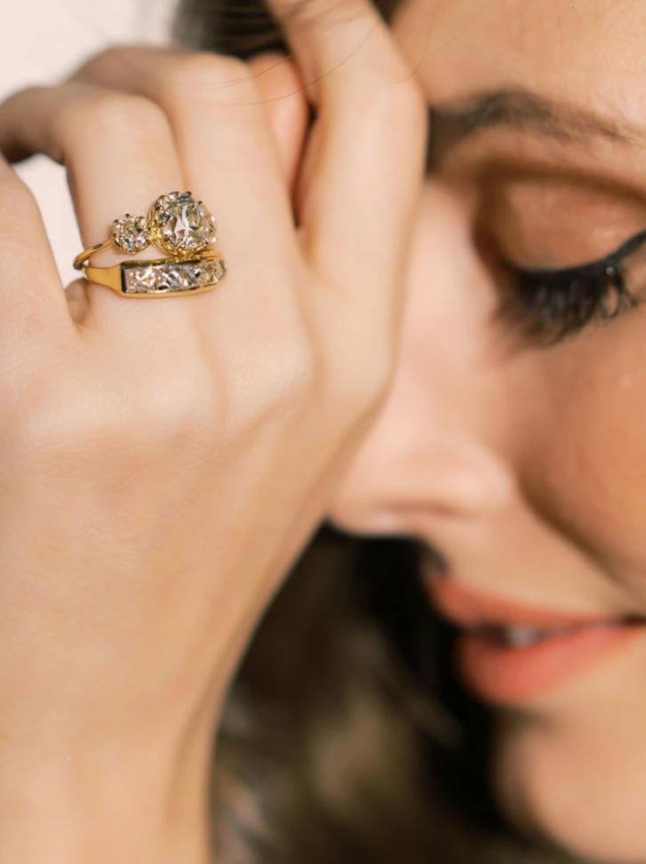 The Duchess 2.11 ring is a VB-made French cut diamond band engagement ring. The ring has 5 French cut diamonds of approximately G-H color, VS clarity. The diamonds are channel-set in an 18kt yellow gold setting and combine for 2.11 carats. T. The ring is currently size 5.75+ and can be resized!