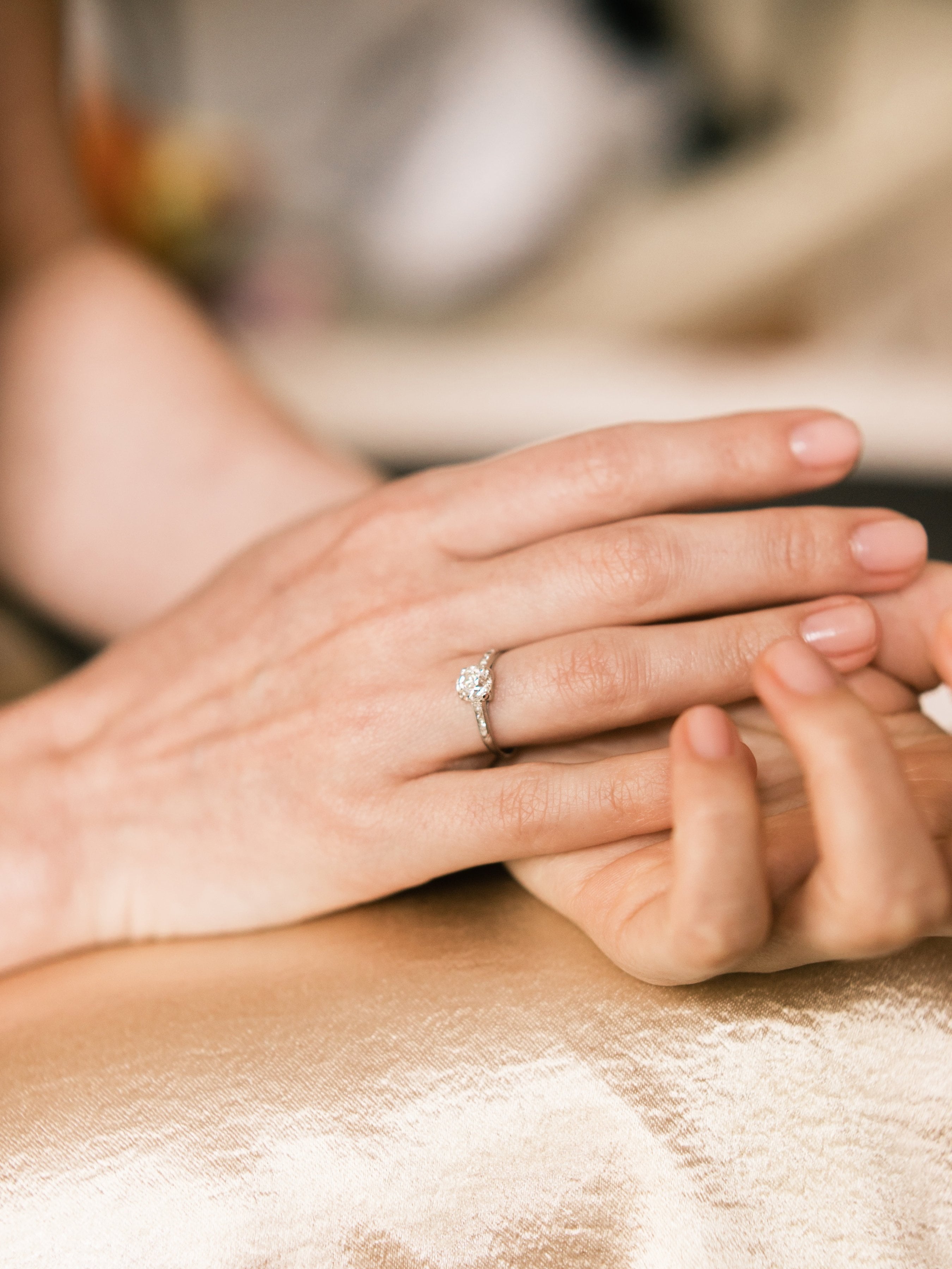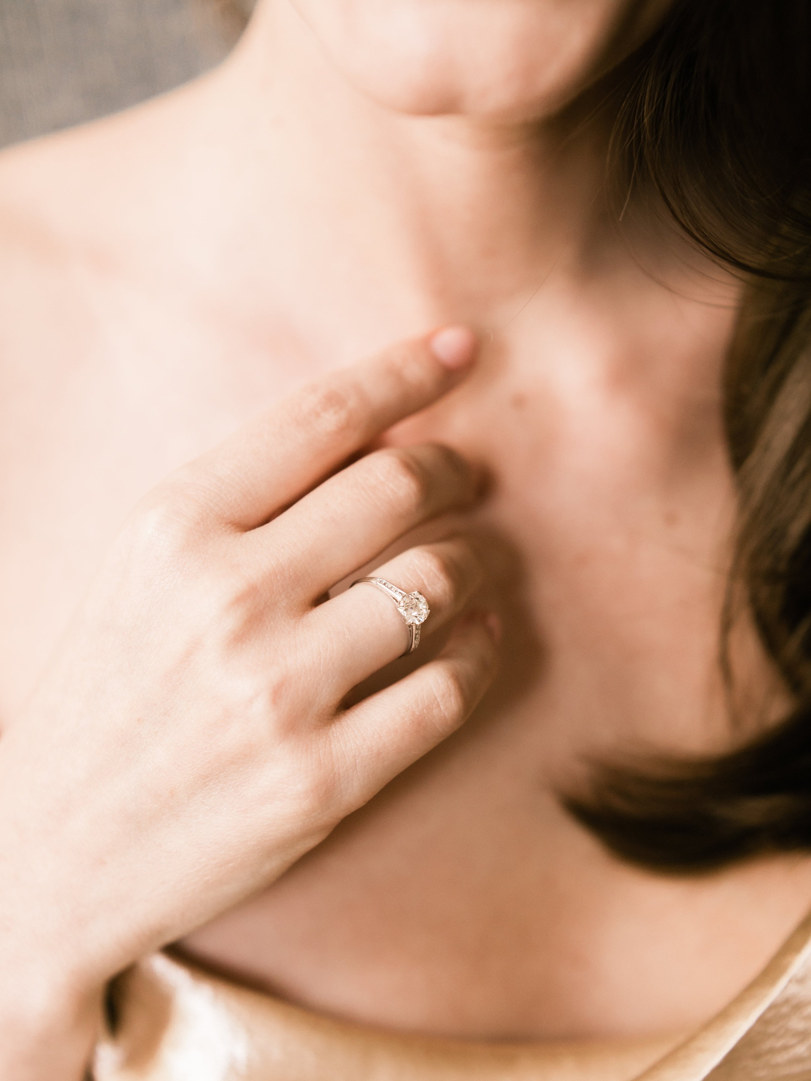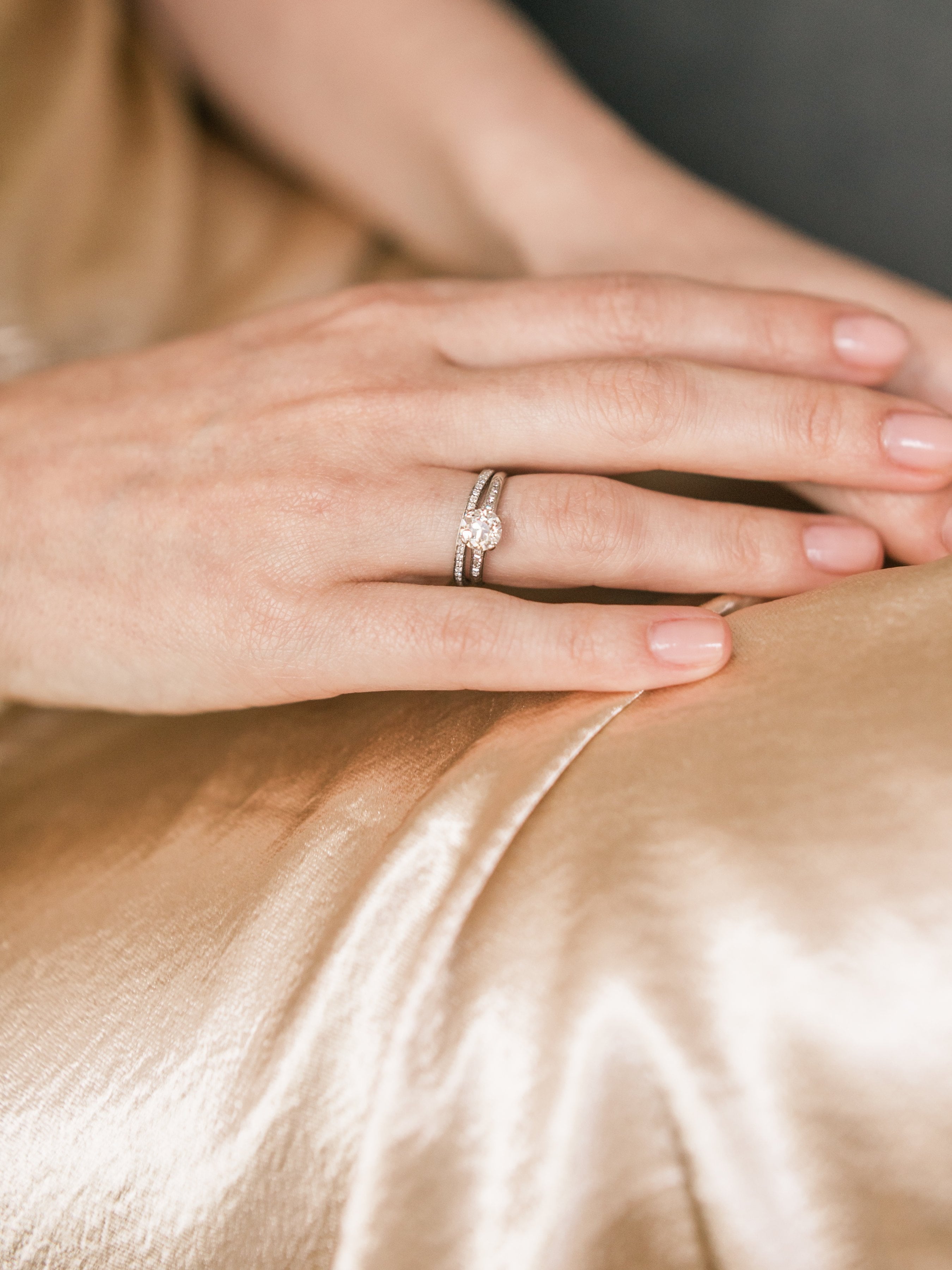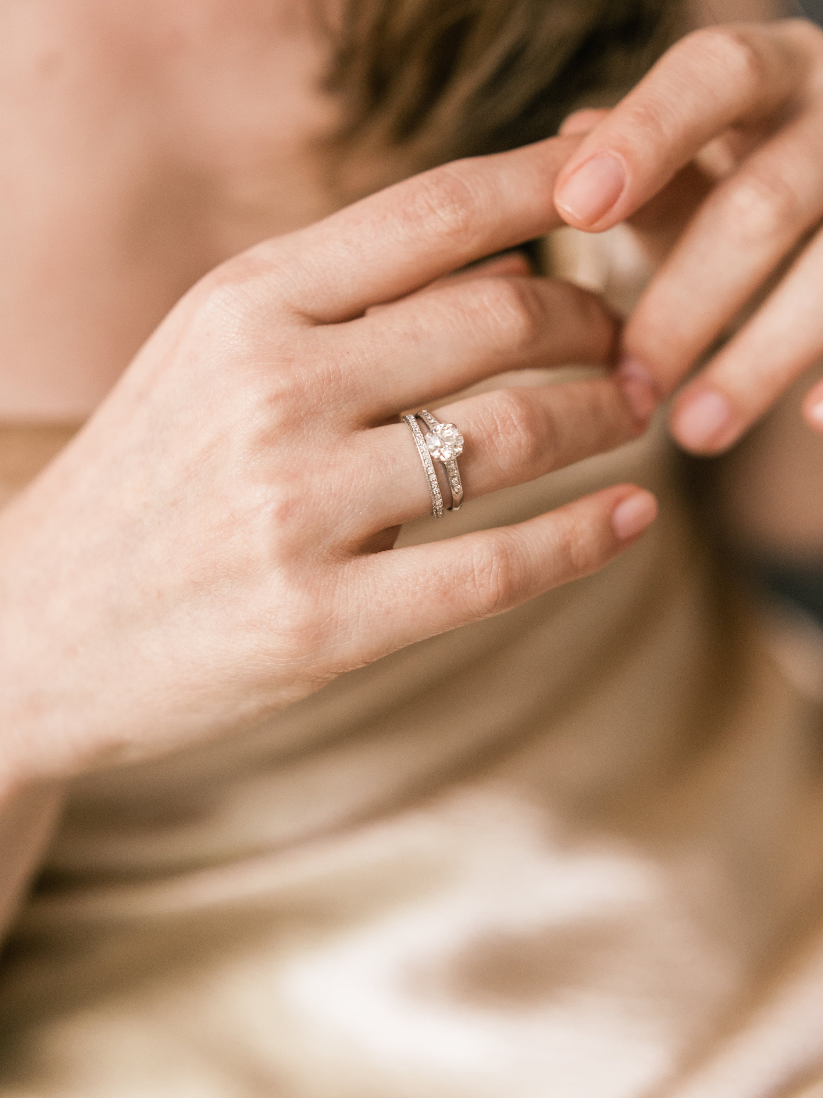 This ring is a classic beauty with the added touch of perfect French cut diamonds! Dainty and incredibly sparkly, this ring pairs easily with bands!