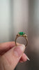 This center stone is a delightful chubby shape with a glowing emerald green color. The antique side diamonds offer a beautiful shimmer.