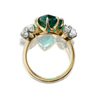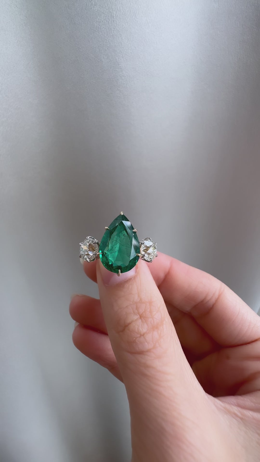 The Marielle 5.84 ring is an AB original design made right here in NYC. The ring centers a C. Dunaigre-certified 5.84-carat Pear Cut Zambian emerald with minor clarity enhancement. On one side of the emerald is a GIA-certified 1.00ct Old European Cut diamond of M color, VS2 clarity. On the other side is a GIA-certified 1.02 carat Old European Cut diamond of M color, VS2 clarity. The stones are set in a two-tone 18kt yellow gold and platinum setting. The ring is currently size 6 and can be resized!