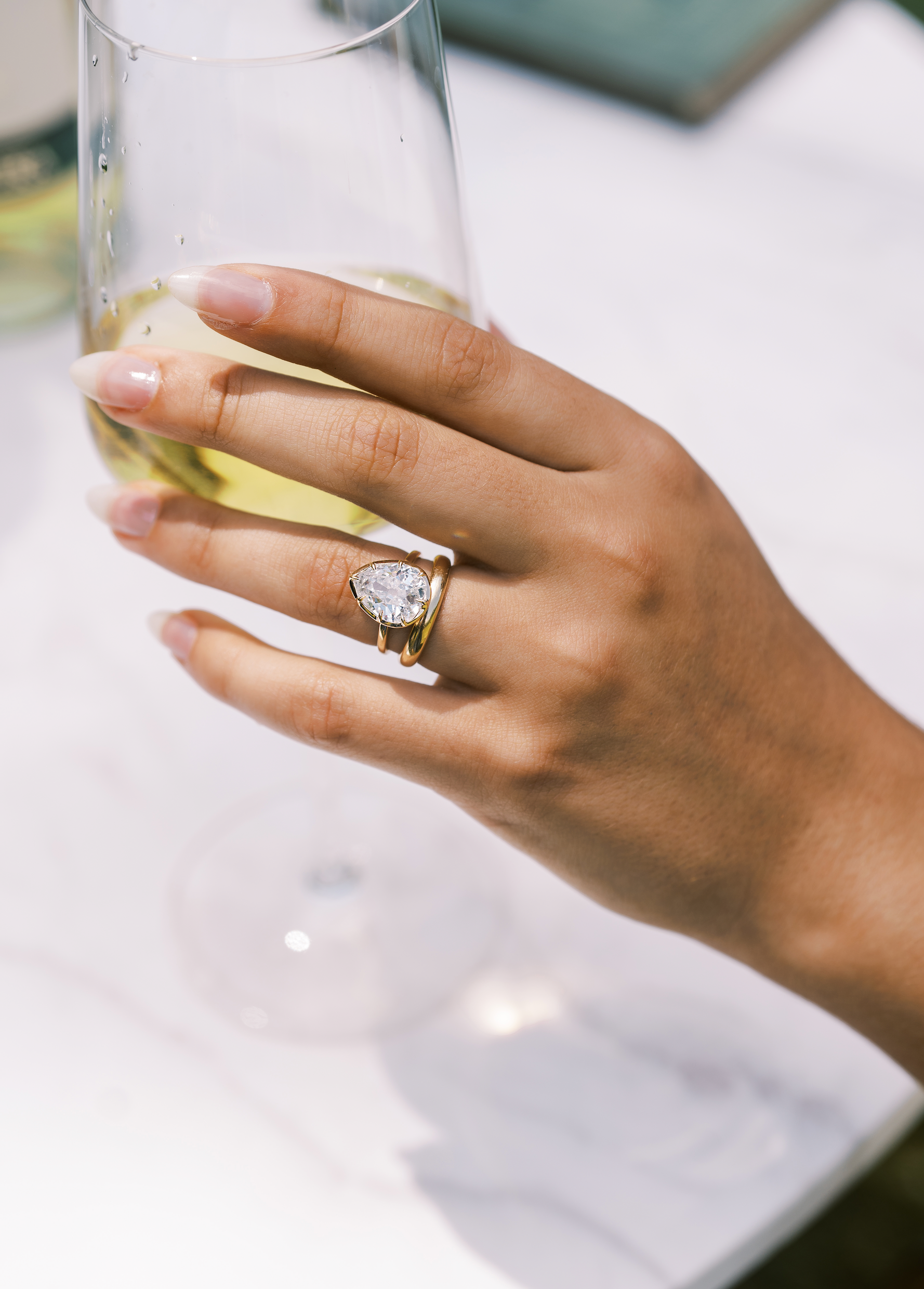 The Allie 3.91 ring is a VB original design made right here in NYC. The ring centers a GIA-certified 3.91-carat pear cut diamond of K color, SI2 clarity. The stone is collet-set in an 18kt yellow gold setting. The ring is currently size 6 and can be resized!