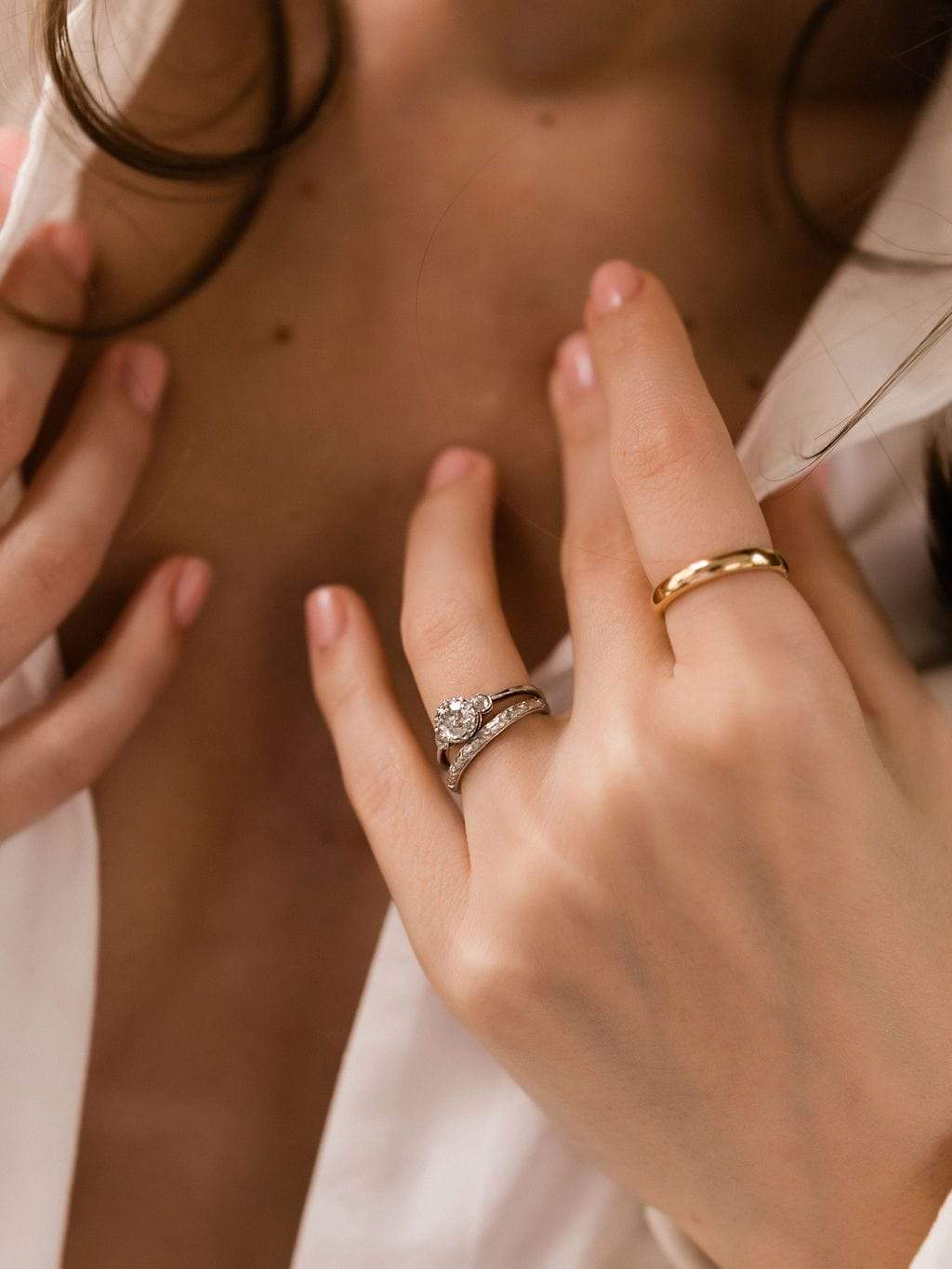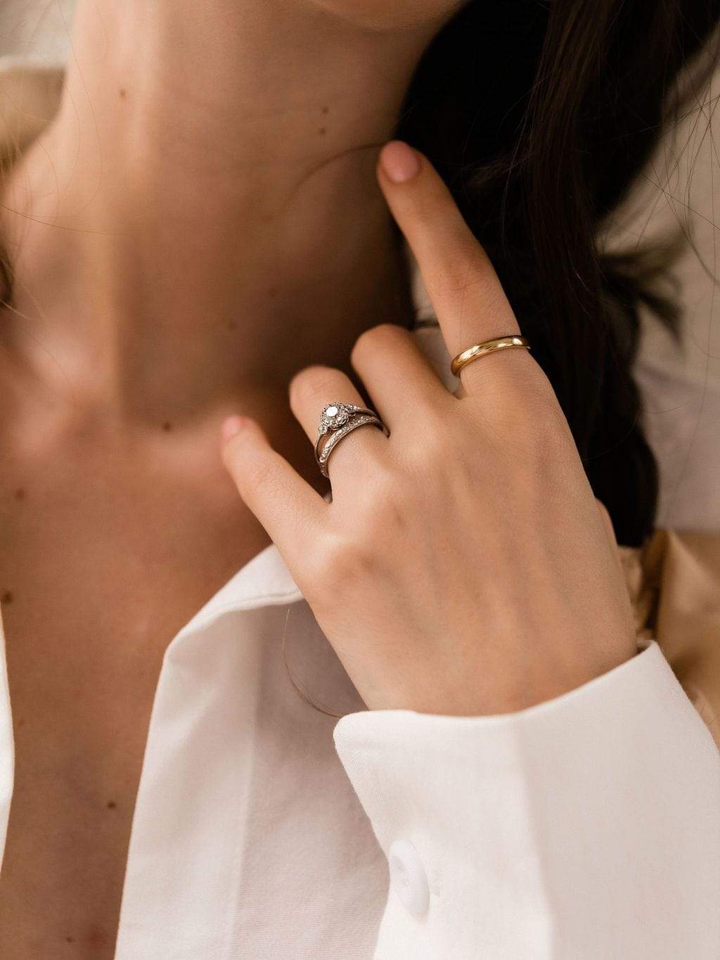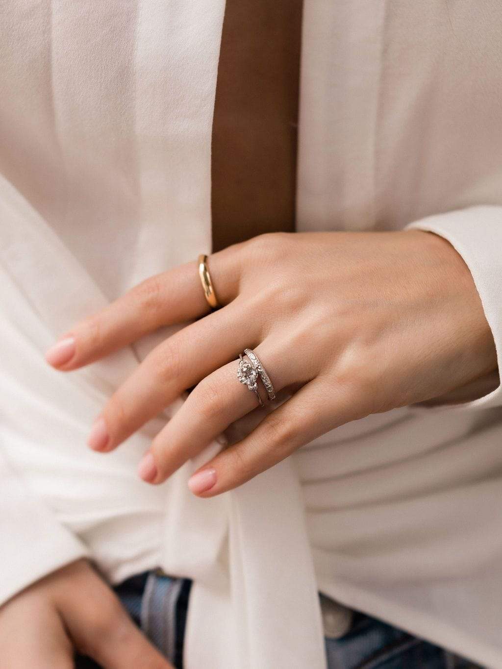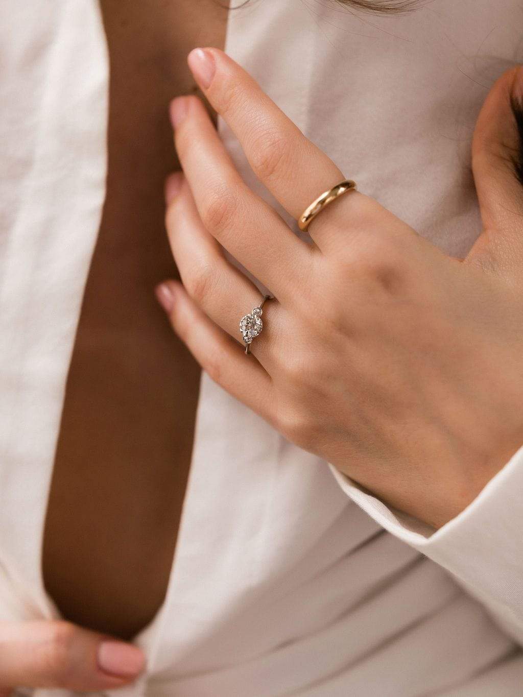 Sleek, minimal, and unique with the fun grey color that contrasts against the white side stones but still blends with the cool color themes in the ring!