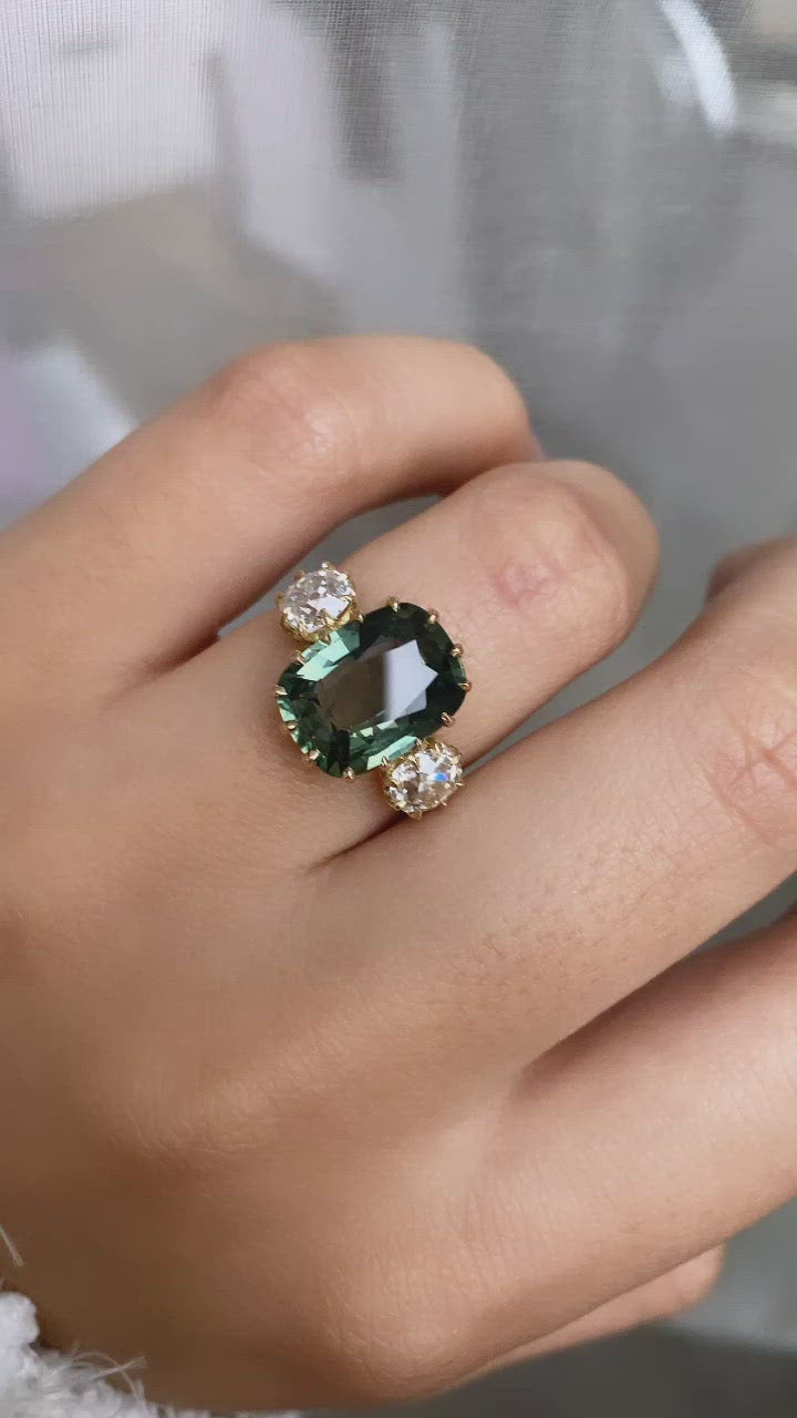 The Mallory 5.59 ring is a VB original design made right here in NYC! The ring centers a GIA certified 5.59-carat no-heat Natural Green Sapphire. An old mine cut diamond is set to either side of the sapphire, both combining for 1.34 carats of J-K color, VS clarity. The stones are set in an 18 karat yellow gold setting. The ring is currently size 6 and can be resized!