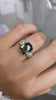 We are enamored with this stone's beautiful olive hues. The perfect neutral green color that pairs perfectly with our beautiful 18kt yellow gold and the delightful shimmer of the antique diamonds. It has great vertical and horizontal finger coverage and is just such a stunning piece that you have to see in person to fully appreciate.