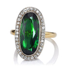The Ceyda ring is an authentic vintage tourmaline and diamond ring from the Edwardian Era circa 1910. The ring centers a GIA-certified approximately 3.5-carat Oval cut green tourmaline. The center stone is surrounded by a halo of 36 single cut diamonds of approximately H-I color and VS-SI clarity, totaling approximately 0.36 carats. The stones are set in a platinum and 18kt yellow gold two-tone setting. The ring is currently size 6 and can be resized!